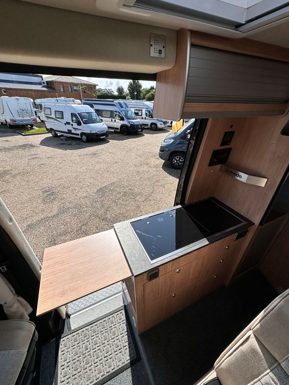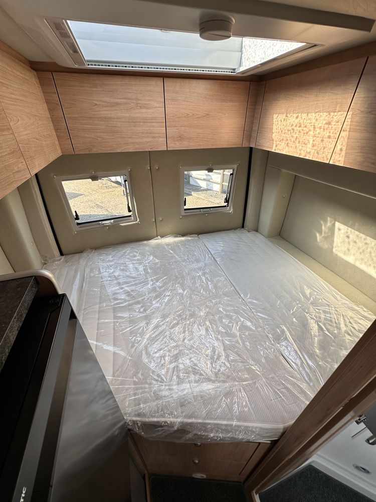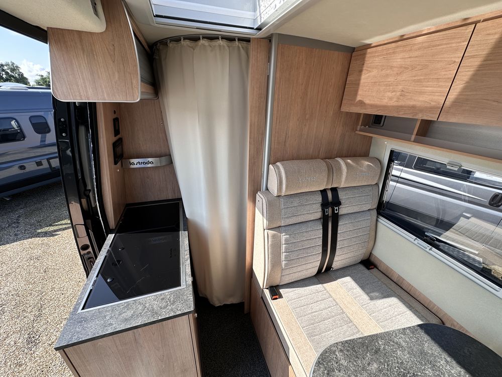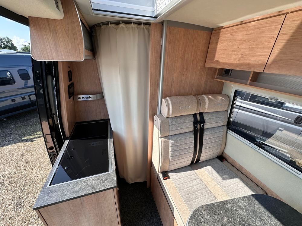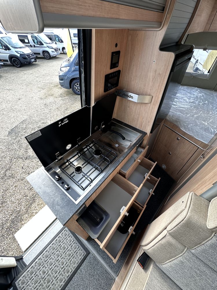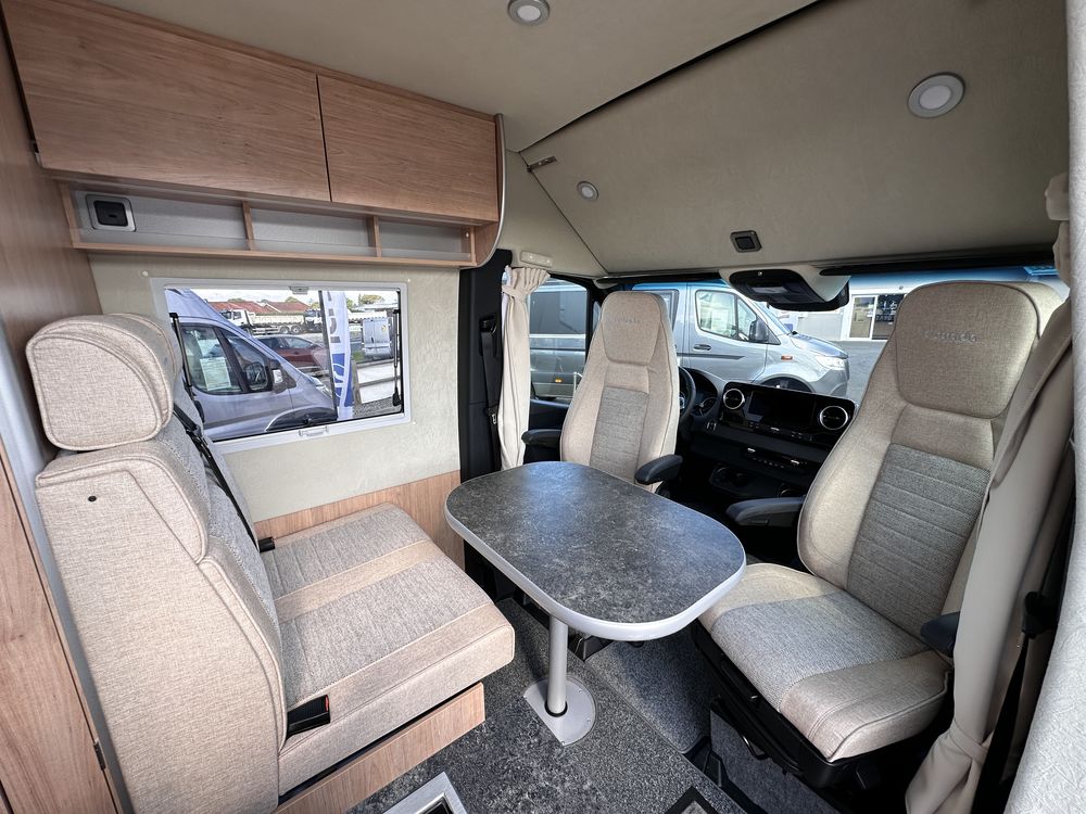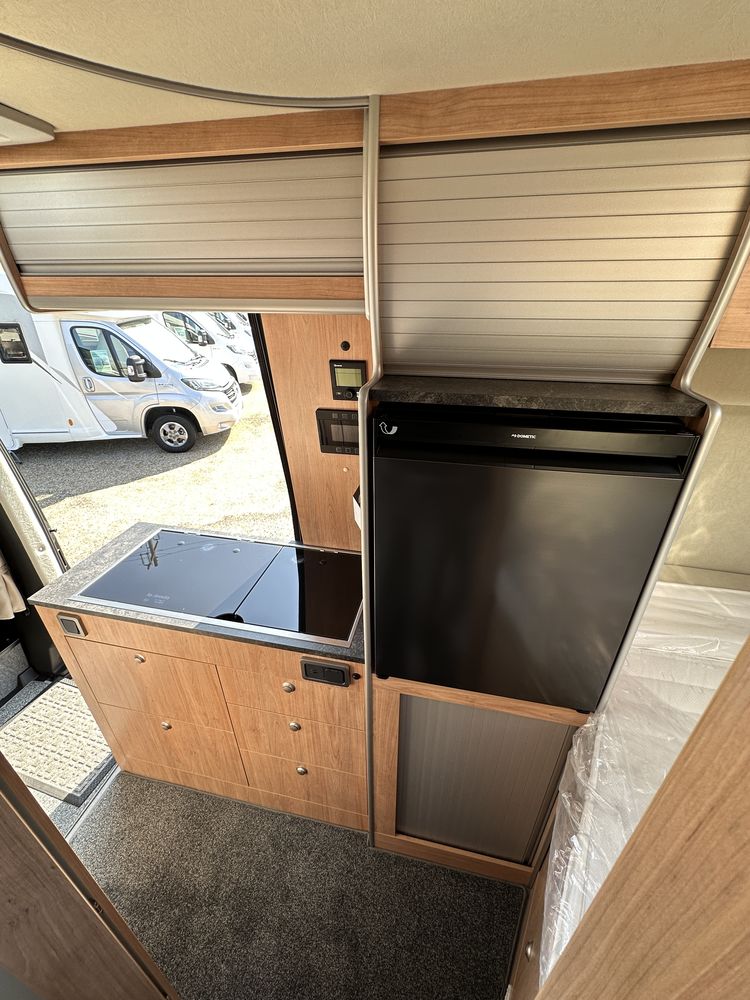 Profitez d'un lit transversal sur soute, d'une salle de bain avec douche intégrée, et d'une cuisine droite équipée avec plan de travail amovible. Le salon avant et ses sièges pivotants créent un espace convivial et modulable.
