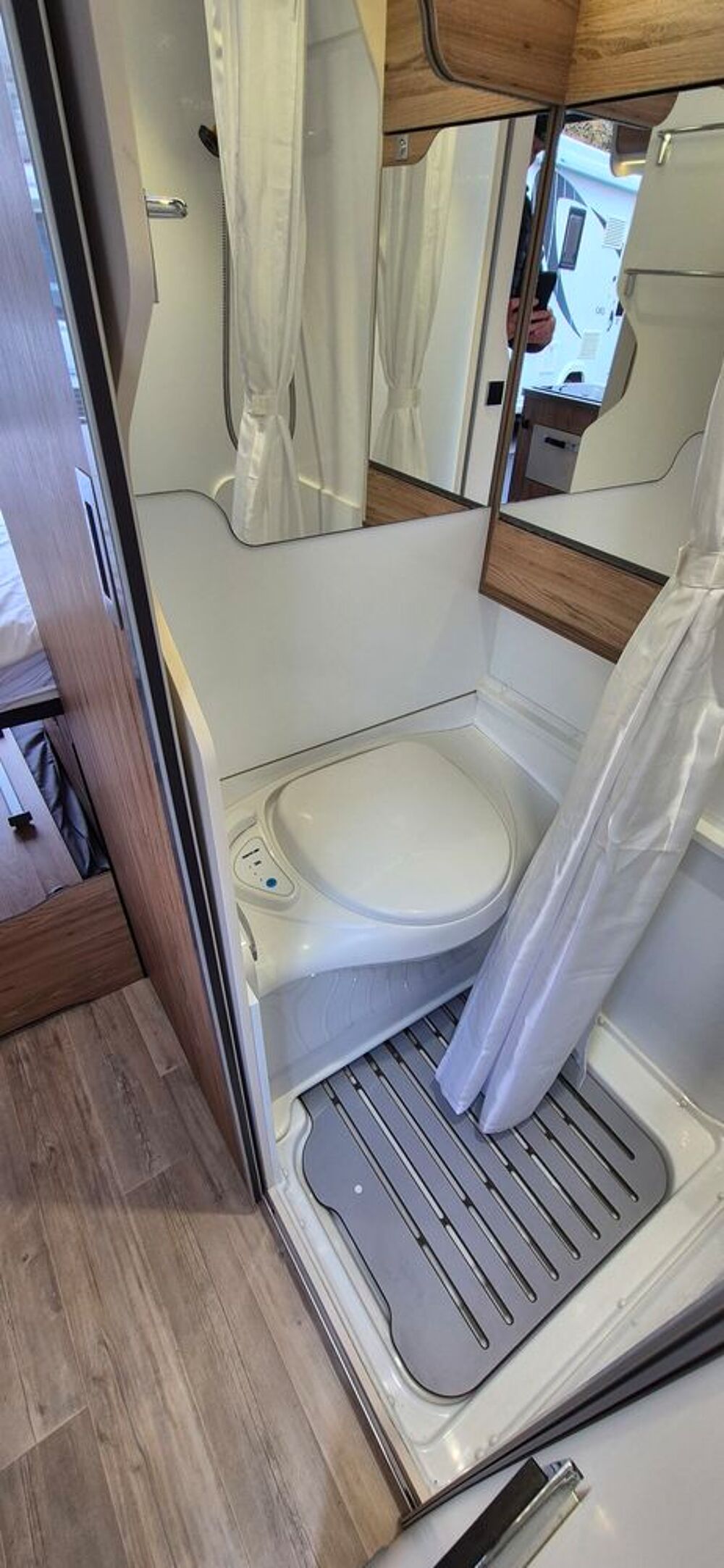 Toilette: lavabo, receveur de douche, rideau, W.-C. orientable, rangements, miroir, accessoires.
