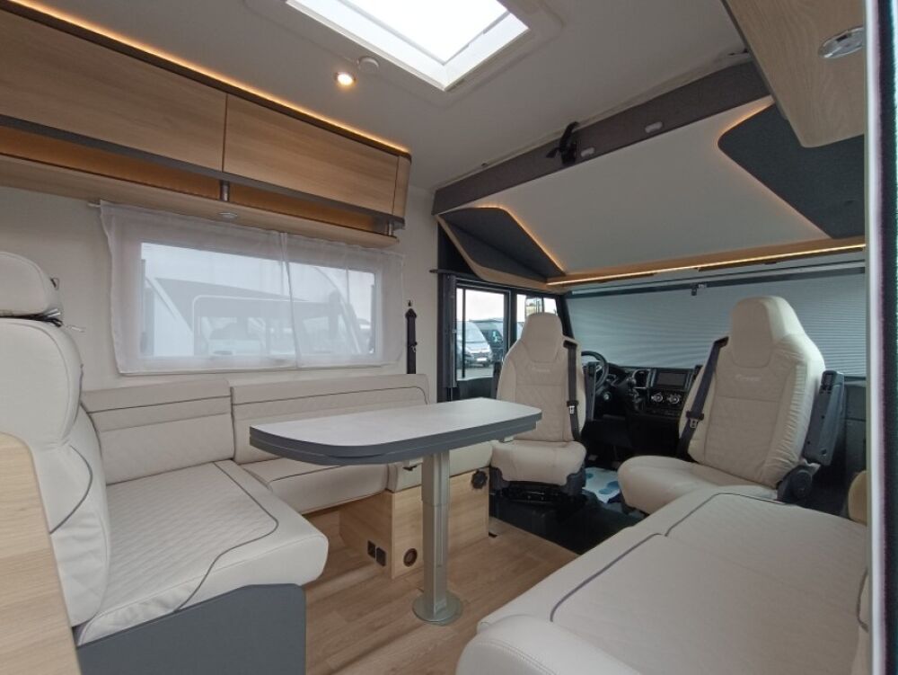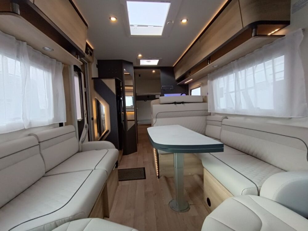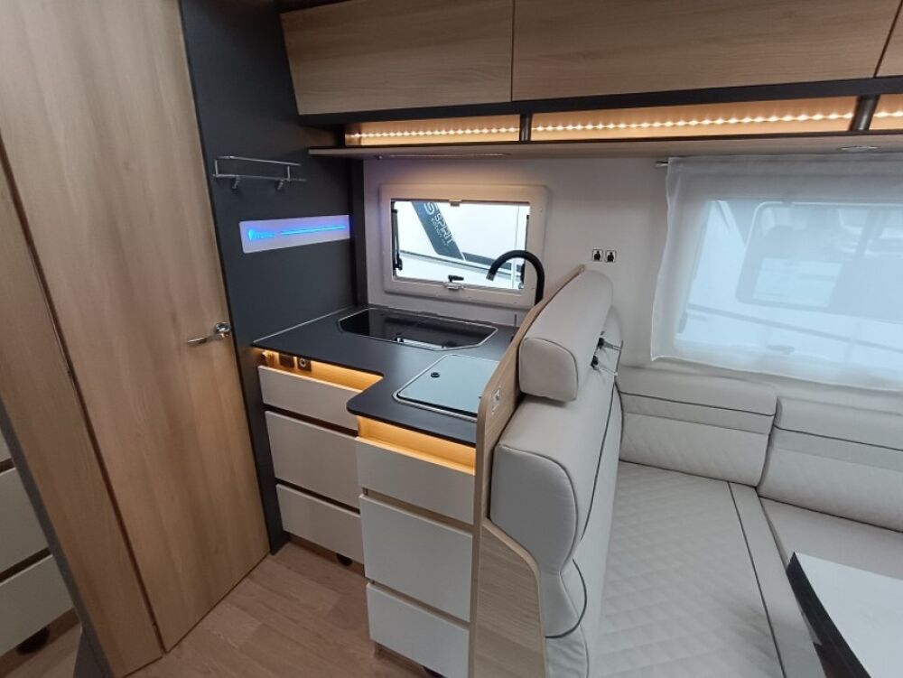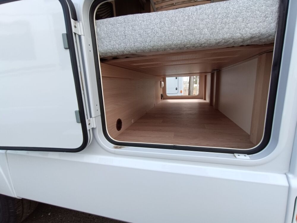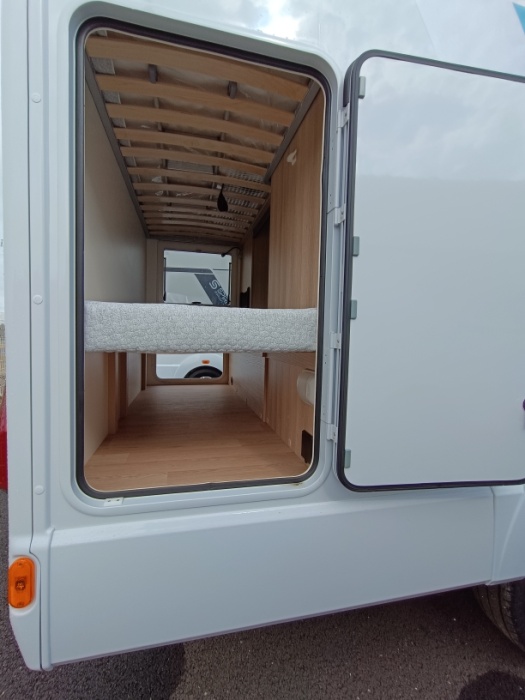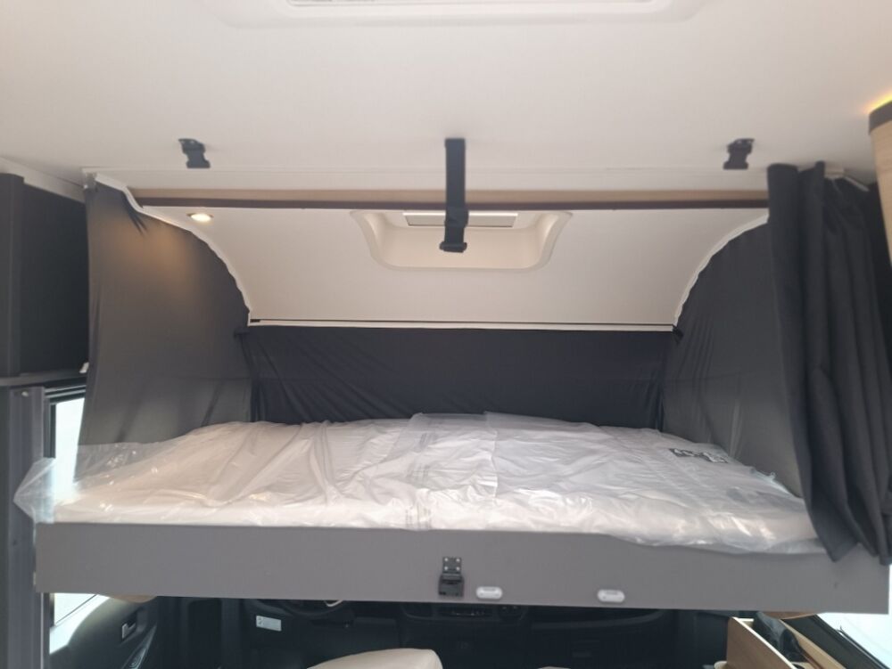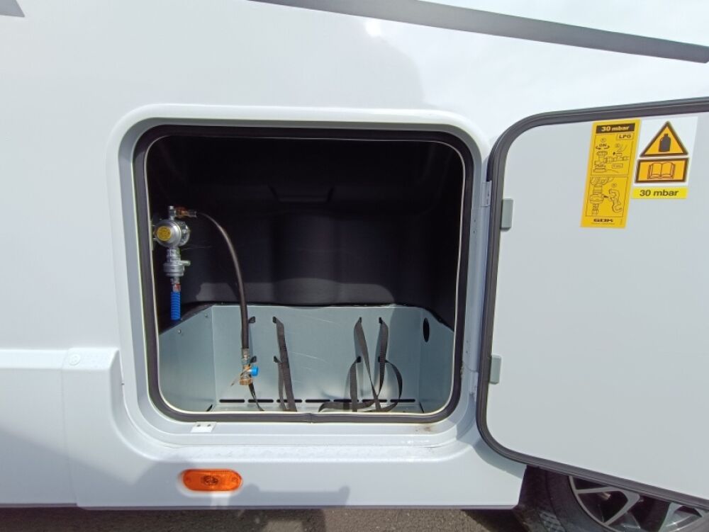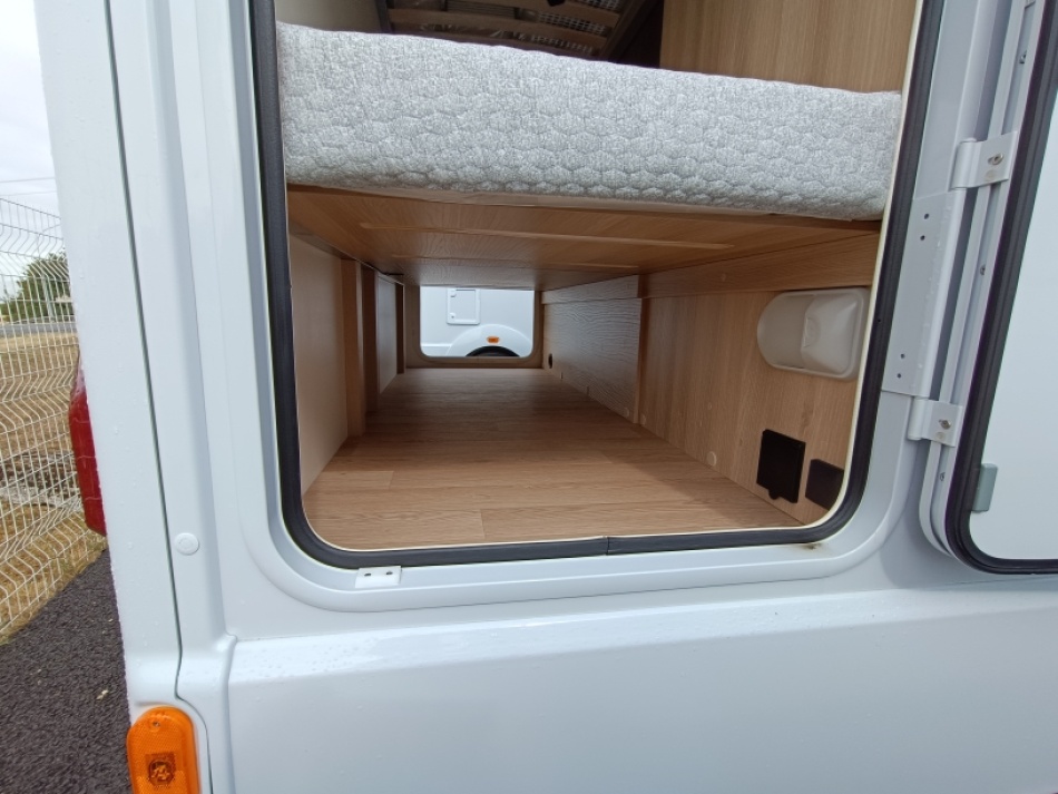 Options inclus :Tissu macadamia, réservoir eaux usées chaufé, tiroir extérieur, portillon de soute supplémentaire, kit lino, douchette extérieur...