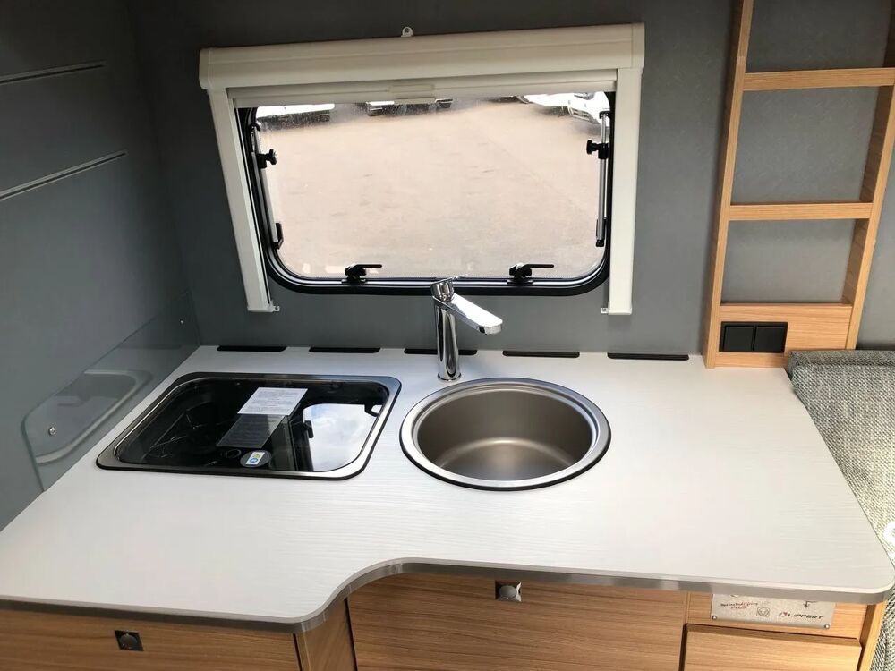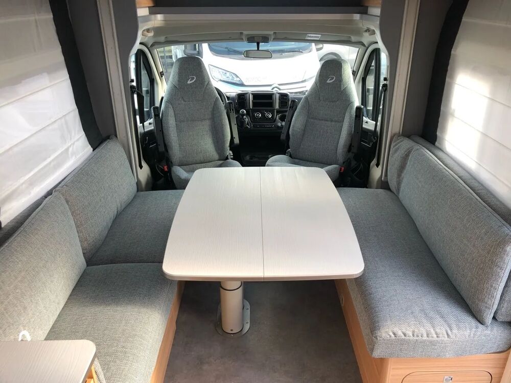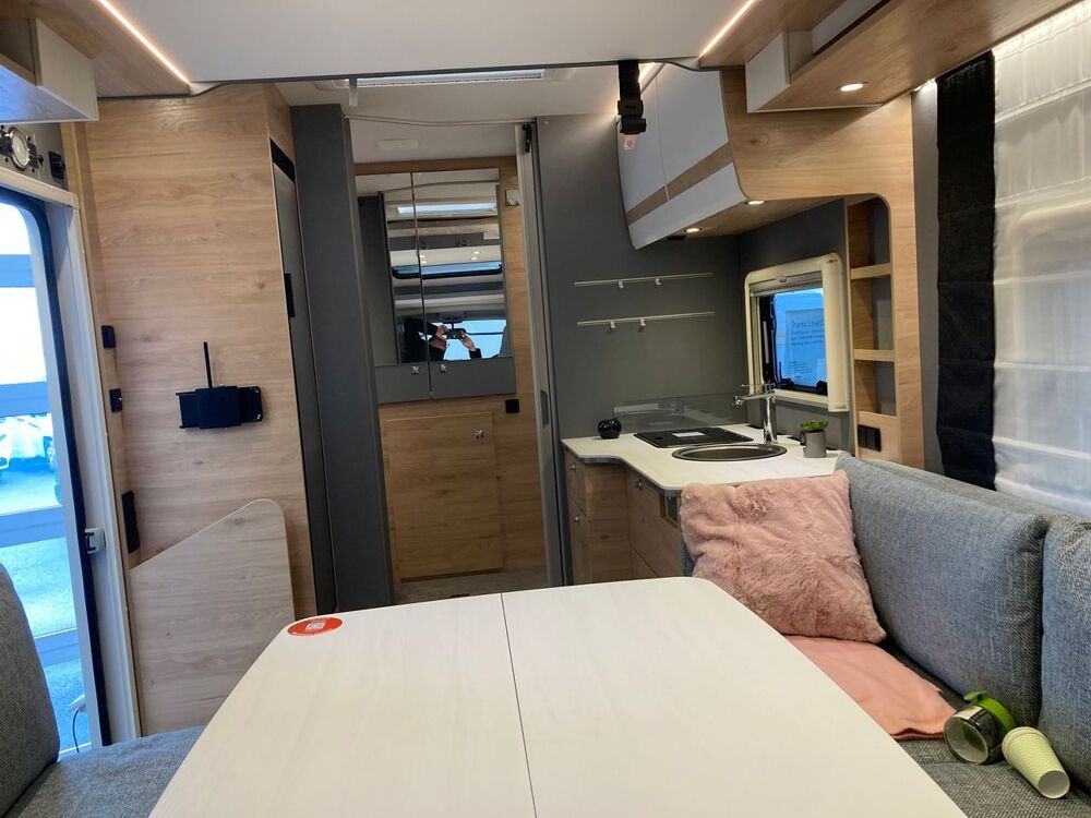 Dans l'habitacle du profilé, un grand salon donnant sur un canapé de 170 cm et 130 cm, transformable en un lit transversal (en option, un lit de pavillon double électrique est proposé) et une grande table pliante et rabattable (110 x 86 cm). Côté cuisine, de 120 cm de large, on apprécie le très grand plan de travail, l'évier rond et profond mais également, évidemment, la plaque de cuisson deux feux et le réfrigérateur de 142l. Les rangements sont aussi présents, avec 4 tiroirs, 2 portes, 1 poubelle intégrée, 1 rail Multiflex et 1 large support à épices.