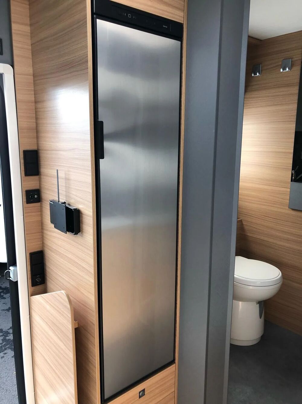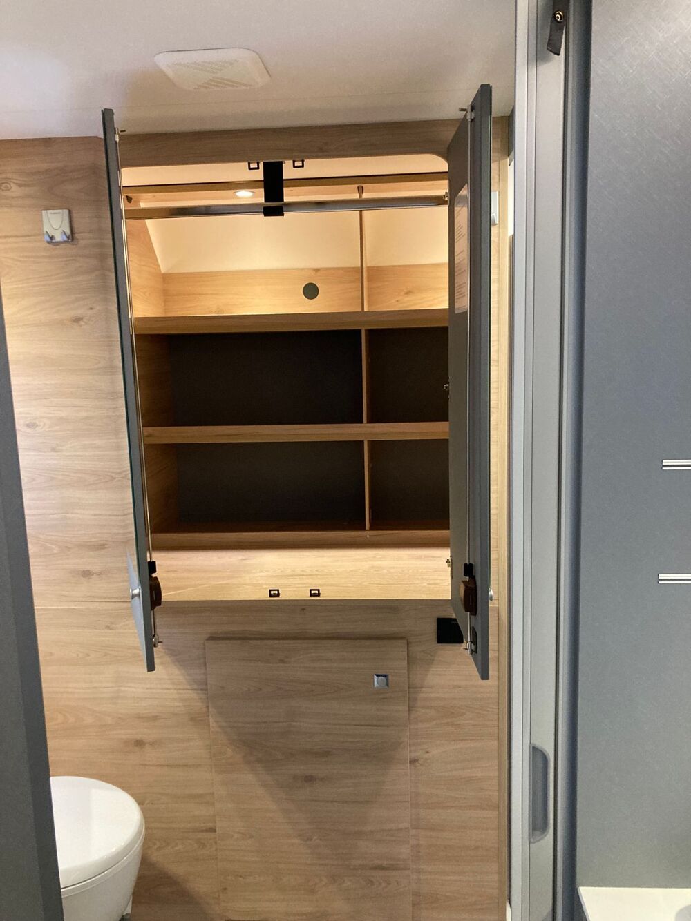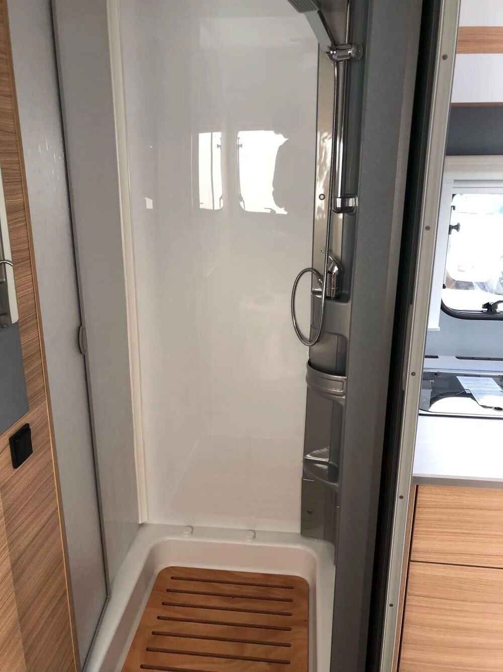La partie salle de bains, séparée du séjour par un volet roulant, comprend elle un caillebotis, des WC (facilement séparables de la douche), une douche de plain-pied réglable en hauteur, une armoire attenante avec étagères et tringle à vêtements et un accès direct au garage arrière.