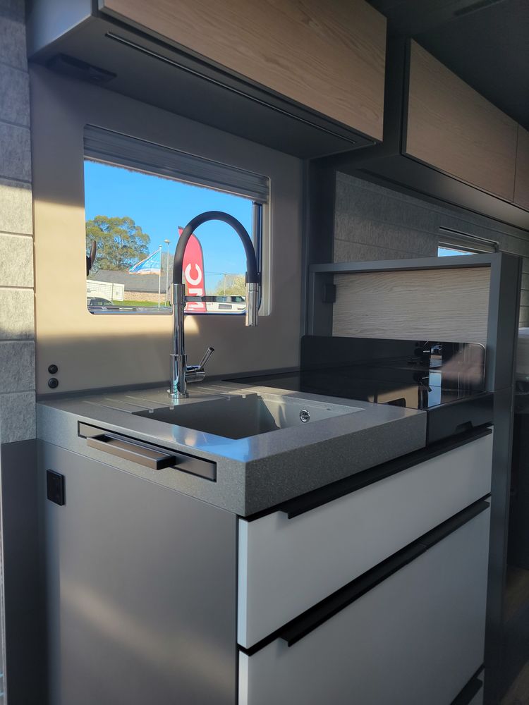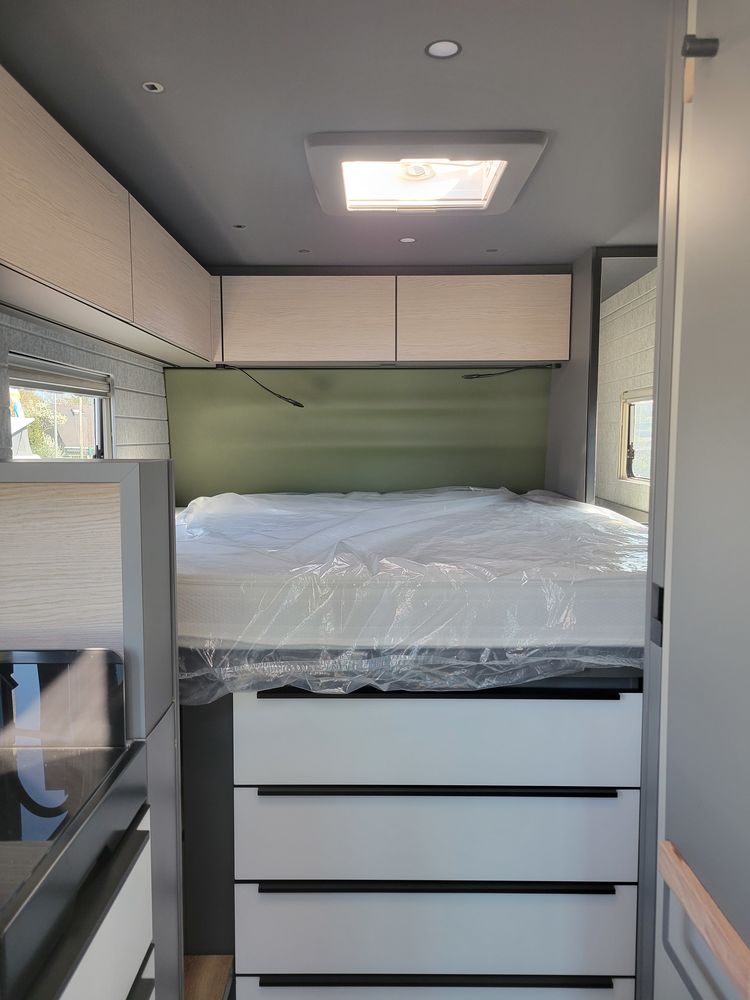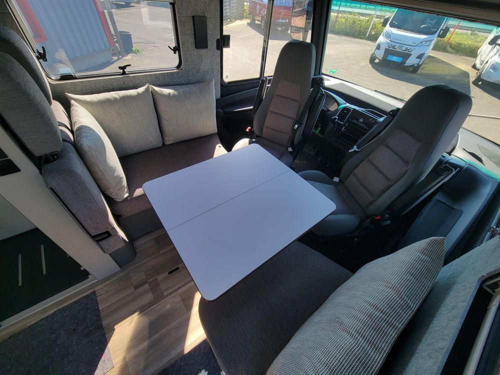 Pack Confort : Stores plissés, commande électrique et store isolant sur pare-brise, Lanterneau panoramique au dessus du salon, Revêtement acoustique des parois latérales, porte moustiquaire coulissante, Concept d'éclairage intuitif, Matelas confort avec système Froli sur lit arrière, Sièges conducteurs et passager AGUTI pivotant, réglables avec revêtement tissu