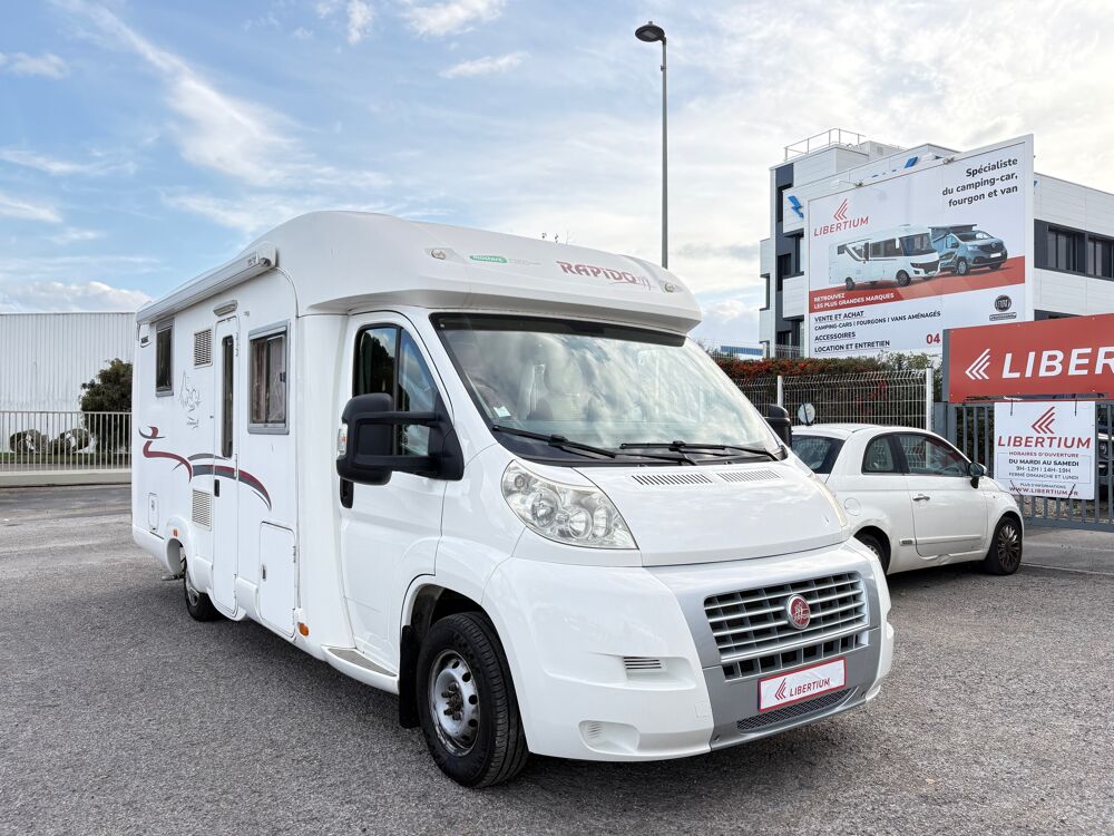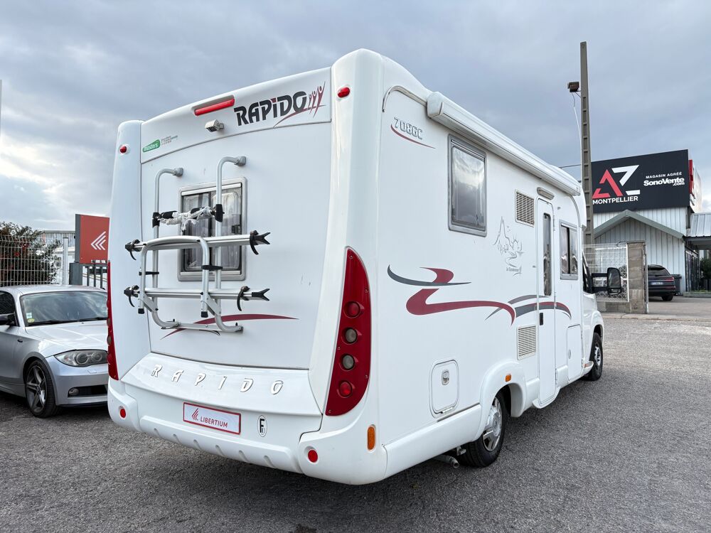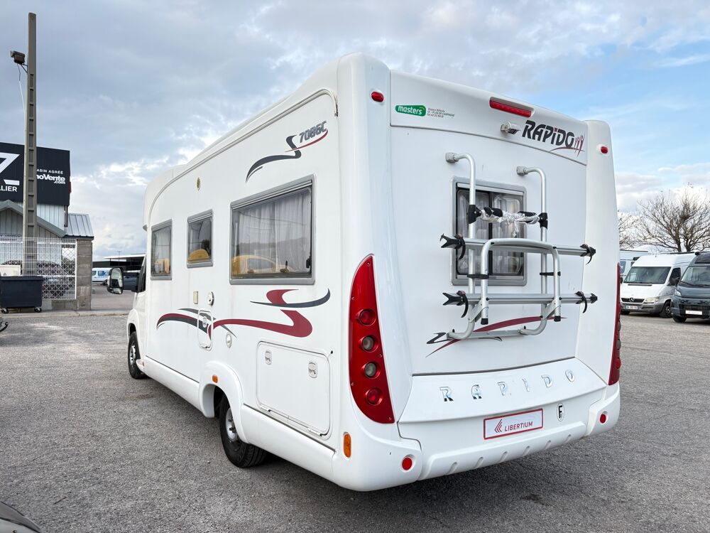 Le camping car profilé Rapido 7086 c , lit à la française lit dinette, ce 4 places vous séduira par ses dimentions généreuse et son tarif intéressantPANNEAU SOLAIRE, PORTE VELOS, CAMERA DE RECUL, CD PIONEER, ANTENNE SAT AUTO ALDEN, STORE EXTERIEUR, FOUR, HOTTE ASPIRANTE