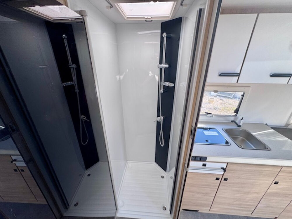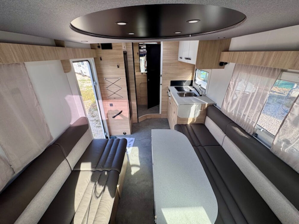 En effet, son lit de pavillon électrique XXL (160x190) pouvant descendre jusqu'en bas vous permet de conserver un salon immense avec banquettes latérales vous permettant la sieste ou de manger à 5 personnes !! Sa salle de bain arrière possède une douche immense et vous aurez encore la surprise d'avoir une très belle soute extérieure, accessible de l'intérieur !