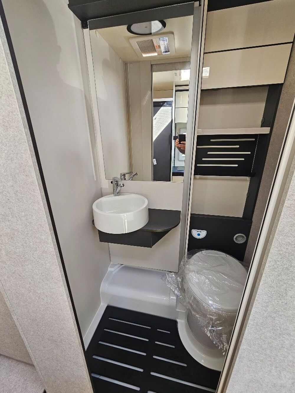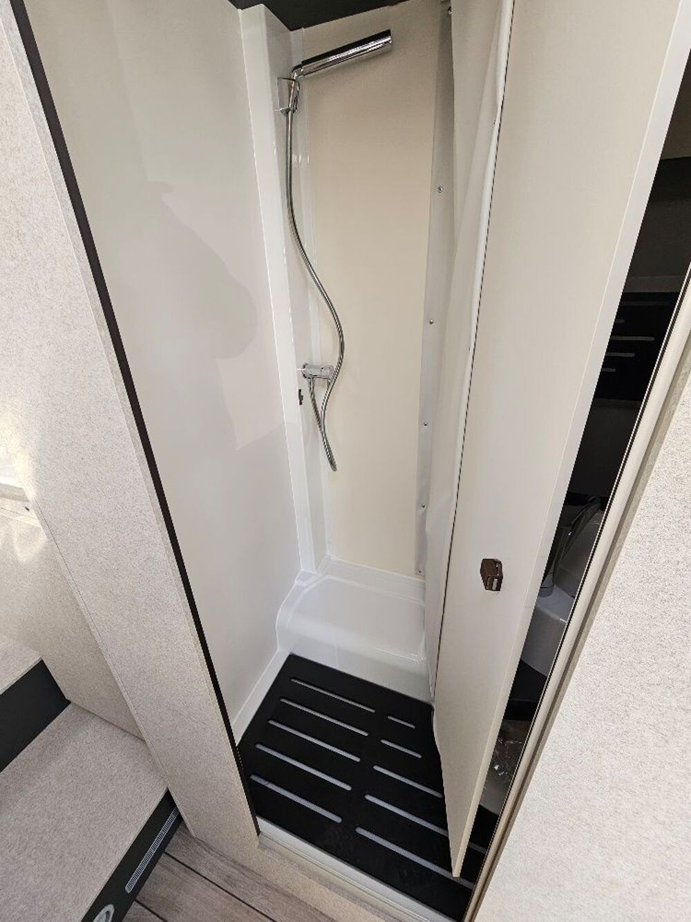 La salle de bains vario est une solution pratique et intelligente. Grâce à la paroi du lavabo pivotante, permet de moduler les espaces pour obtenir des WC plus grands ou une douche plus spacieuse. Une flexibilité unique qui permet d'adapter l'espace aux besoins du moment, pour une expérience à bord personnalisée et polyvalente.