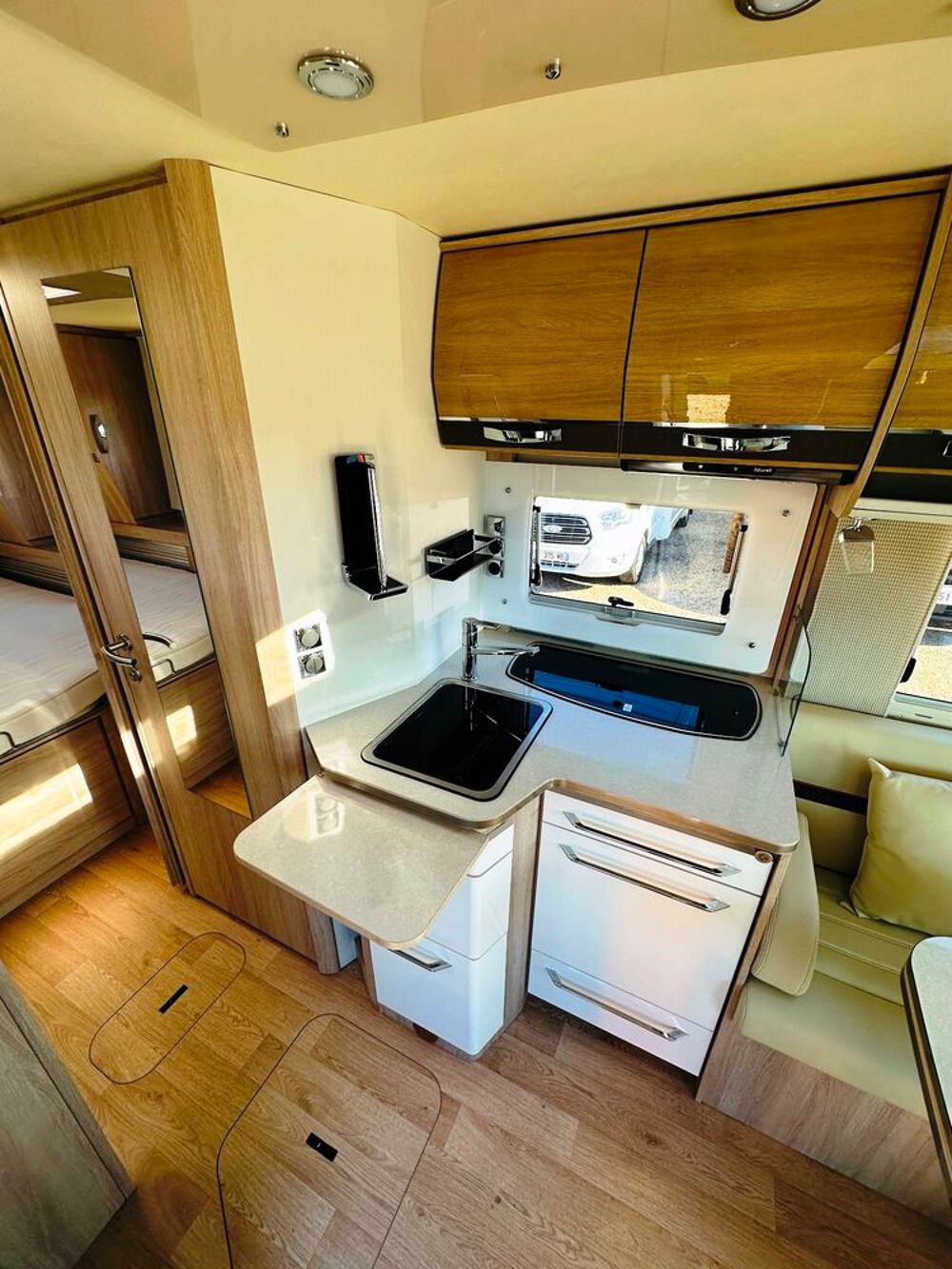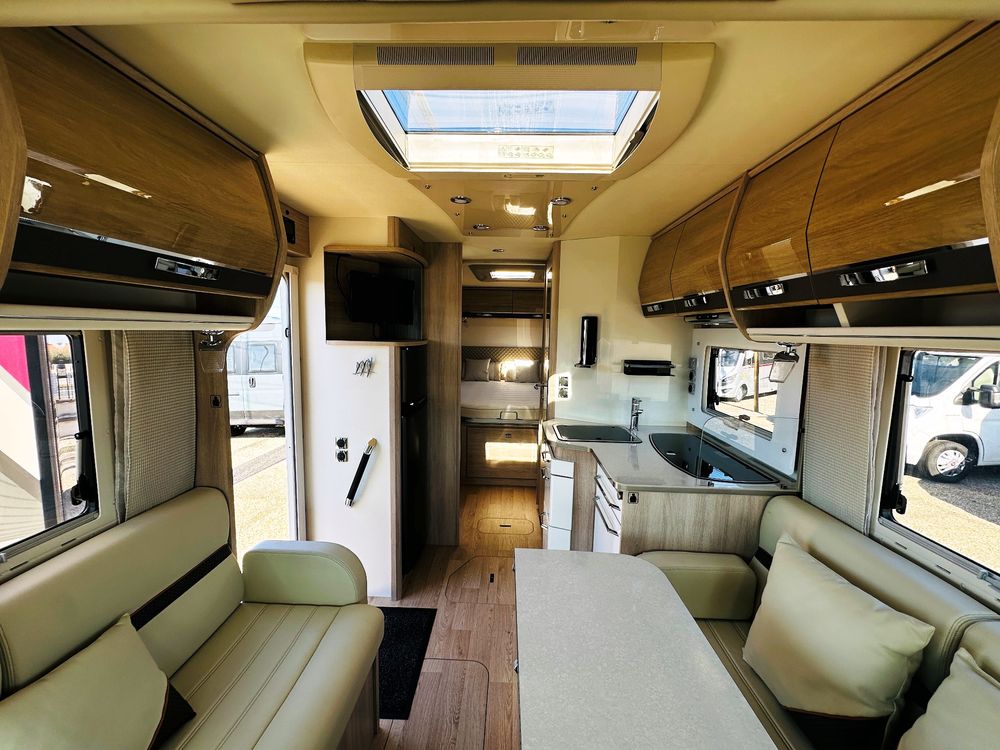 Intégral Rapido, lit central réglable en hauteur (électriquement), 4 couchages, salle de bain avec grande douche entièrement séparée, double fermeture chambre arrière, cuisine spacieuse et toute équipée, vaste salon avant avec sièges pivotant et table centrale, lit pavillon en cabine pour deux adultes.