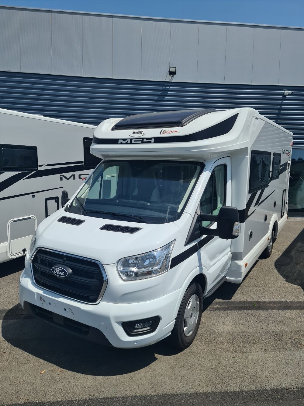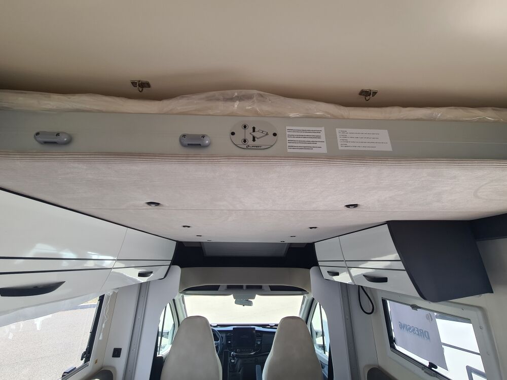 Profilé avec lit de pavillon de moins de 7 métres, avec maxi salon, grand réfrigérateur de 145 litres, salle de bains et armoire arrière.