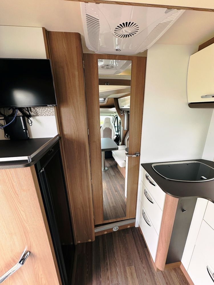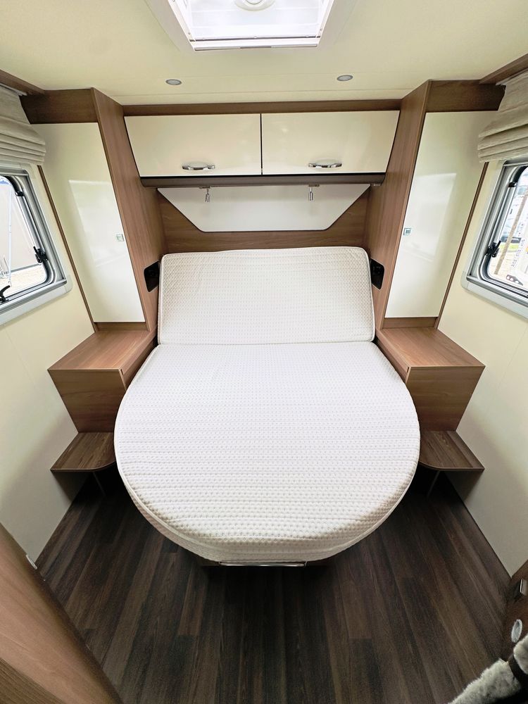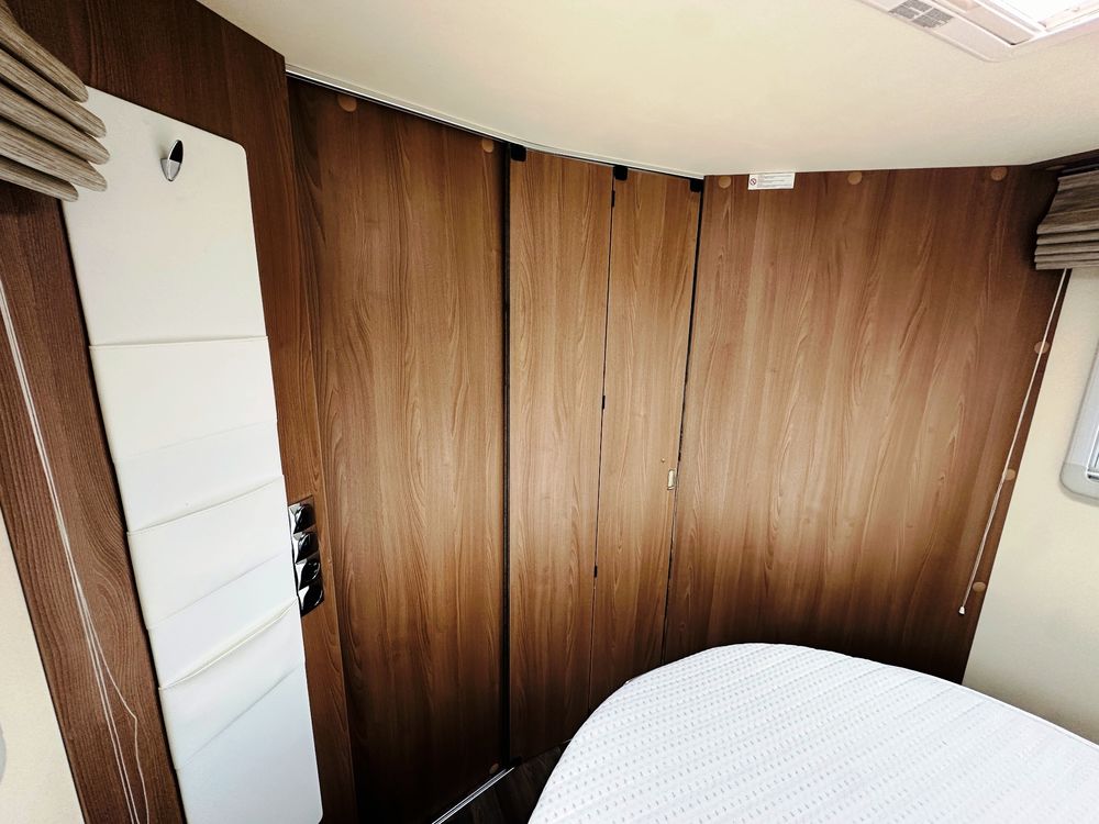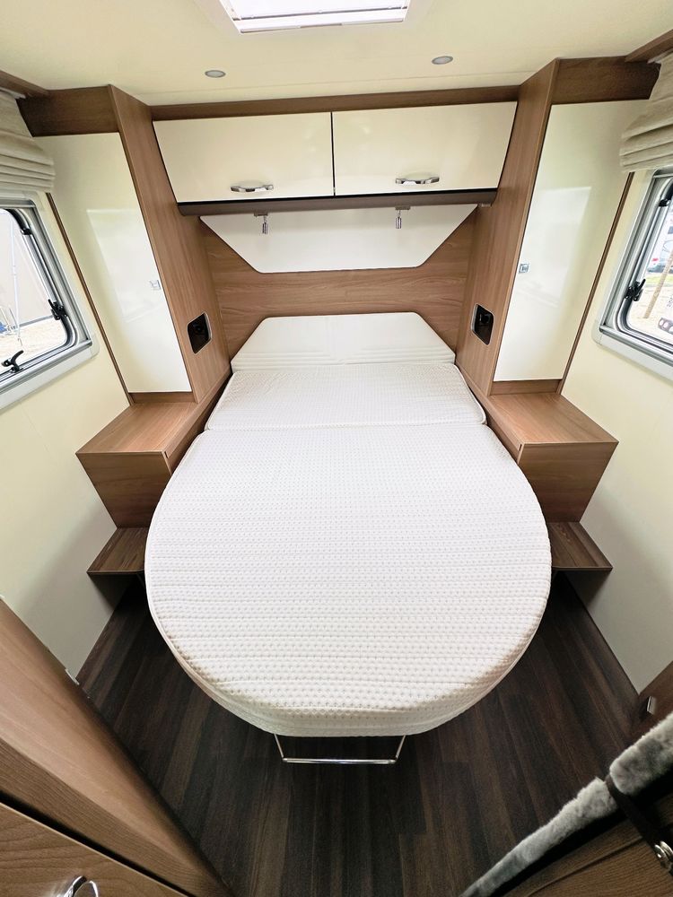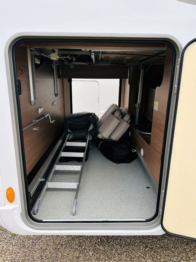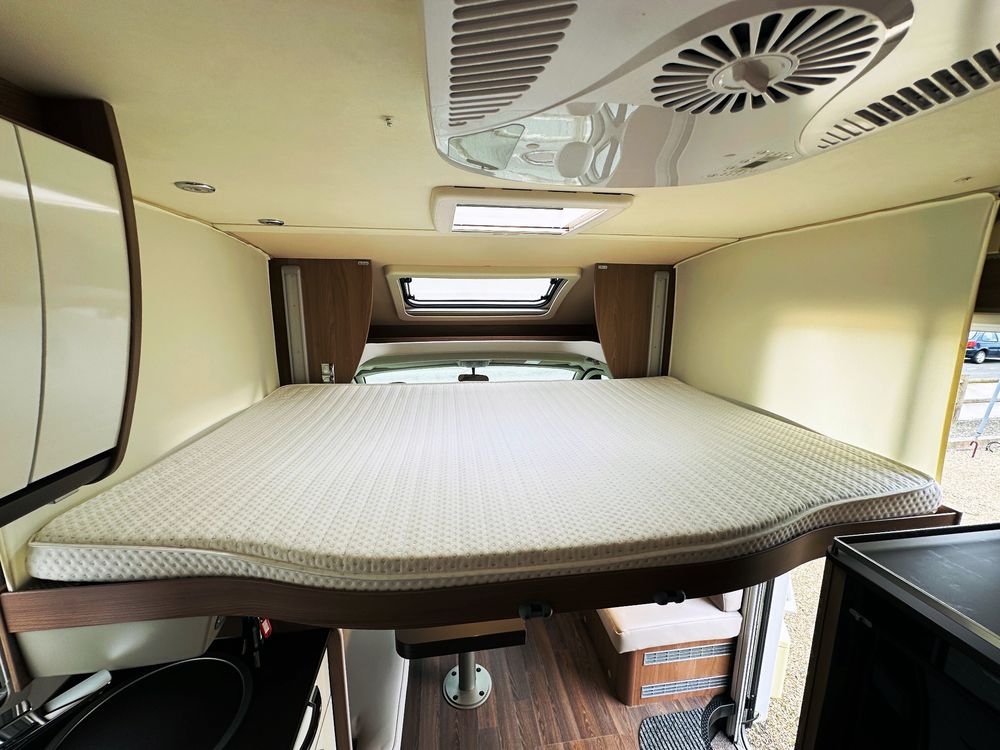 Profilé Burstner, 4 couchages, lit central réglable en hauteur sur soute garage (plusieurs vélos), salle de bain avec grande douche entièrement séparée, double fermeture chambre arrière, cuisine spacieuse et toute équipée, vaste salon avant avec sièges pivotant et table centrale + lit pavillon électrique pour deux adultes.