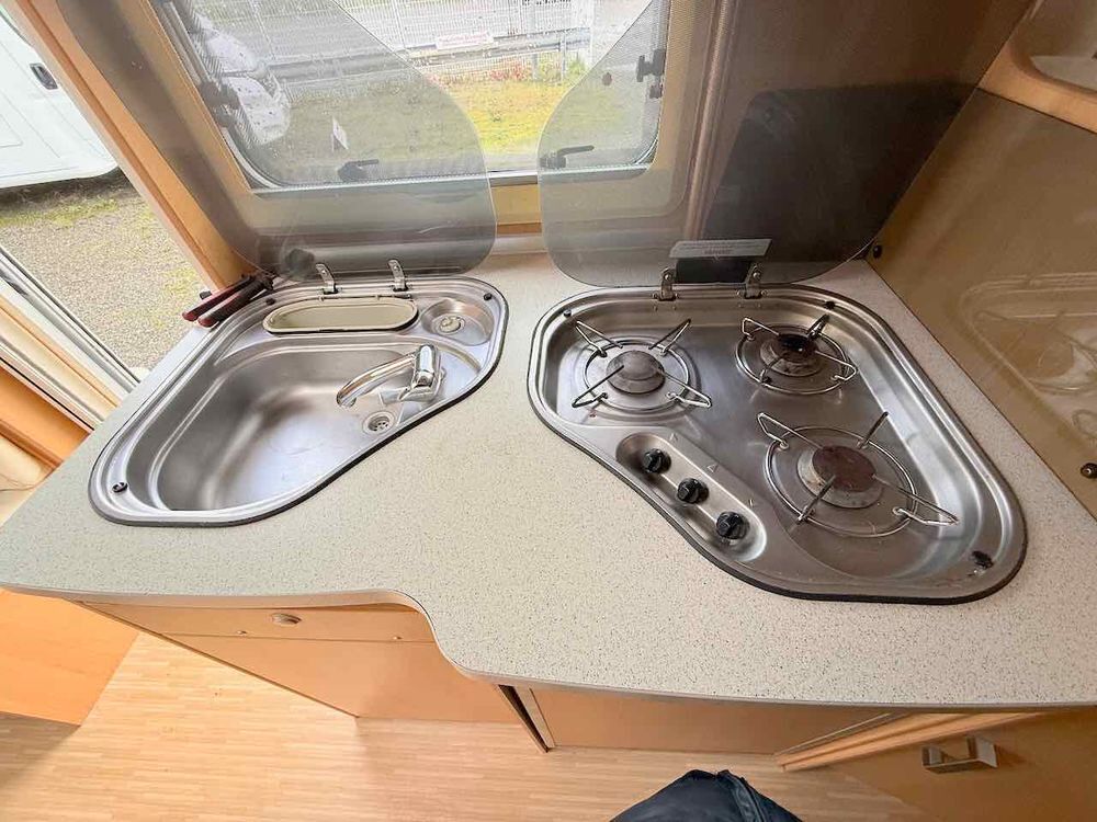 La cuisine présente de nombreux rangements, un réfrigérateur trimixte de 86 L, un réchaud 3 feux, un évier inoxydable et une hotte aspirante.