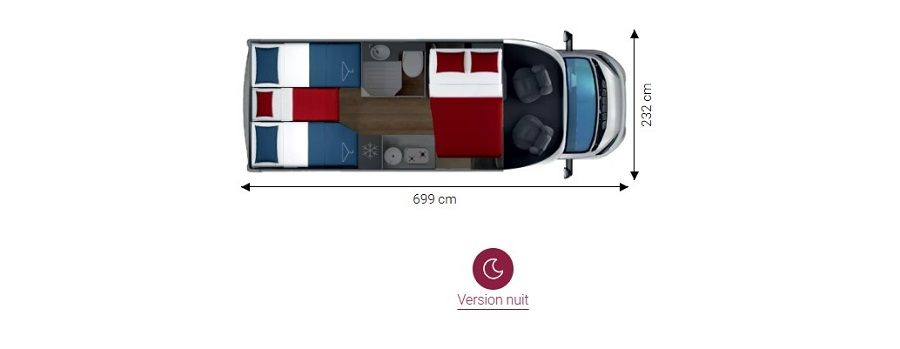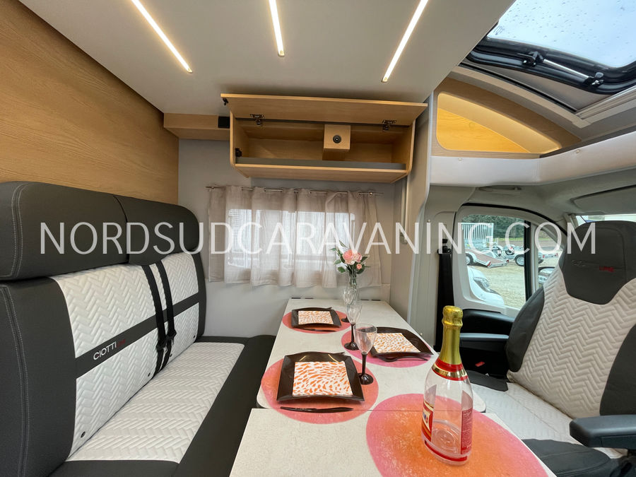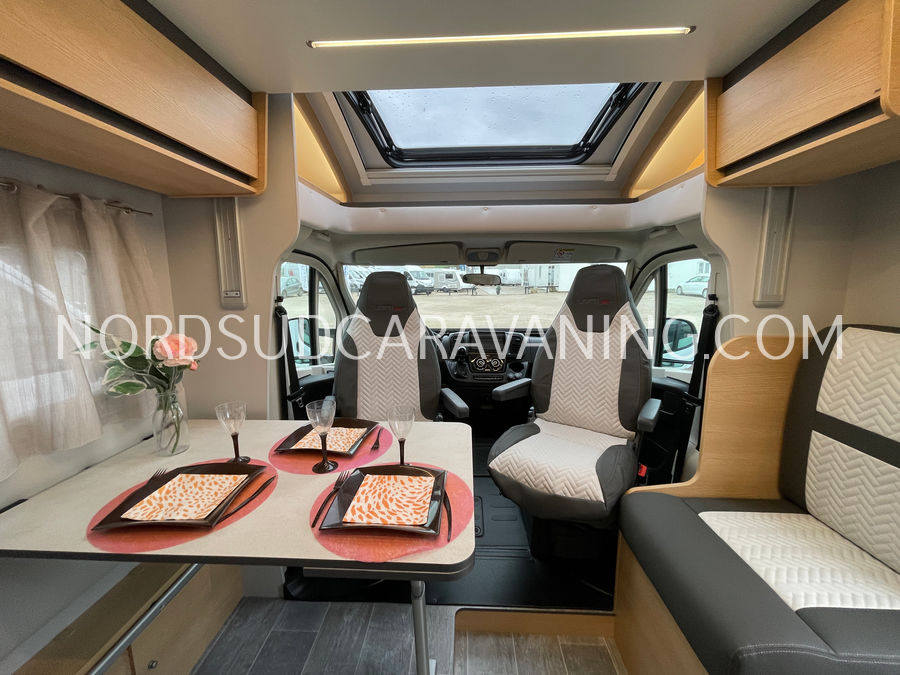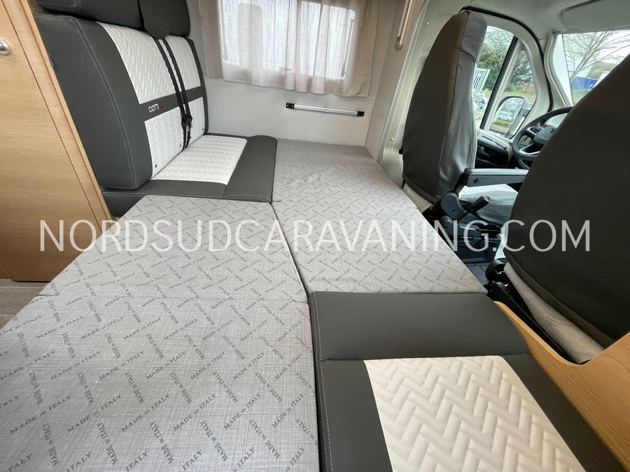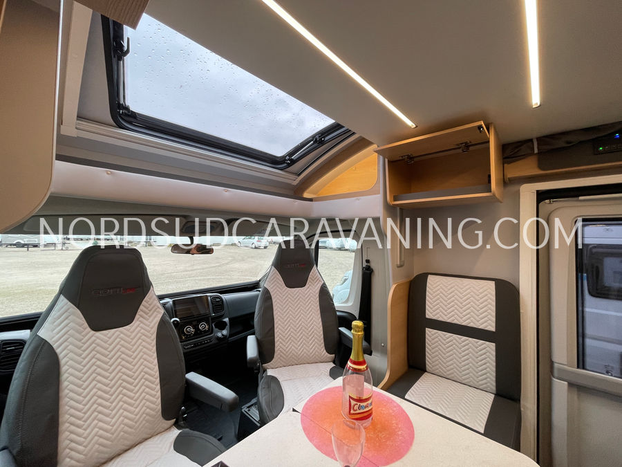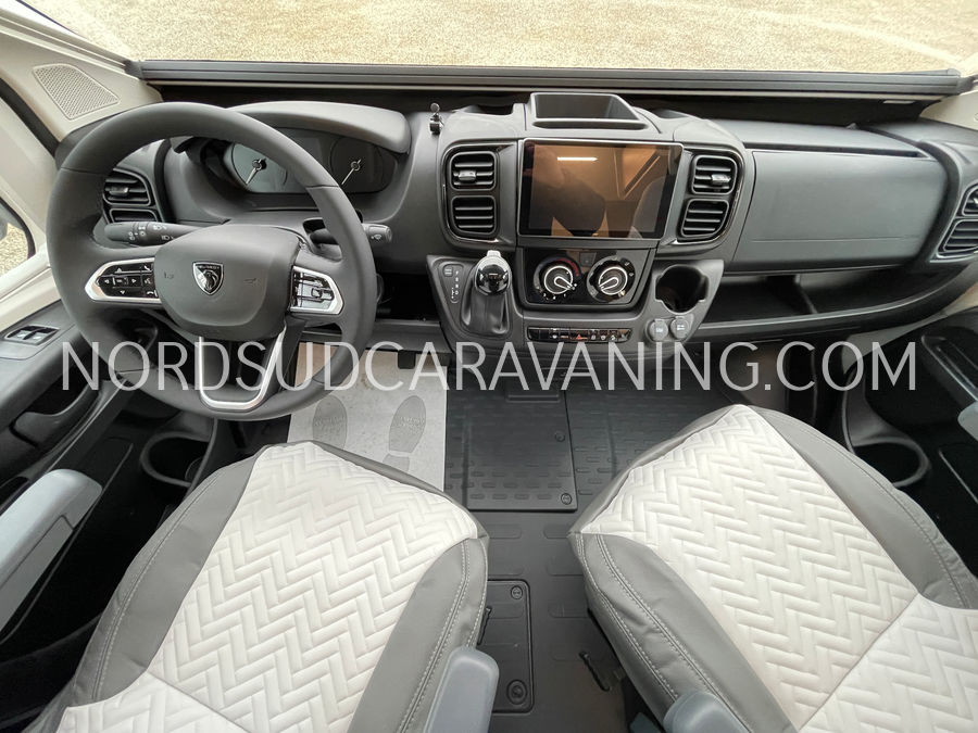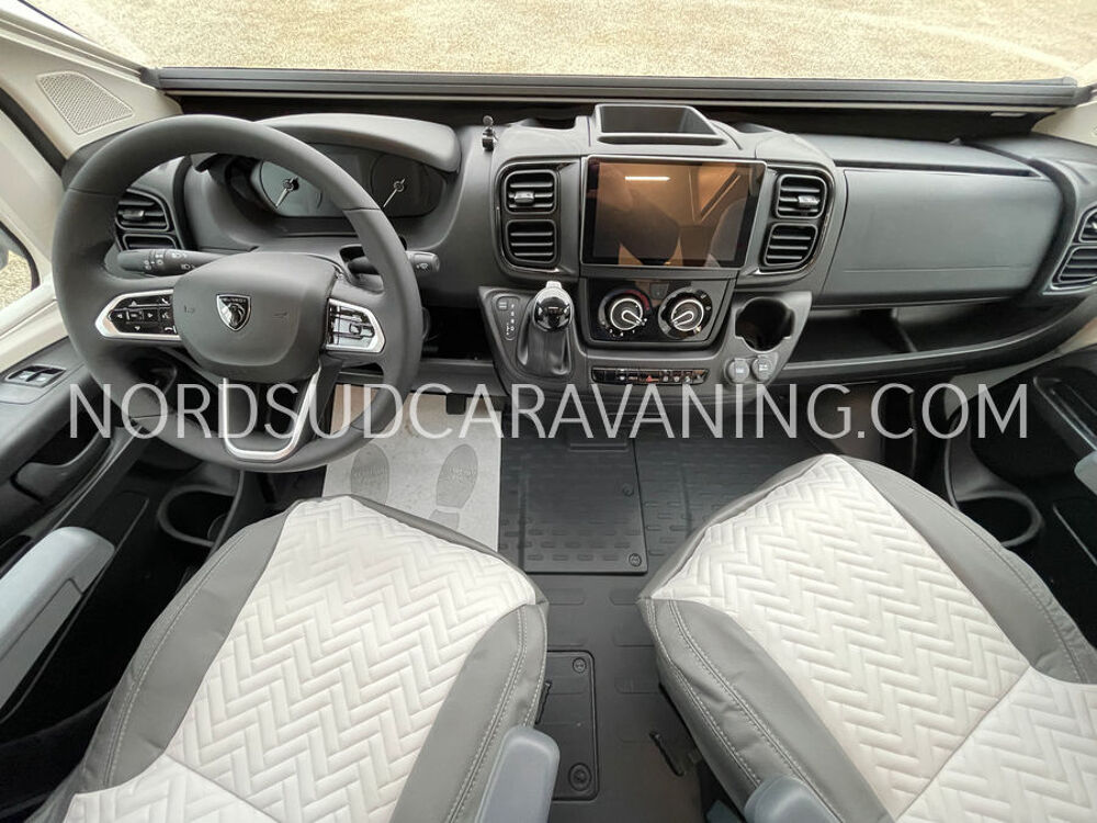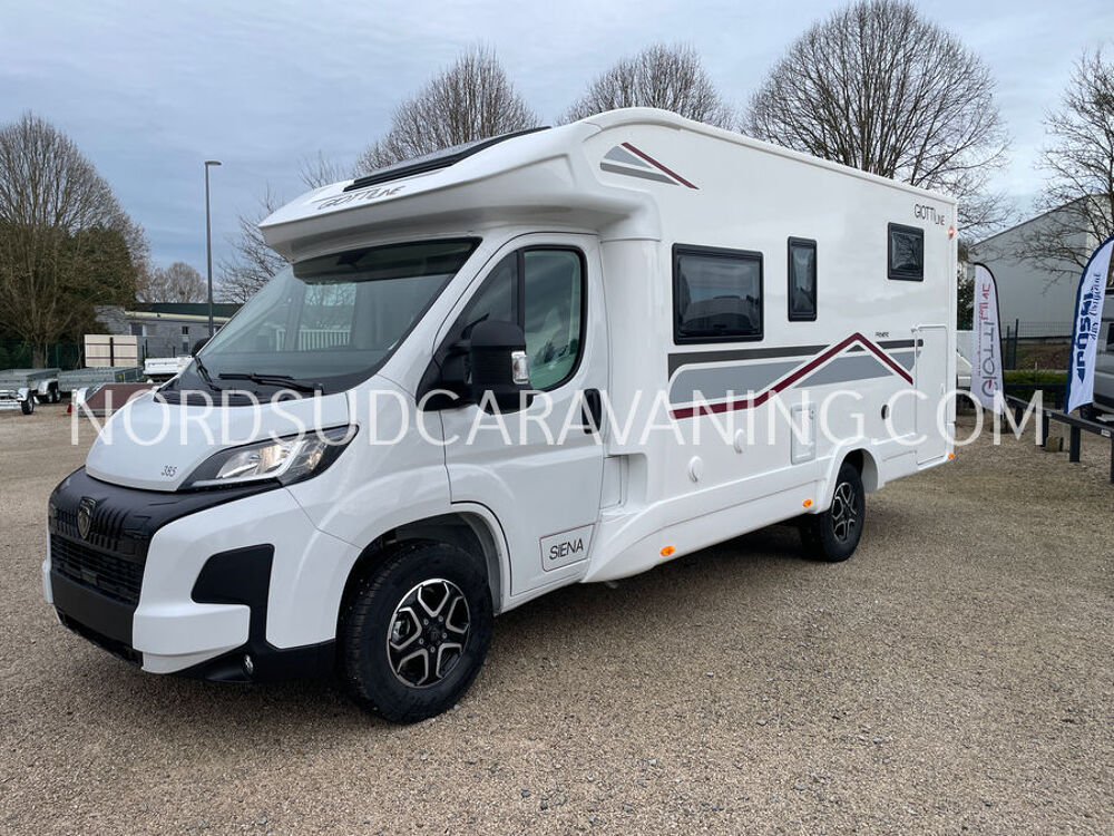Ce camping-car profilé GIOTTILINE SIENA 385 Première Edition de moins de 7 m sur porteur Peugeot avec boîte de vitesse automatique a tout pour plaire : Lits jumeaux transformables en un lit XXL permettant un couchage pour 3 personnes, Garage d'une capacité de rangements de 300 kg, équipé d'une prise 220 V; Hauteur du garage 120 cm et accessible de l'extérieur grâce à deux portillons. Son homologation permet la circulation avec 5 personnes à bord avec ceintures de sécurité.
