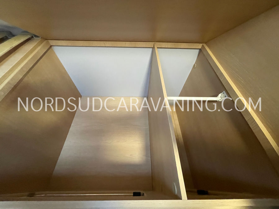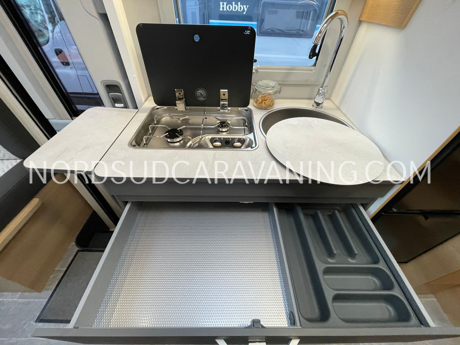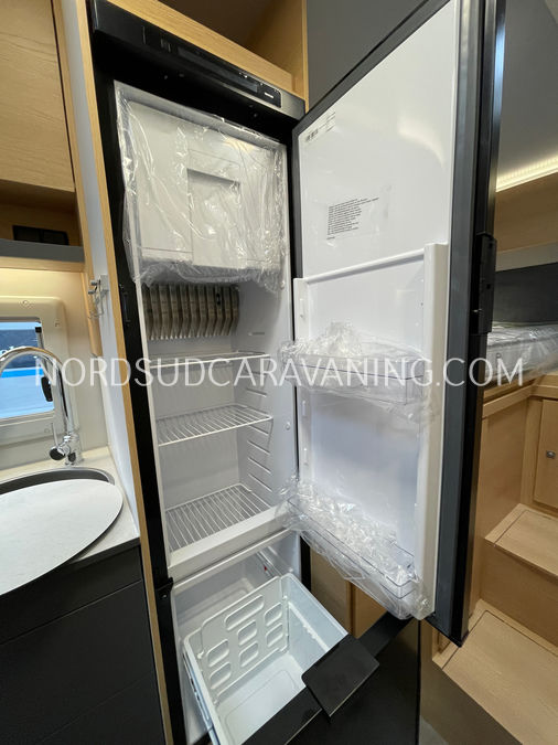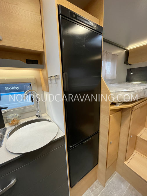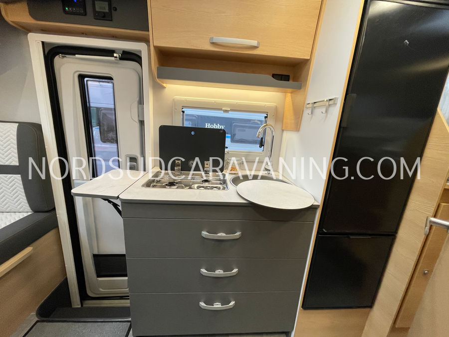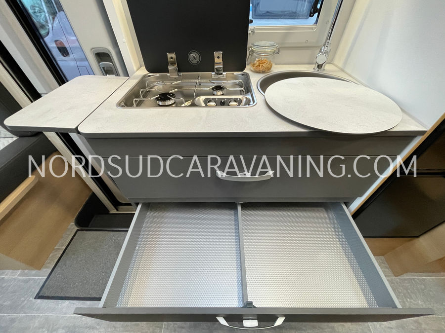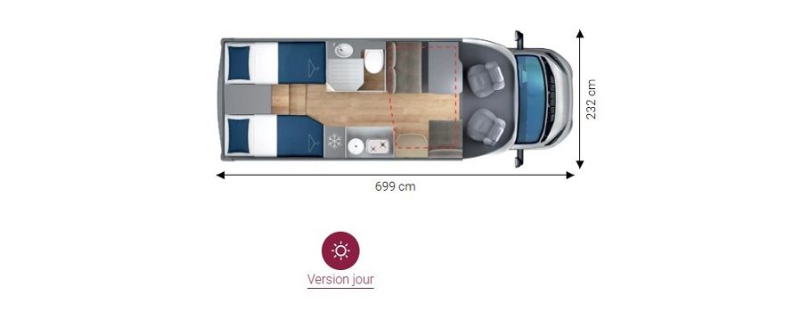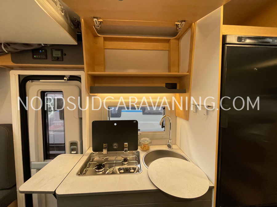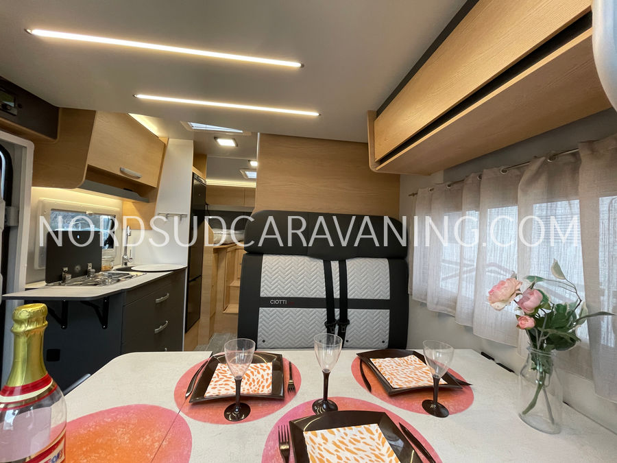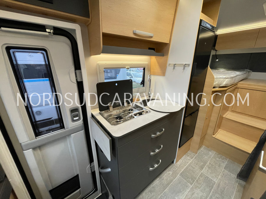 Il est doté également d'une cuisine pratique et fonctionnelle équipée de plaque cuisson 2 feux, d'un évier inox et d'un grand réfrigérateur (142L), d'un joli salon transformable en couchage et de nombreux rangements astucieux. Sans oublier son coin toilette agréable et spacieux avec WC, Lavabo et douche.