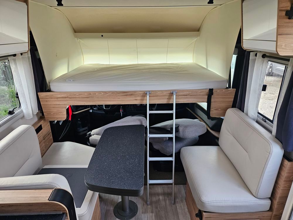 Monté sur un porteur Fiat DUCATO 2,2 L développant 180 Ch avec une boite AUTOMATIQUE très agréable à conduire. Un kilométrage de 29100 Km, véhicule récent et soigneusement entretenu.