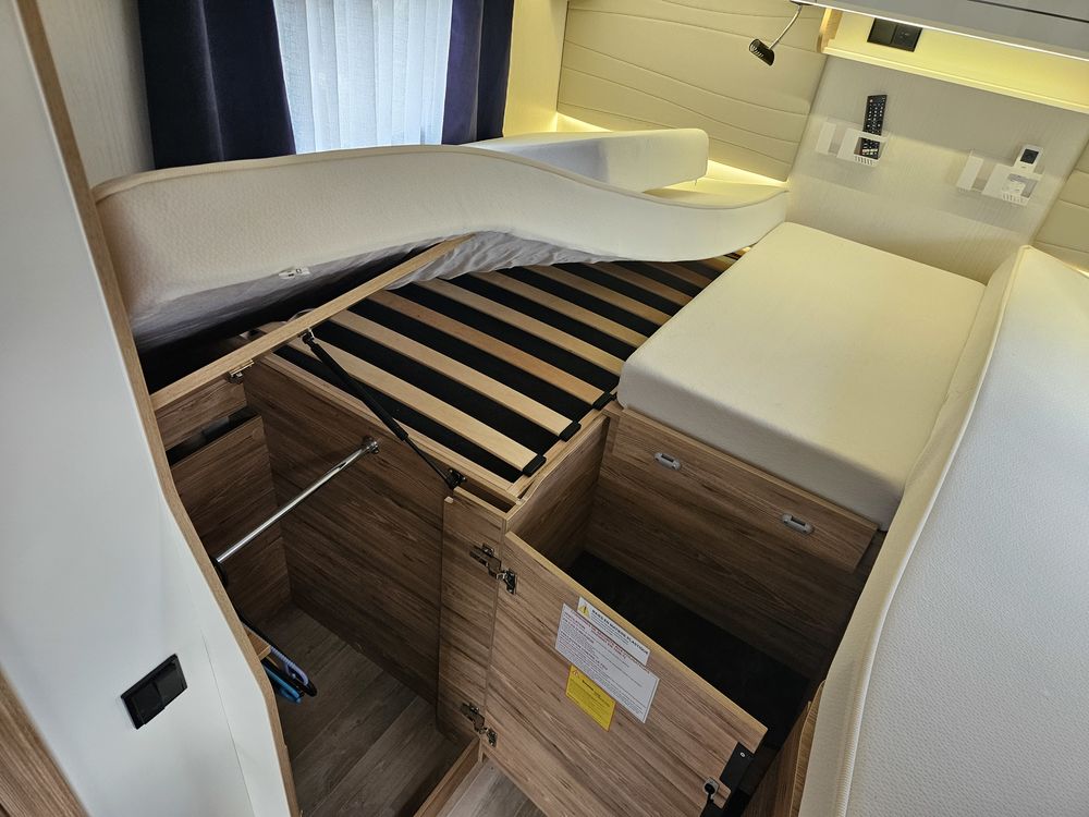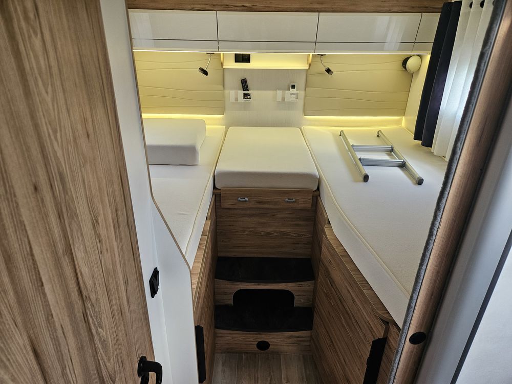 Un marchepied électrique, un store extérieur de 4,5 Mètres, une moustiquaire de porte cellule. Avec des store plissés de cabine et une moquette cabine.