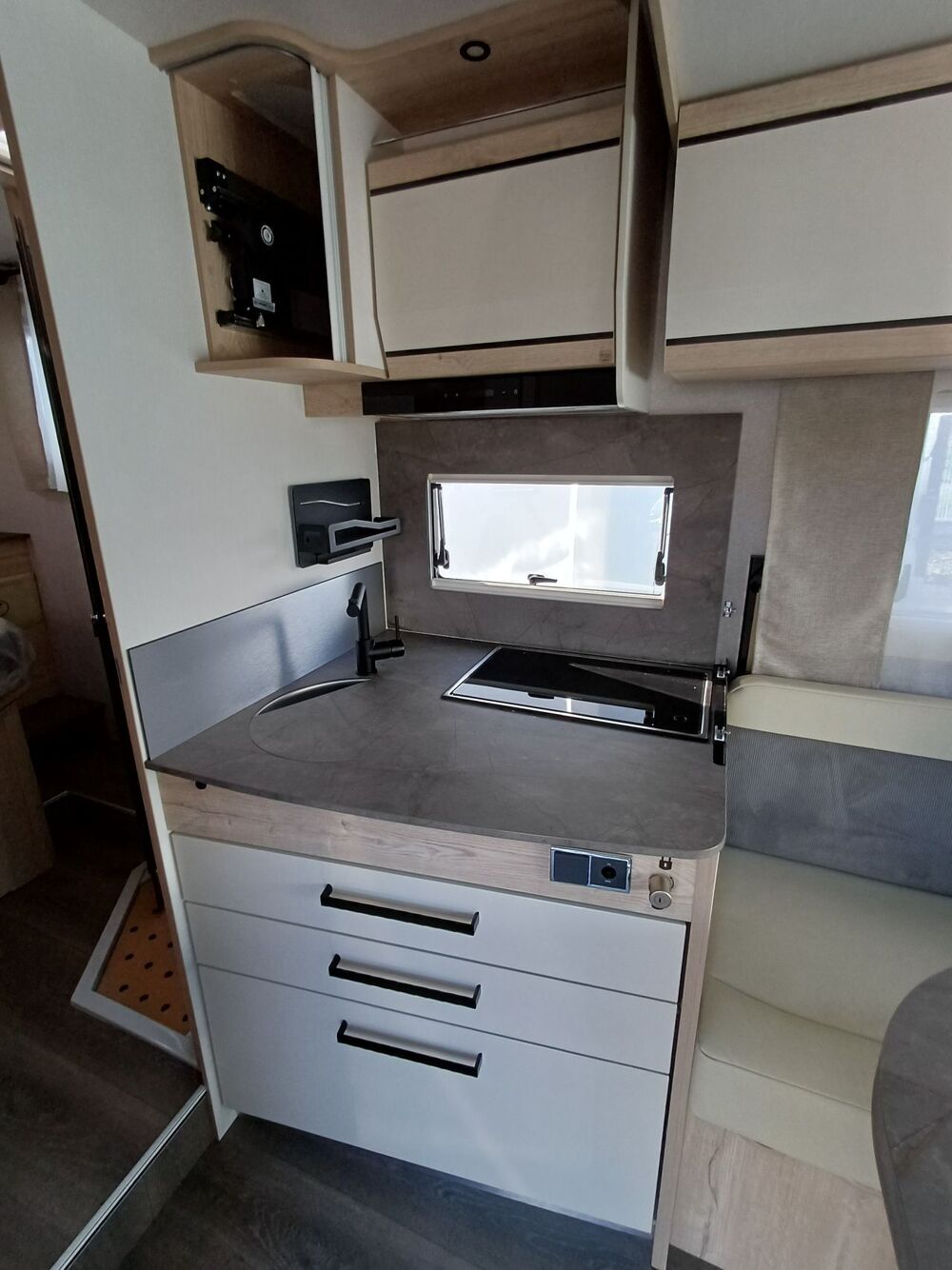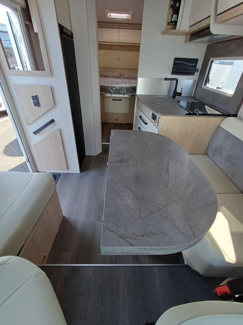 -Pack Confort: Traction +, Antibrouillards et PC peints, commandes au volant + HP, Porte cellule Hartal avec baie et moustiquaire, stores cabine, autoradio double Din, DAB+ avec kit mains libre, caméra de recul, retroviseurs ext électrique dégivrants et rabatables électriquement (sur 60 LG,64LDF,69LJG), Commande digitale Truma, HP AV, 2ème télécommande(sauf Keyless), convertisseur DC/DC 40 AH, Batterie Lithium 100 AH, transformation dinette en couchage, hotte cuisine digitale à extraction latérale, vide poche central, inverseur gaz Duo Control, matelas Evolutex, Toit décaissé.