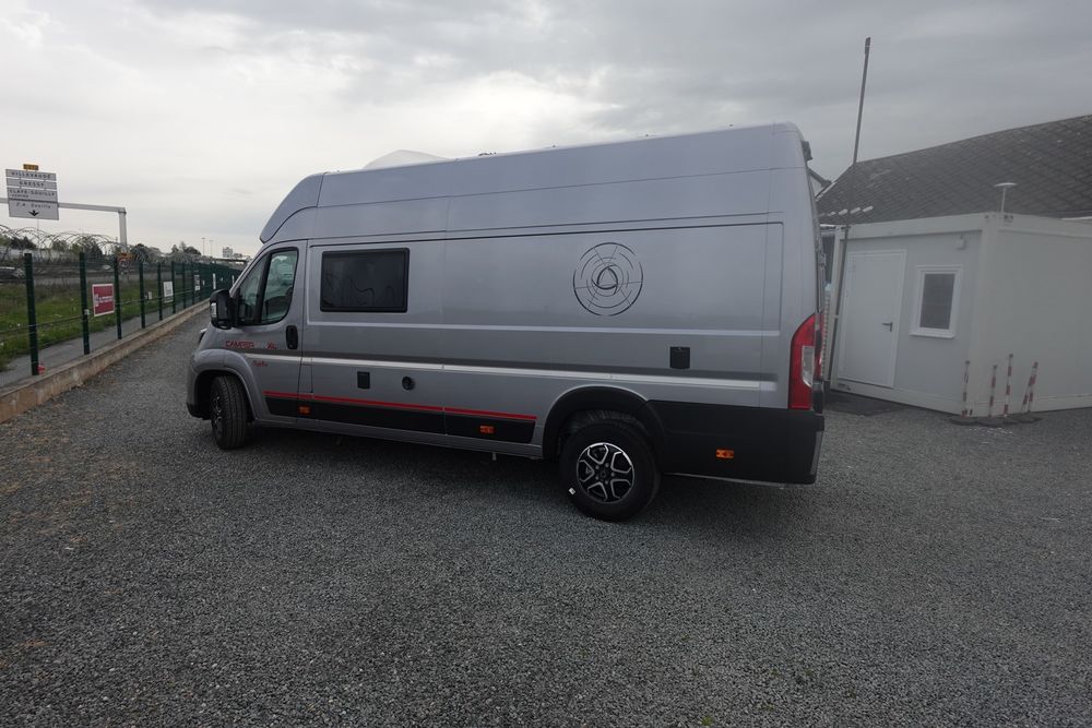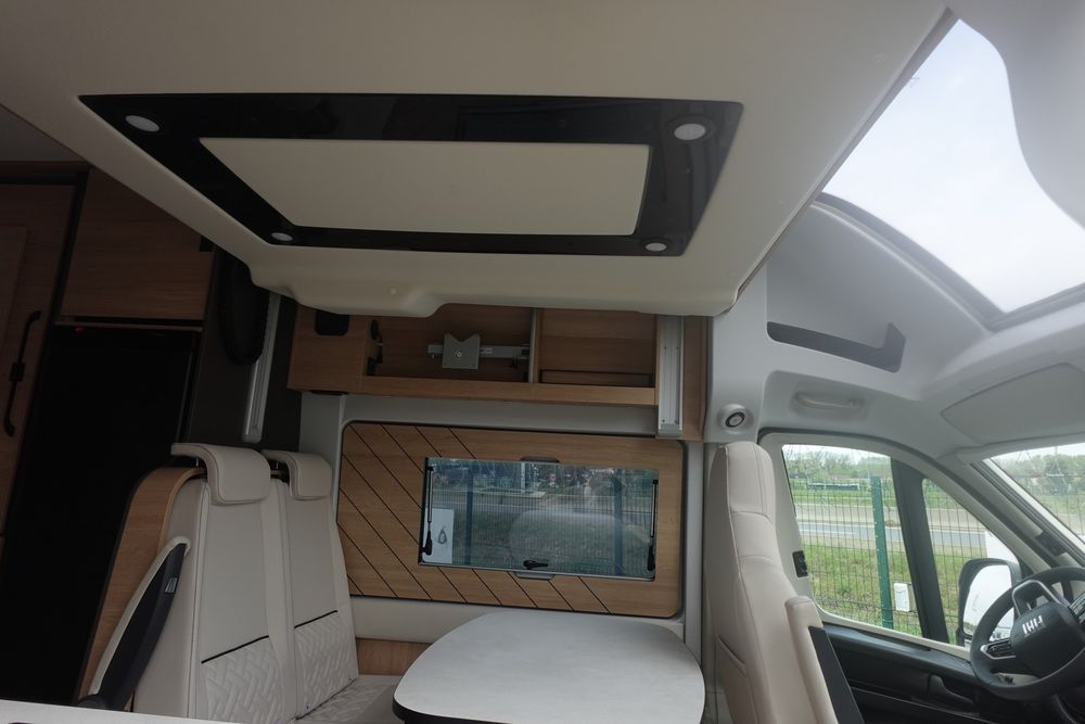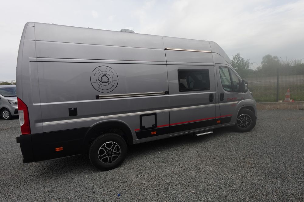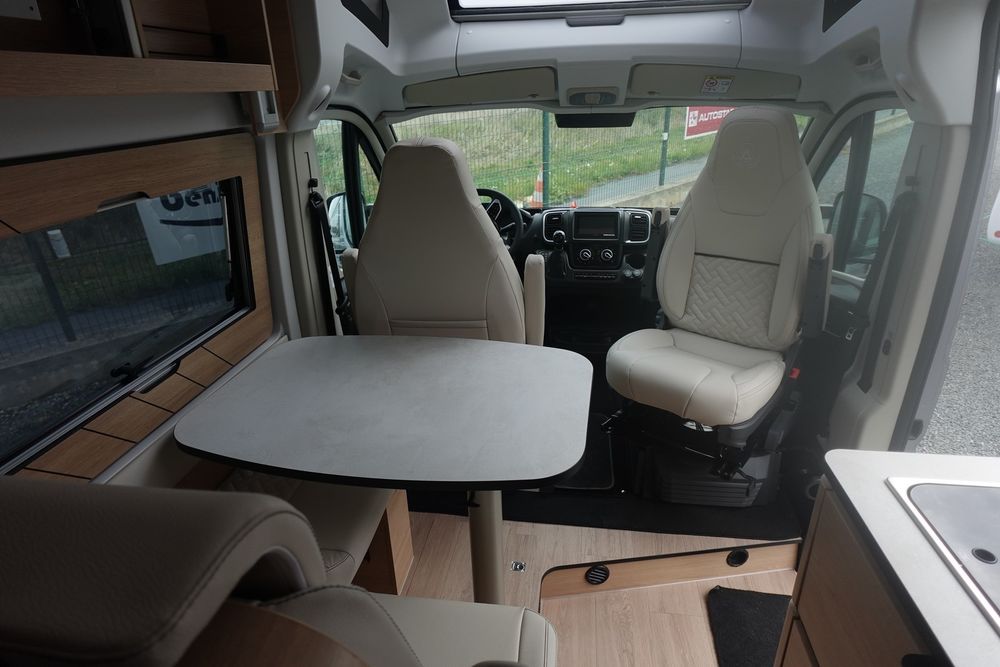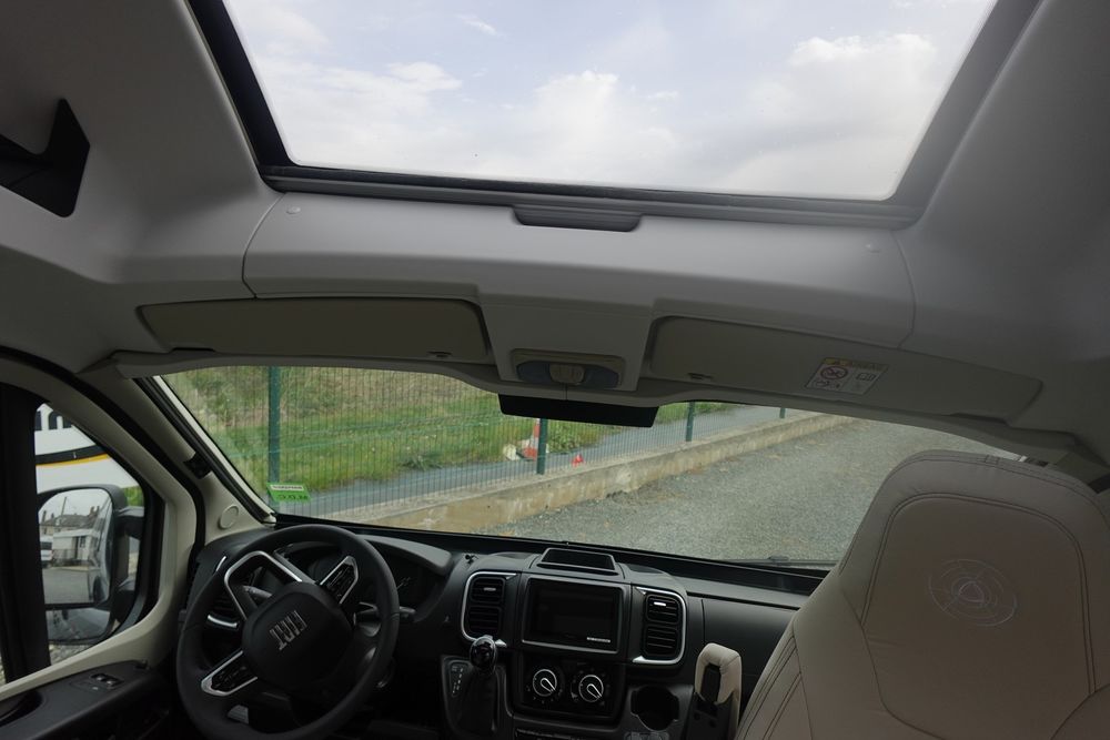 (Ambiance mobilier au choix, Sellerie au choix, Truma Combi 4 DIESEL avec kit altitude et commande de chauffage CP PLUS, 2ème batterie cellule AGM, Jantes 16 pouces en alliage léger, Volant cuir, Habillage gris sur aérateurs, TPMS, Feux avant 100 % LED, Allumage automatique des feux et des essuie-glaces, Frein de stationnement électrique, Pare-chocs avant couleur carrosserie, Skid plate noire, Feux anti-brouillard, Peinture métallisée Gris Artense, Toit panoramique SKYVIEW, Renfort pneumatiques suspension essieu arrière, Panneau solaire 150 W, Déco Saphir, Prise gaz extérieure)