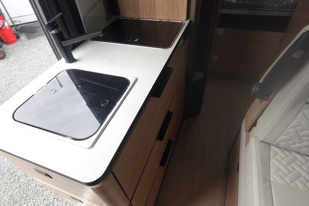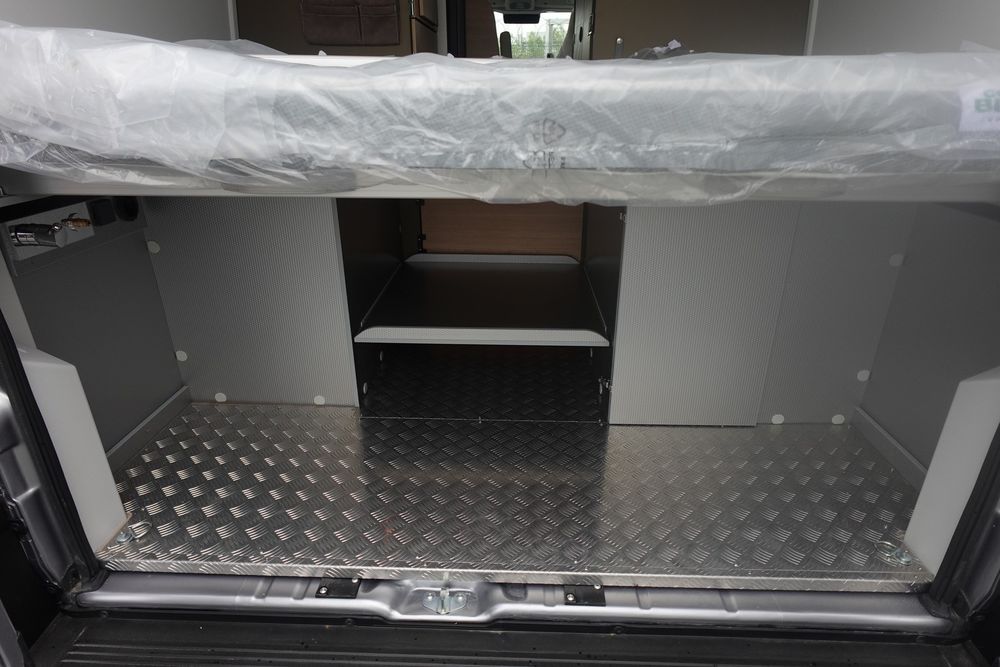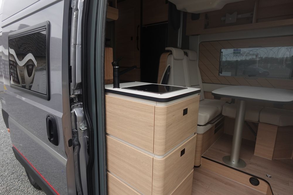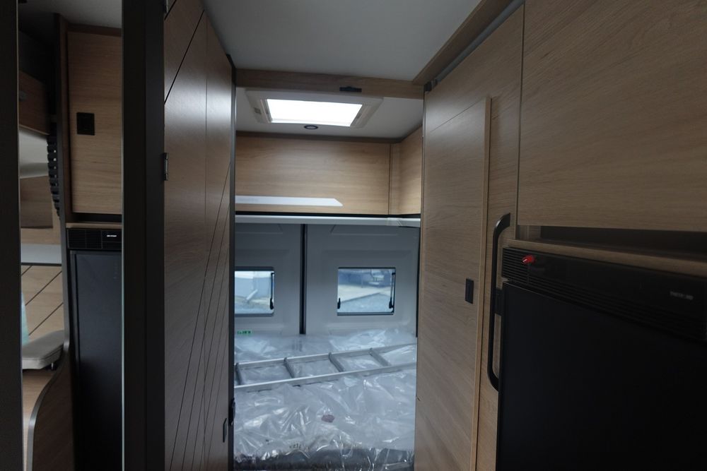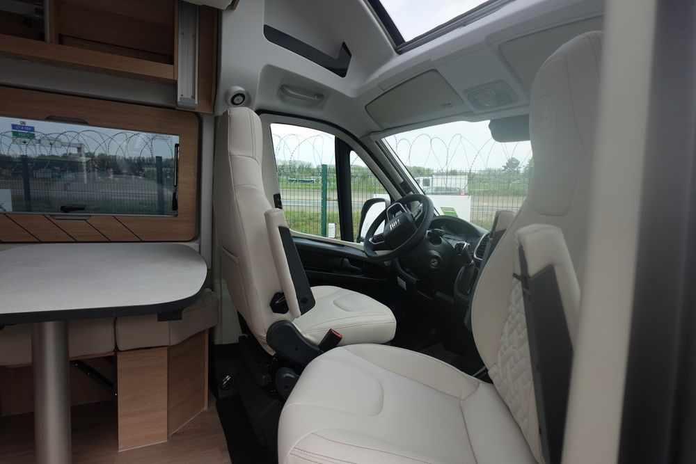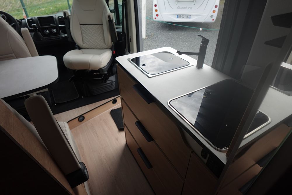 (Ambiance mobilier au choix, Sellerie au choix, Truma Combi 4 DIESEL avec kit altitude et commande de chauffage CP PLUS, 2ème batterie cellule AGM, Jantes 16 pouces en alliage léger, Volant cuir, Habillage gris sur aérateurs, TPMS, Feux avant 100 % LED, Allumage automatique des feux et des essuie-glaces, Frein de stationnement électrique, Pare-chocs avant couleur carrosserie, Skid plate noire, Feux anti-brouillard, Peinture métallisée Gris Artense, Toit panoramique SKYVIEW, Renfort pneumatiques suspension essieu arrière, Panneau solaire 150 W, Déco Saphir, Prise gaz extérieure)