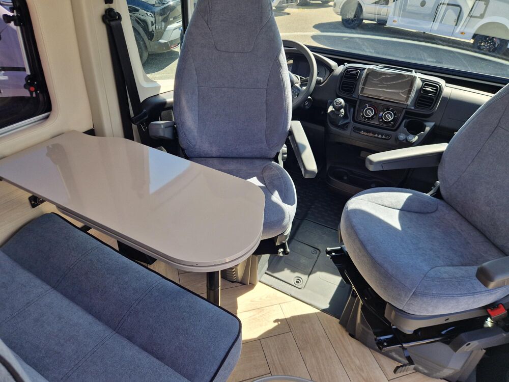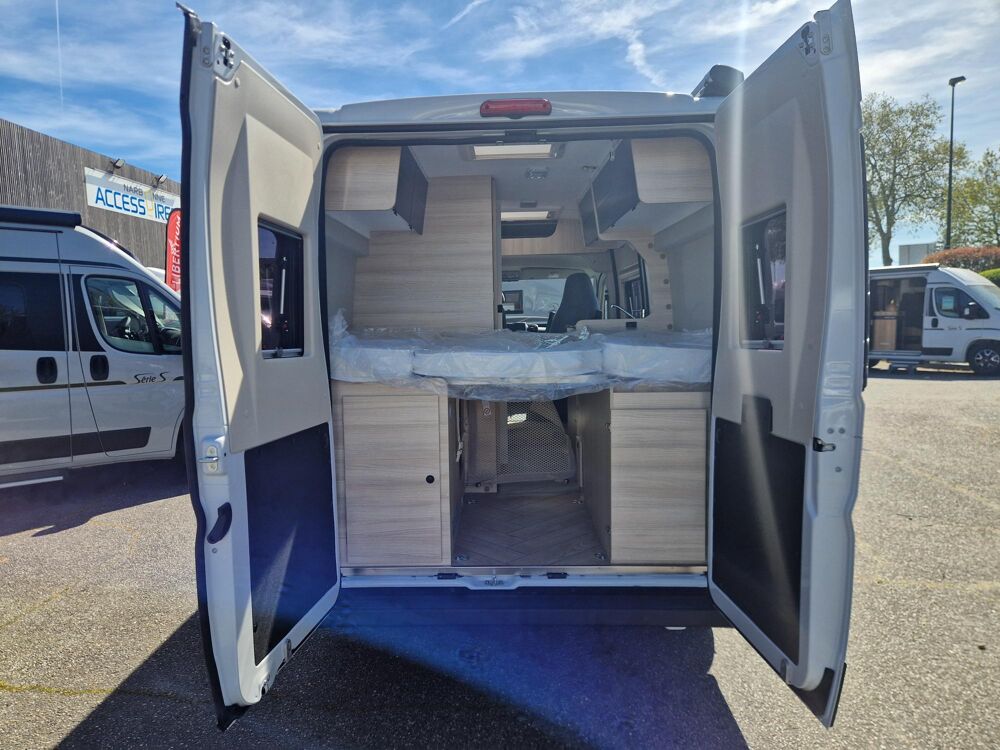 Fourgon compact de marque leader avec lit transversal sur soute, bien équipé de série, sur une base Fiat en 140 CV.