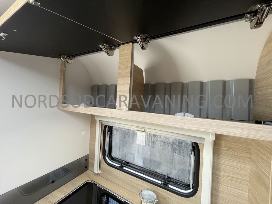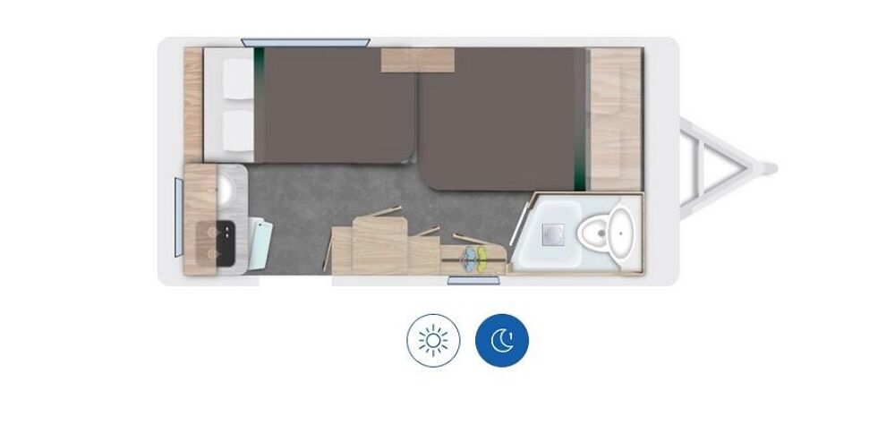 La caravane rigide CARAVELAIR 410 Sport Line est équipée d'un confortable lit de 198 cm à la française et de nombreux rangements : lingère, étagères, penderie, et range-bouteille, cette caravane est sans égal.