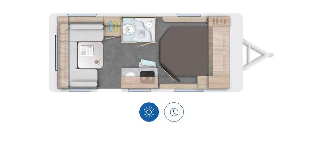 Cette caravane allie place, confort et rangements. Son lit central de 1,5m de large sur 1,98m de long est confortable et facilement accessible et vous disposez en outre d'une grande dinette, se transformant en un couchage 2 places supplémentaire. Une trappe d'accès extérieure sous le lit central vous permettra d'accéder facilement à cet espace de rangement. Sans oublier son coin toilette avec WC à cassette électrique, bac de propreté, douchette et rideau de douche.