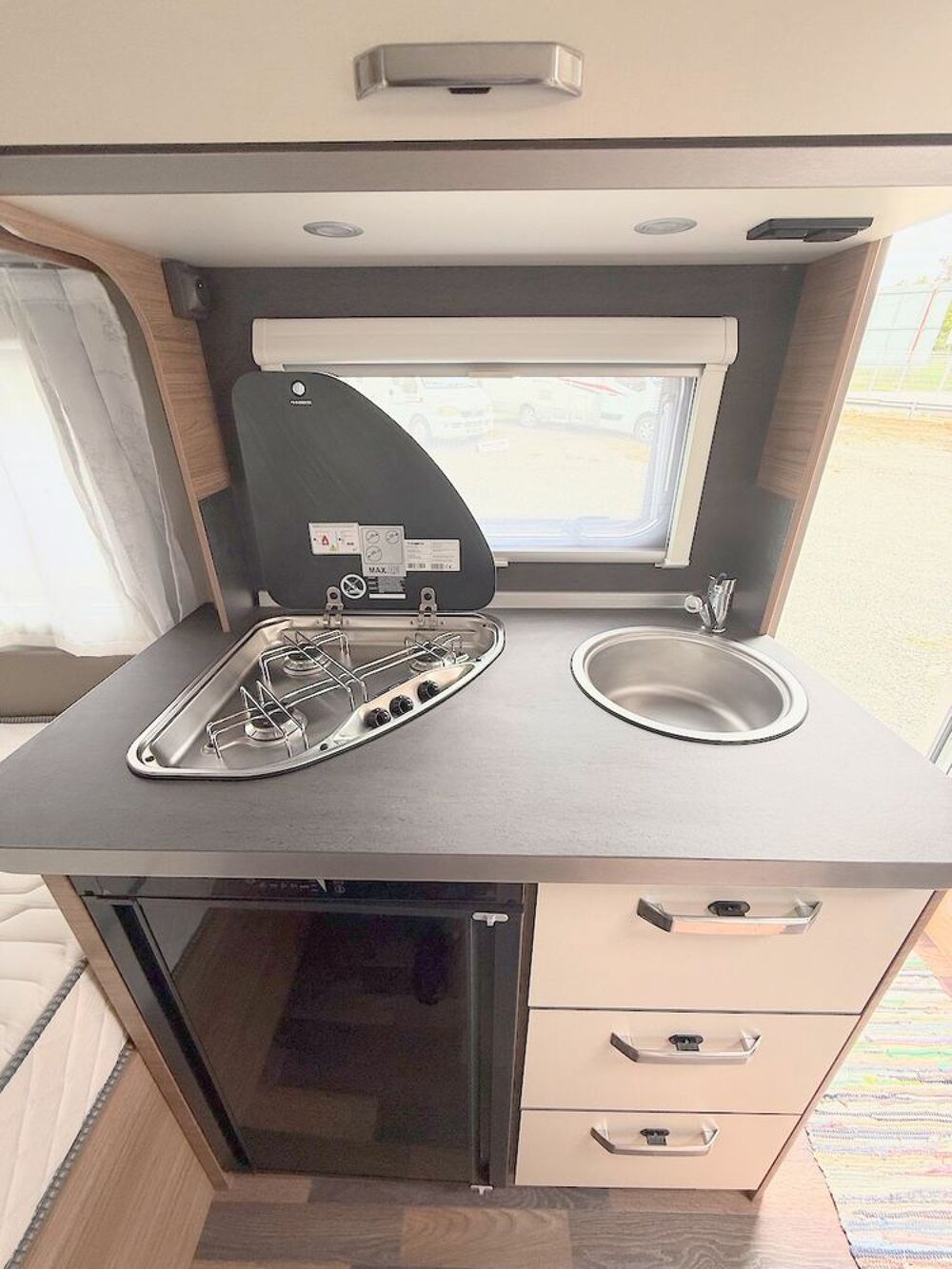 - une cuisine sur le flanc droit. La cuisine est équipée d'un réchaud 3 feux, d'un évier et d'un réfrigérateur 98 L.