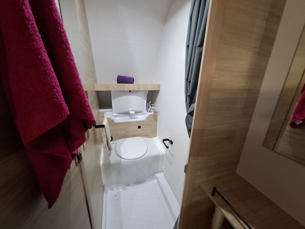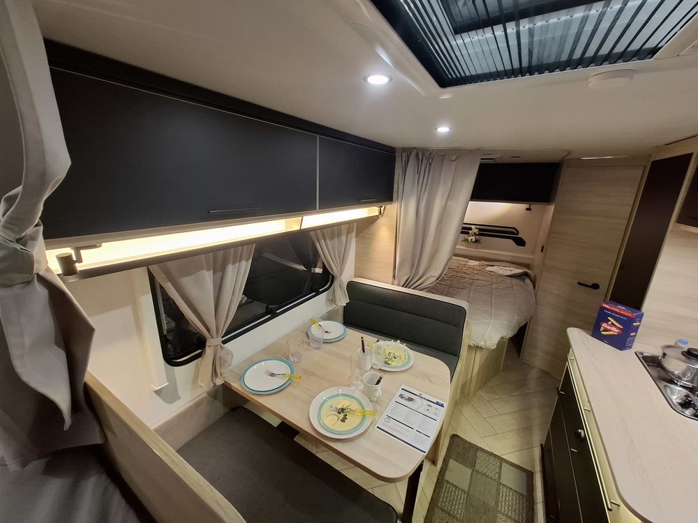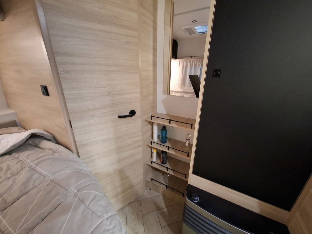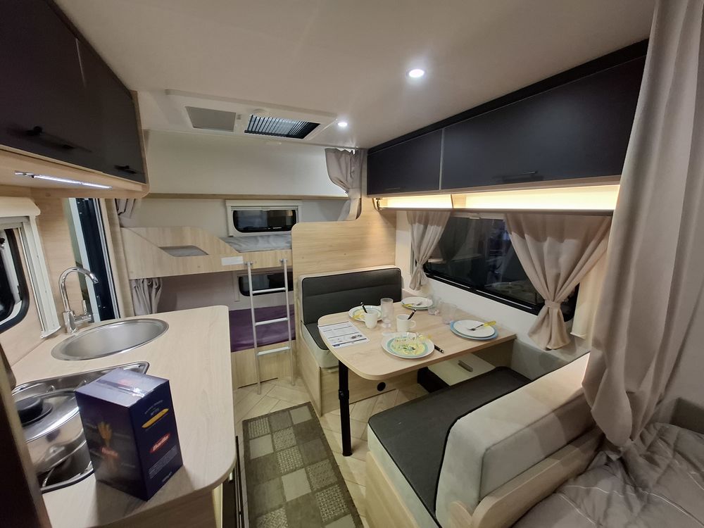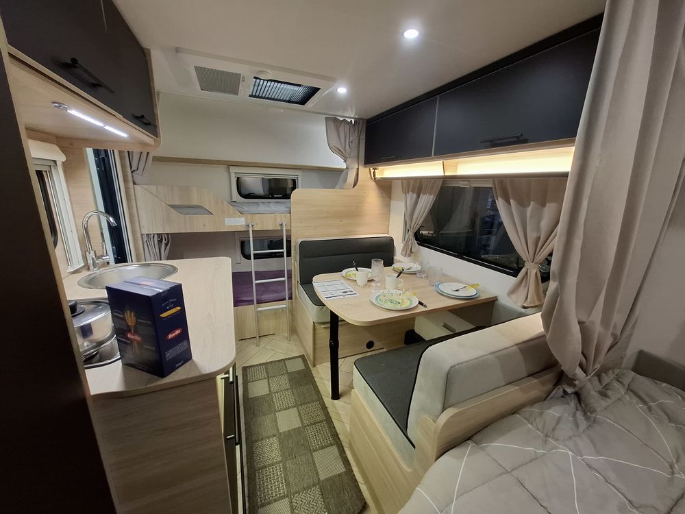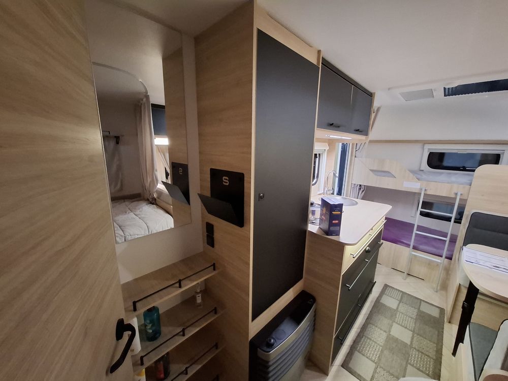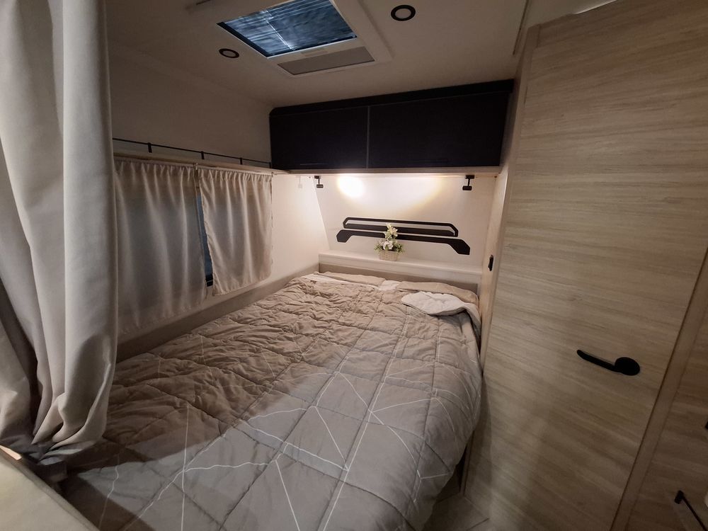 Le lit parental est de type "plan camping-car", ce qui permet de bénéficier d'un volume de vie rationnel et confortable. Les lits superposés "enfants" sont situés à l'arrière, prêt de la porte d'entrée.