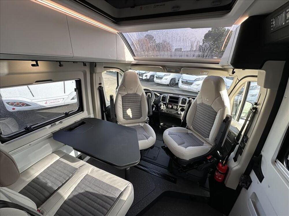 Version toit relevable du modèle 640 SGX , on gagne également au passage un toit panoramique ainsi qu'un lit pavillon électrique qui transforme la soute en une grande partie stockage ( Vélos, moto, Scooter...).