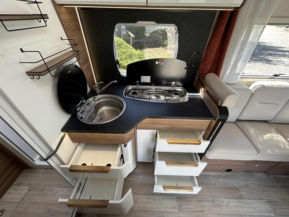Ce profilé compact de 6,99 m a été conçu pour répondre aux attentes des camping-caristes recherchant de vastes espaces de vie. Ils apprécieront l'utilisation optimisée du véhicule, notamment grâce aux dimensions généreuses du salon et du lit, à une cuisine spacieuse équipée d'un réfrigérateur de grande capacité, à un dressing fonctionnel et à une soute volumineuse, le tout pensé pour un aménagement des plus ergonomiques.