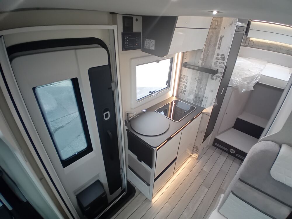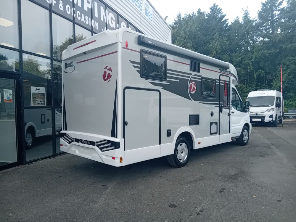 Caméra de recul grand angle, Essuie glace automatique, Frein à main électrique, Allumage automatique des feux, Régulateur de vitesse, 25 TH EDITION :, Motorisation 165 CV, Moustiquaire, Réfrigérateur trimixte 137 litres, Support tv, Panneau de commande CP PLUS, Feux antibrouillards, Store d'occultation cabine thermique, Skyroof, Panneau solaire 200W avec régulateur mppt, Prise de gaz et douchette extérieure, Écran tactile 12 CARPLAY, Lit de pavillon electrique, PTAC 3500 KG, Porte cellule XL avec fenêtre et fermeture centralisée, Store extérieur anthracite, Boite de vitesse automatique