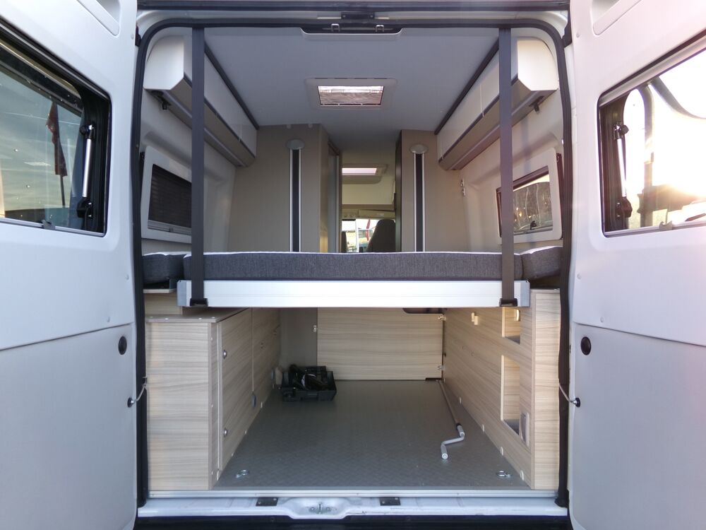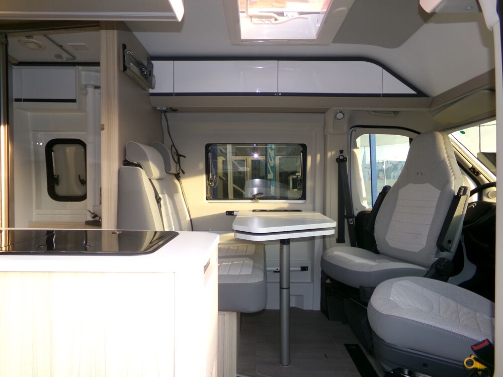 Toit panoramique, Rétroviseurs électriques, Store d'occultation fenêtres latérales dînette, Lit pavillon électrique, Volant et levier de vitesse en cuir, Porte cellule avec moustiquaire, Climatisation porteur, Radar de recul, Store d'occultation fenêtres latérales cabine, ABS + EBD, ESP, Régulateur et limiteur de vitesse, Airbag conducteur / passager, Store d'occultation pare-brise, Marche pied électrique, Chauffage gasoil