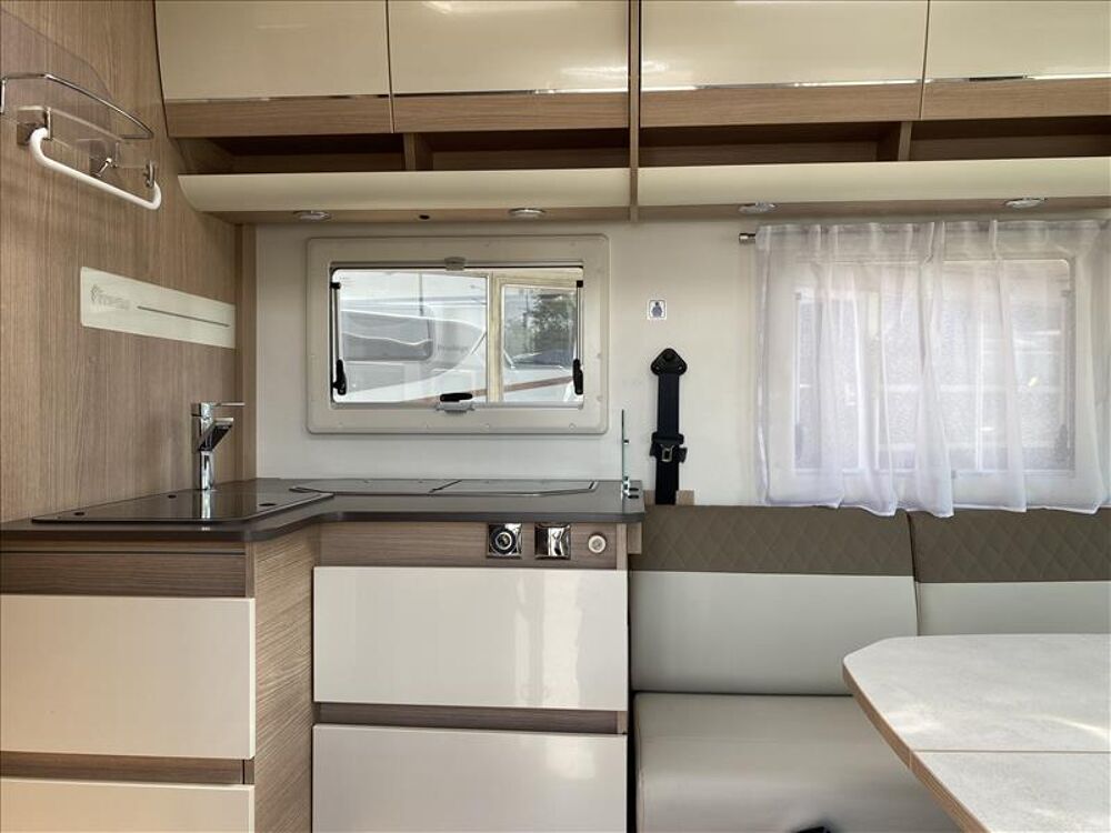 Pare-soleil mécanique à enrouleur, Plan de travail revêtu stratifié, Pompe à eau électrique, Pré-équipement douchette exterieur, Pré-équipement panneau solaire, Rangement en pied de lit, Lit central XXL : 160 x 195 cm, Meuble de rangement haut avec miroir, Mobilier avec porte de placard pavillon coloris blanc, Moustiquaire porte cellule, Obturateurs grilles du réfrigérateur (pour utilisation hiver, Voilage sur baie, Panneau solaire, Trappe accès maintenance Combiné chauffage-chauffe eau, Verrouillage centralisé des portes cellule et cabine, Pré-équipement paroi avec inserts pour porte vélo, Airbag conducteur, Airbag passager, Cabinet de toilette avec douche séparée, Rétroviseurs extérieurs électriques type BUS, Sièges cabine « CAPTAIN CHAIR » réglables en hauteur, Table portefeuille, Tableau de contrôle, Transformateur - chargeur à découpage, Rideau occultant tissu plissé tour de cabine, Réfrigérateur 150 L à sélection automatique des énergies, Barre de penderie / Etendoir à linge, Caméra de recul, Inverseur automatique TRUMA, Jauge de contrôle pour réservoirs eau propre et eaux usées, Kit de réparation de roue, WC cuve céramique à cassette extractible (19 litres), Antenne sat automatique, Combiné chauffage-chauffe eau TRUMA Combi 4, Store extérieur, Téléviseur, Combiné porte-épices / porte essuie-tout, Cuisine en L inversé, Disjoncteur Magnéto-thermique différentiel 30mA, Eclairage d'ambiance salon/cuisine/chambre, Emplacement TV avec pré-câblage - HDMI, Emplacement TV avec pré-câblage avec support TV, Freinage ABS, Housses de sièges cabine ambiance cellule, Lanterneaux panoramique salon, Lanterneaux transparents avec moustiquaire et occultation