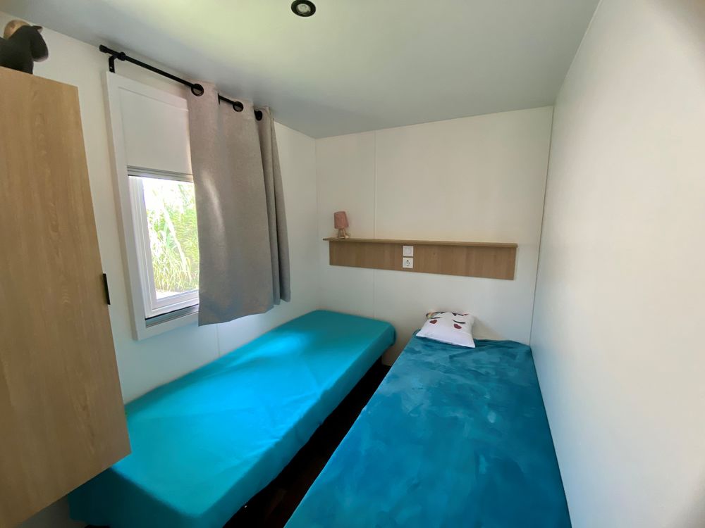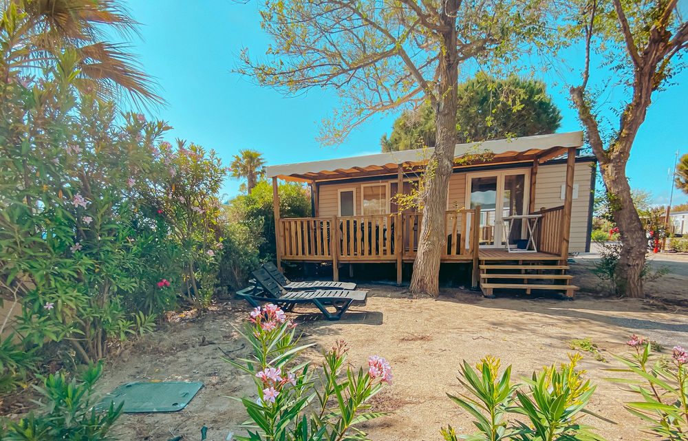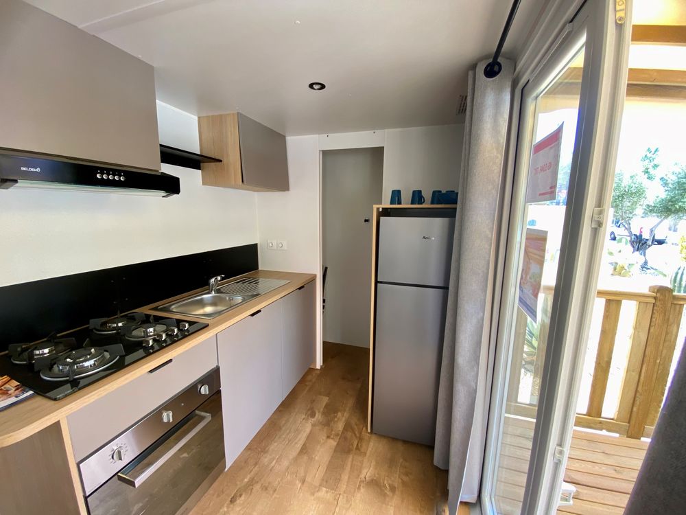 Superbe mobil-home à vendre sur village vacances 5 étoiles, le Marisol à Torreilles PlageMobil-home neuf fonctionnel et confortable. Le Calina est composé d'un salon avec une belle cuisine couloir ouverte sur l'extérieur, ainsi que de 2 chambres et 1 salles de bain. Vous pouvez donc accueillir jusqu'à 6 personnes grâce au canapé convertible.