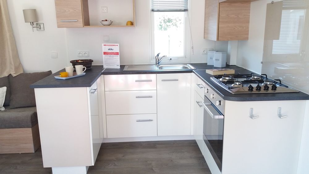 Le mobil home fait 40m², il est équipé de plusieurs options telles que la Hotte aspirant, un four encastré, une plaque de cuisson à gaz avec 4 bruleurs, un frigo, des radiateurs dans toutes les pièces, et un combiné store occultant/moustiquaire.