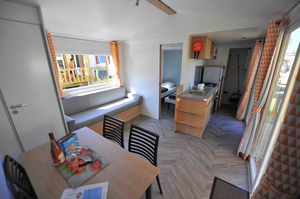 Vous disposez de deux portes-fenêtres, ce qui apporte une luminosité à l'intérieur du mobil-home. Avec sa cuisine ouverte sur la terrasse, vous pourrez participer à l'apéritif avec vos proches.