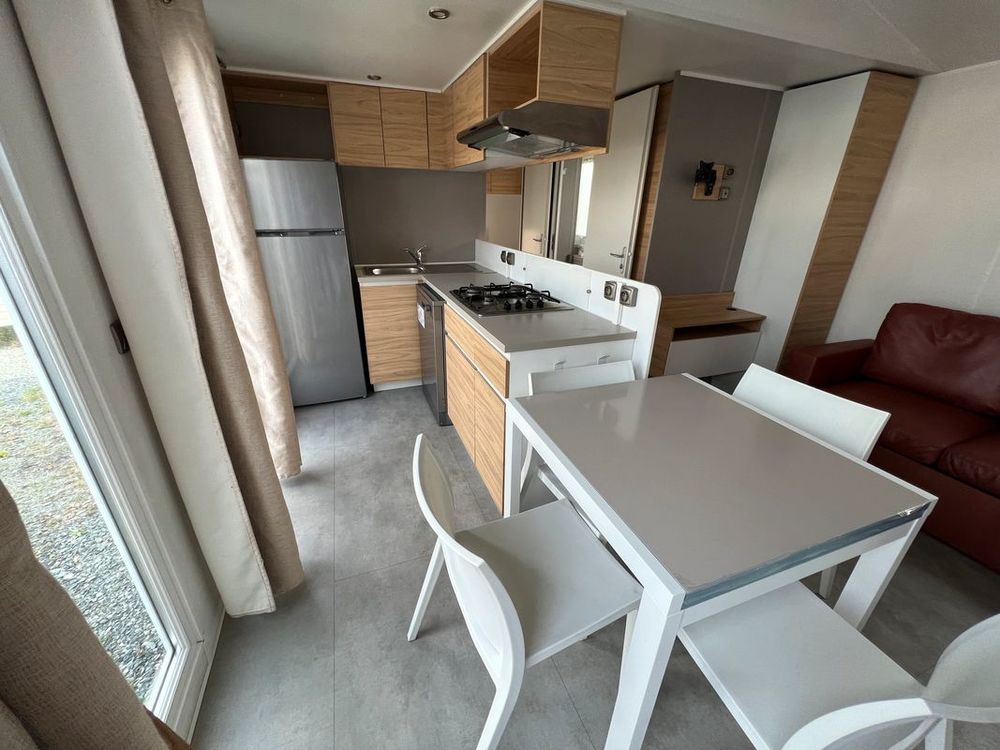 Mobil-home dans l'esprit camping, avec une cuisine tout équipé qui s'ouvre sur la terrasse, avec lave vaisselle, hotte.