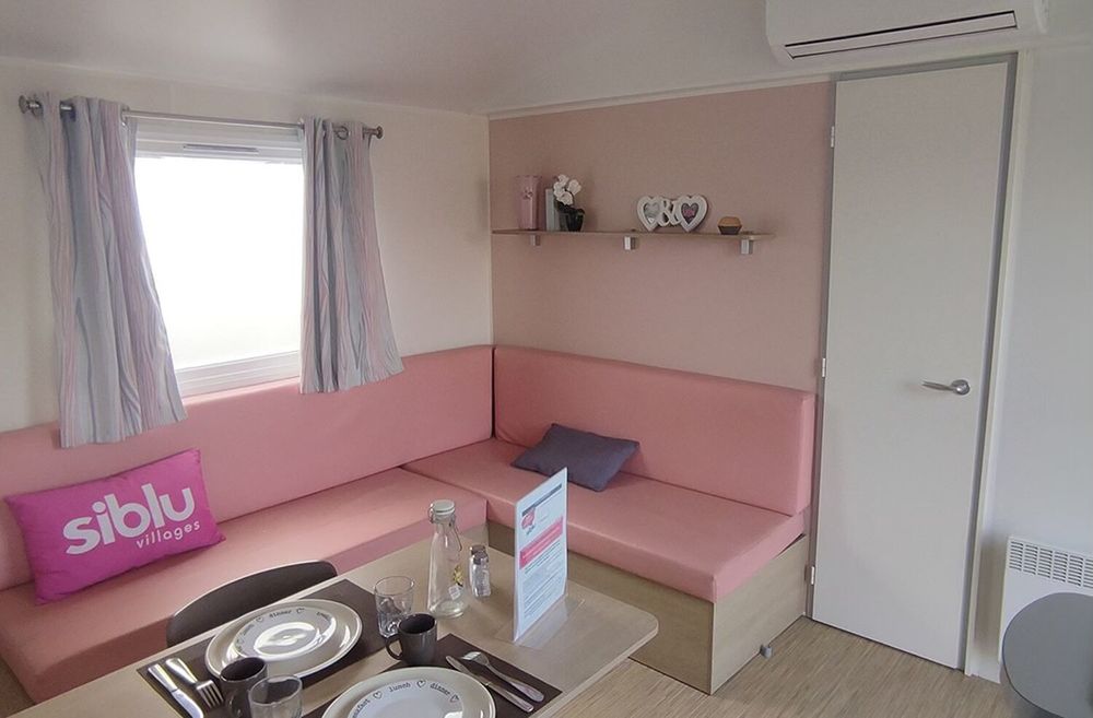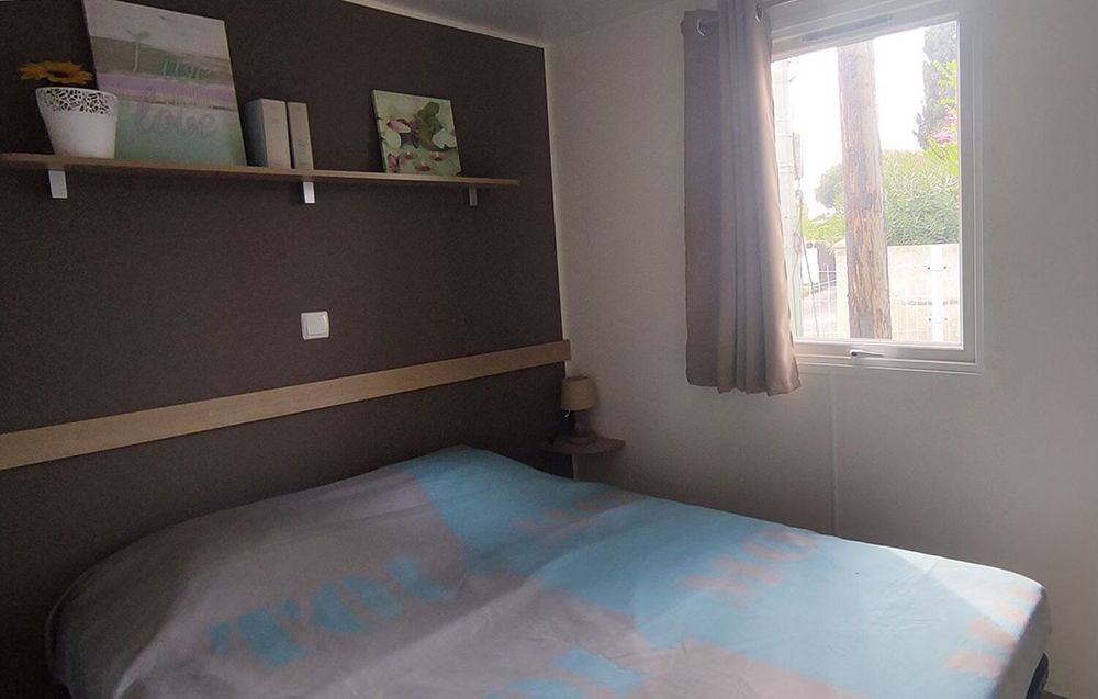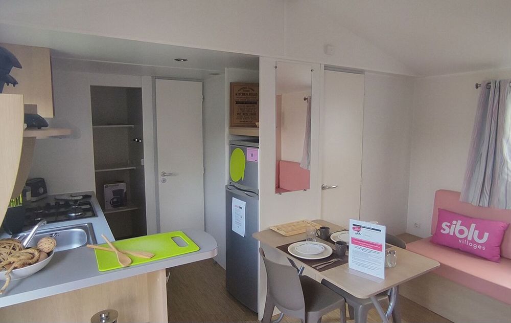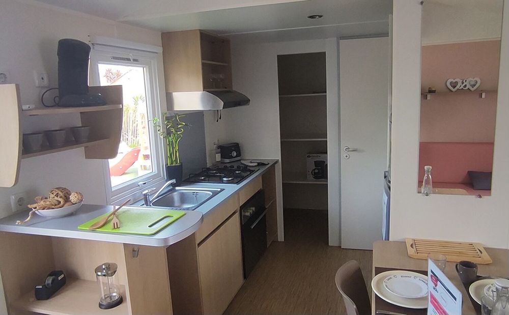 Mobil-home d'occasion en parfait état. Climatisation incluse dans le prix. Compact et bien agencé, il dispose de rangement comme un cellier dans la cuisine. 28m2, 2 chambres et 1 salle d'eau.