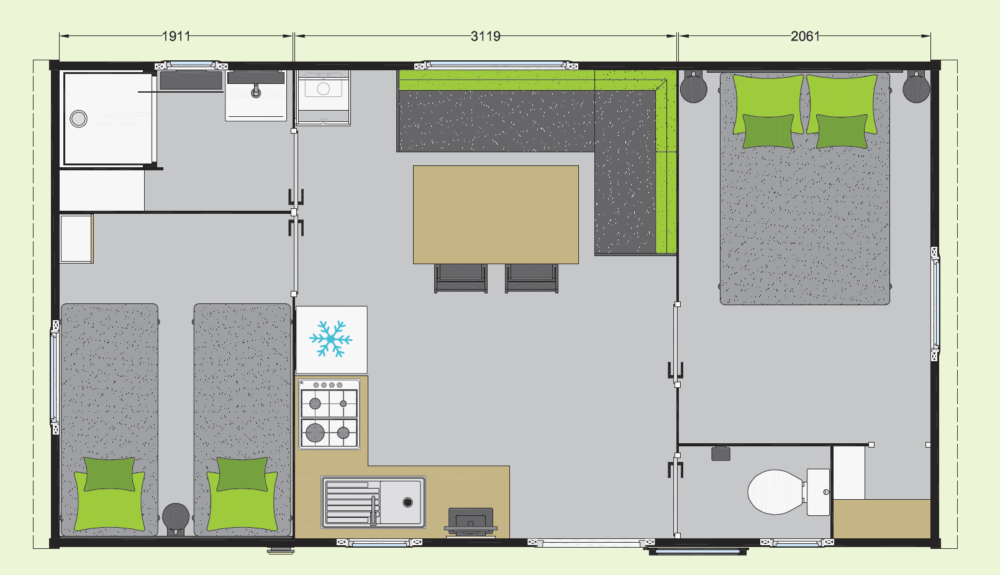 Situé sur l'une des parcelles du camping, le mobil-home se compose de :