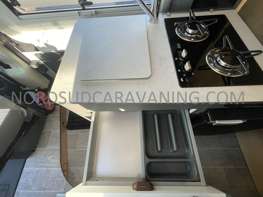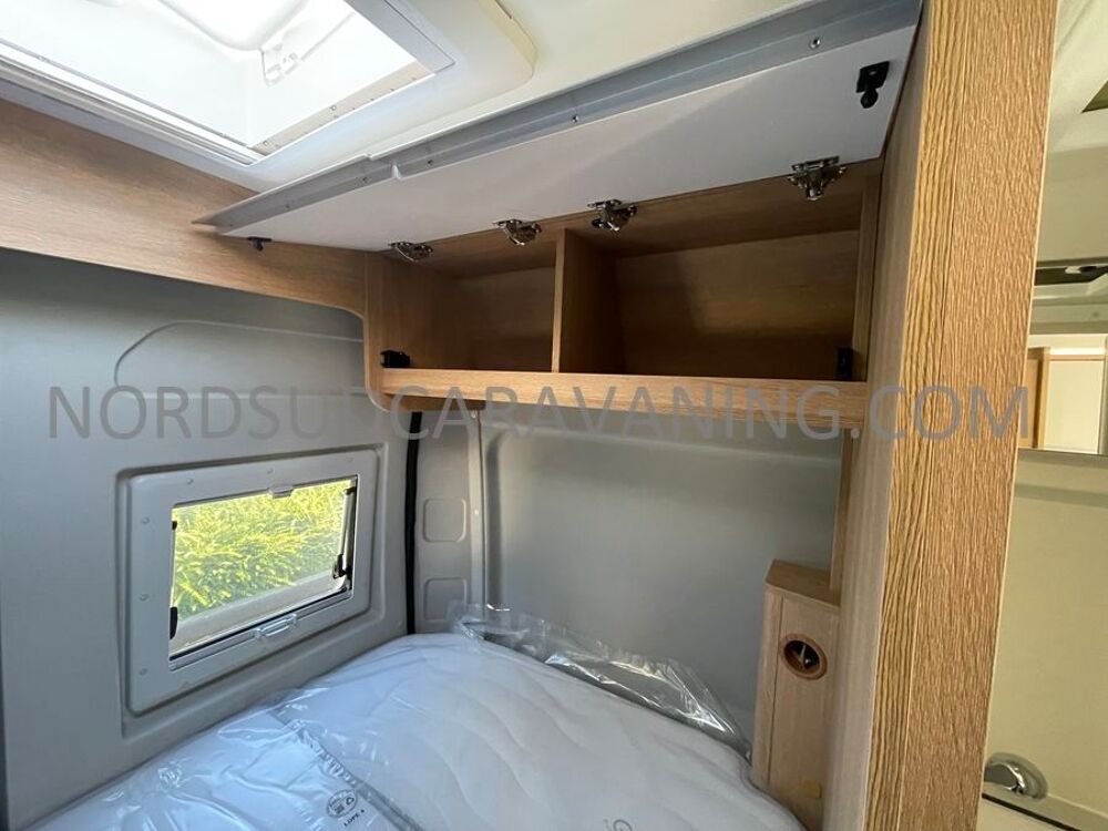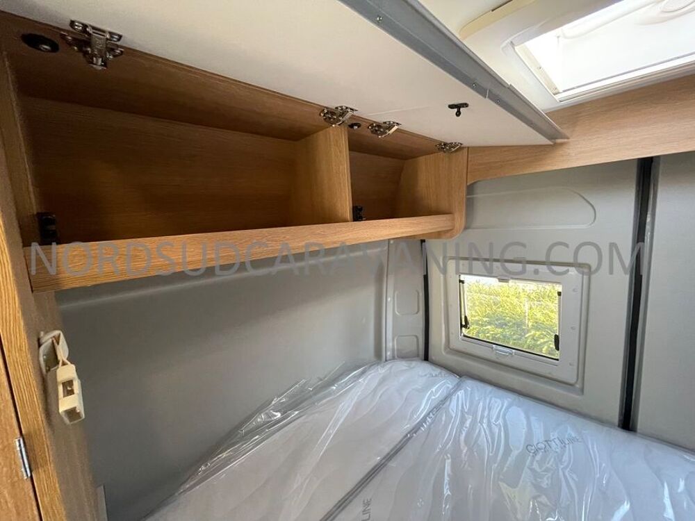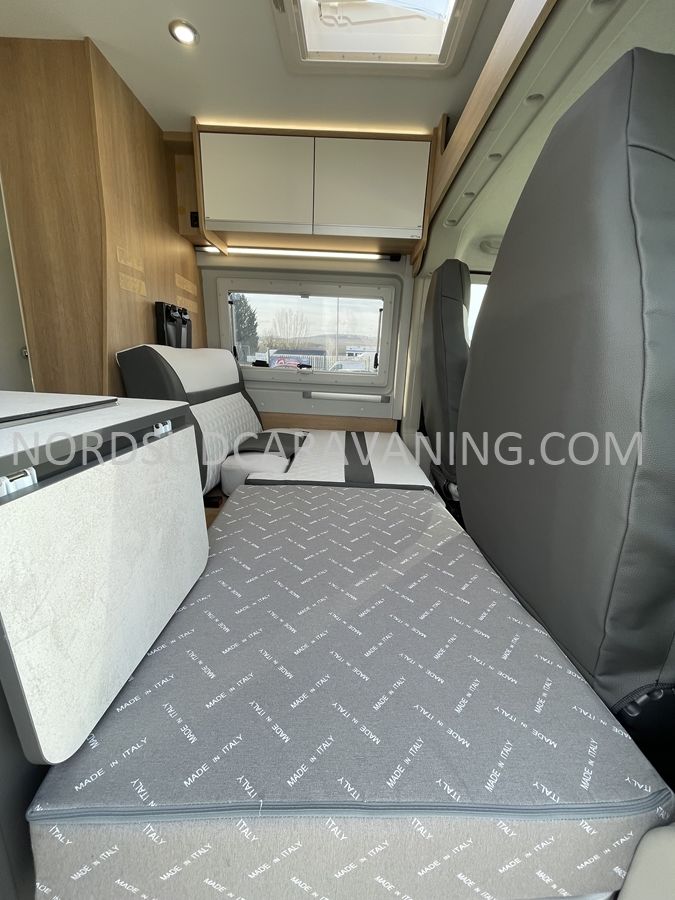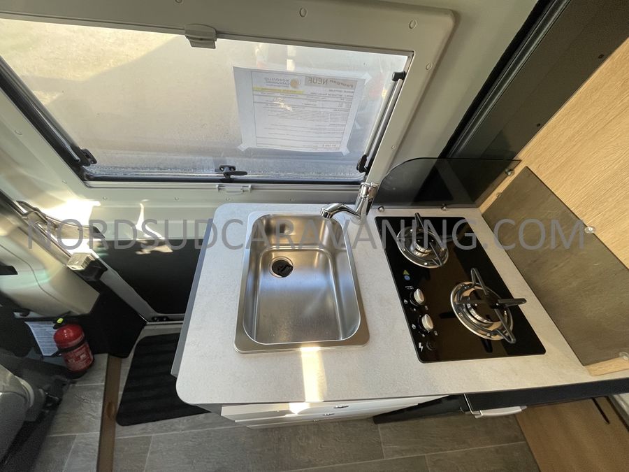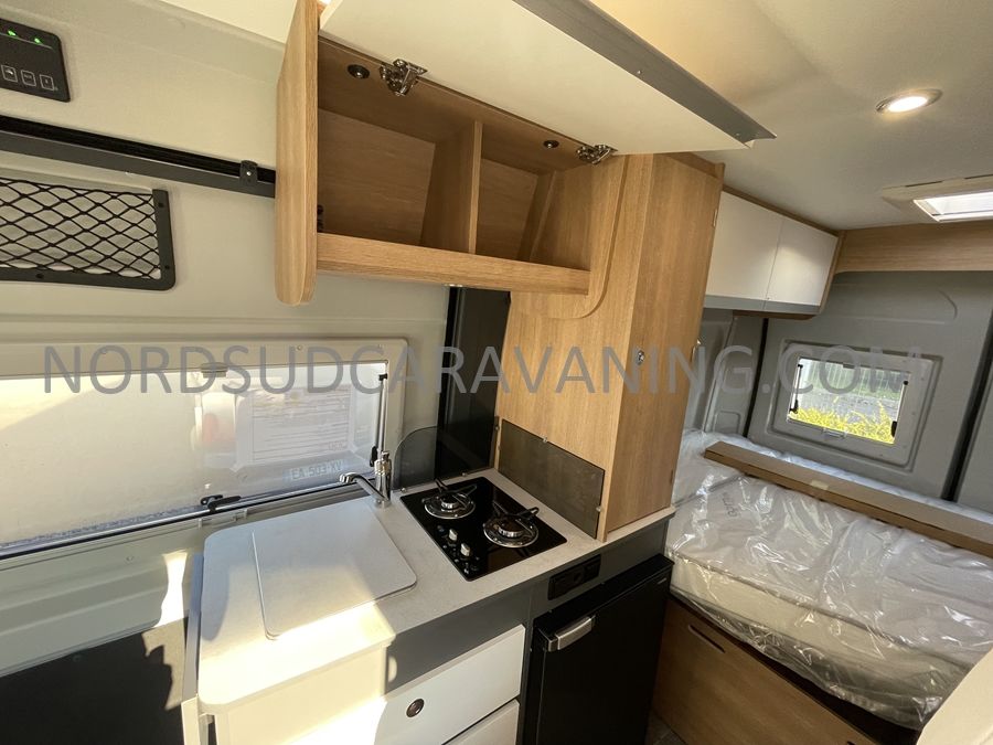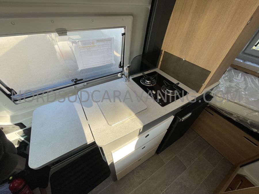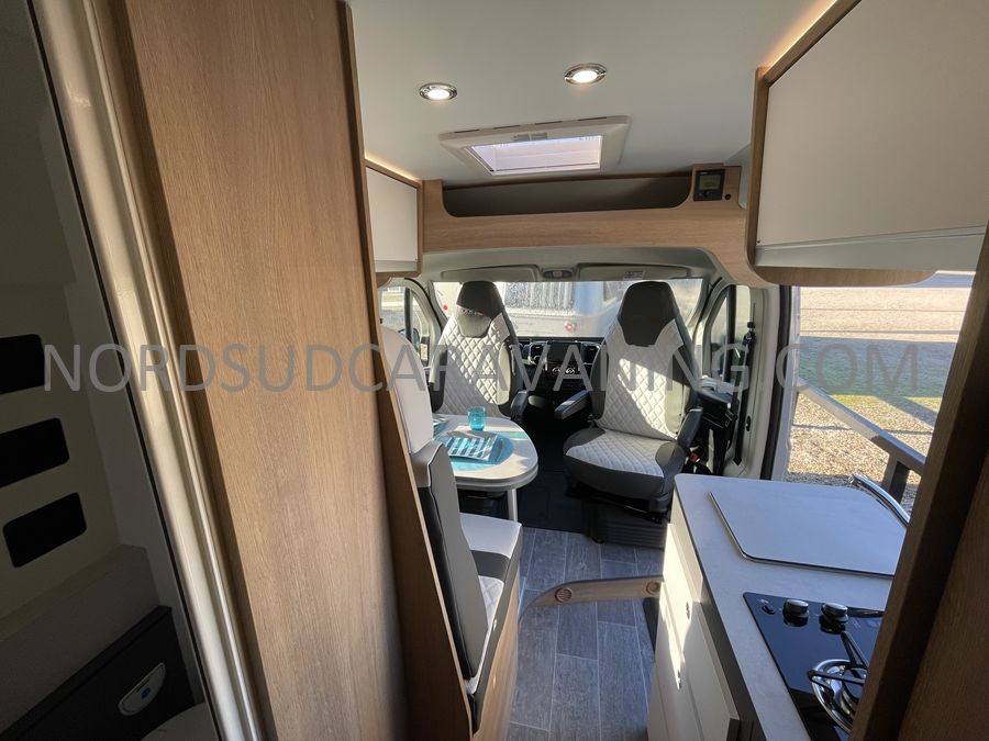 Sa dinette agréable et lumineuse se transforme en couchage d'appoint. Sa cuisine latérale pratique et fonctionnelle est équipée d'un réchaud 2 feux, évier et plan de travail rabattable. En face, une salle d'eau compacte tout-en-un qui ne manque de rien (Lavabo, miroir, WC, Douche). A l'arrière, c'est un couchage transversal confortable et agréable sur soute qui est proposé, vous permettant de ranger vos vélos, de retour de balades. Sans oublier ses nombreux rangements astucieux !
