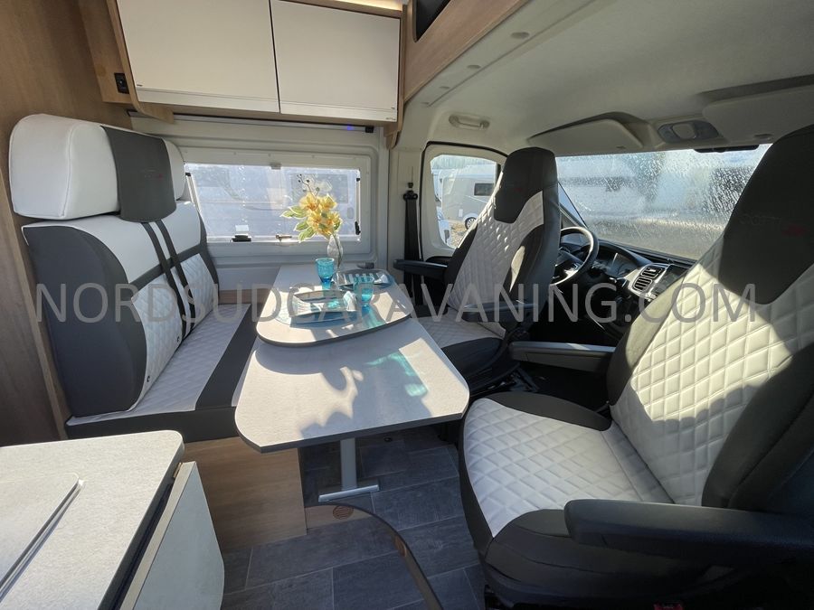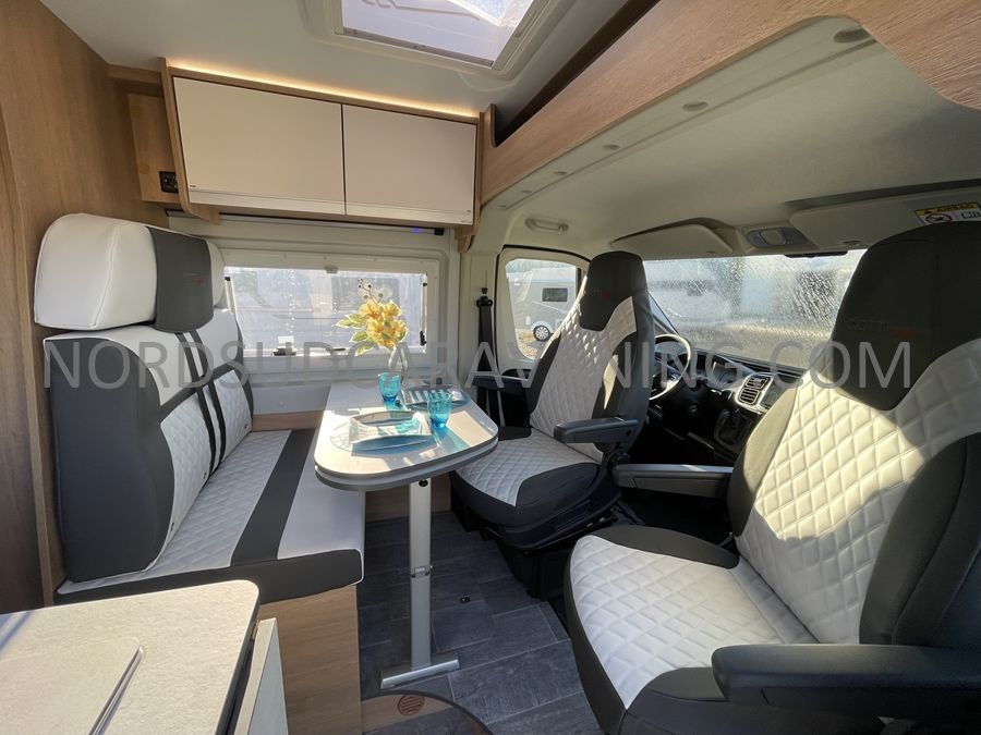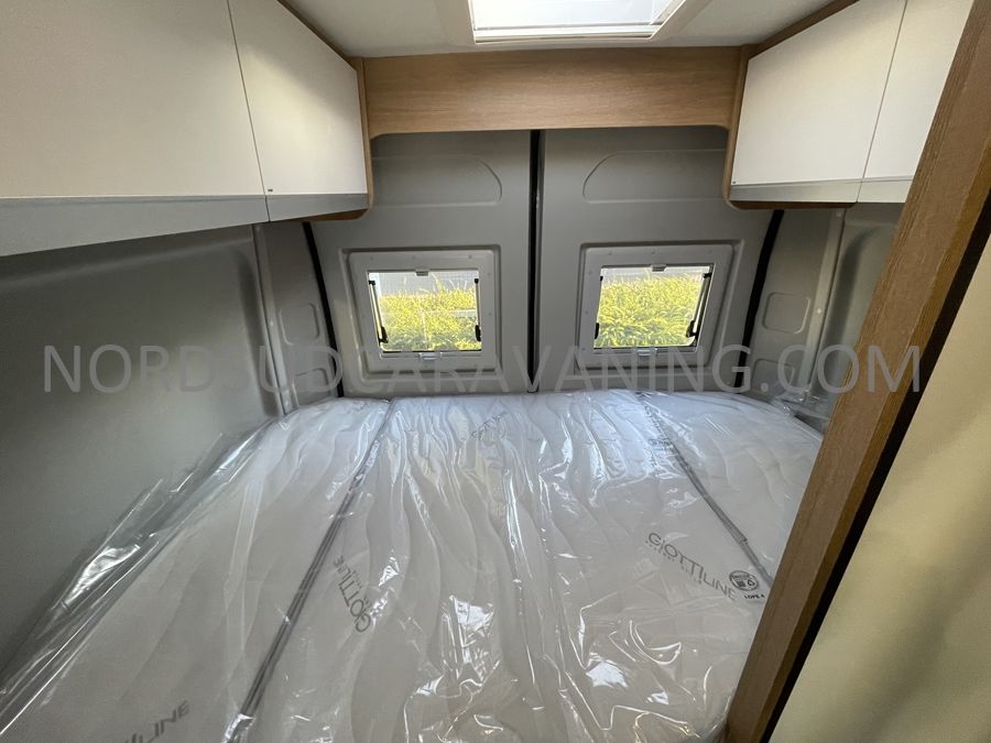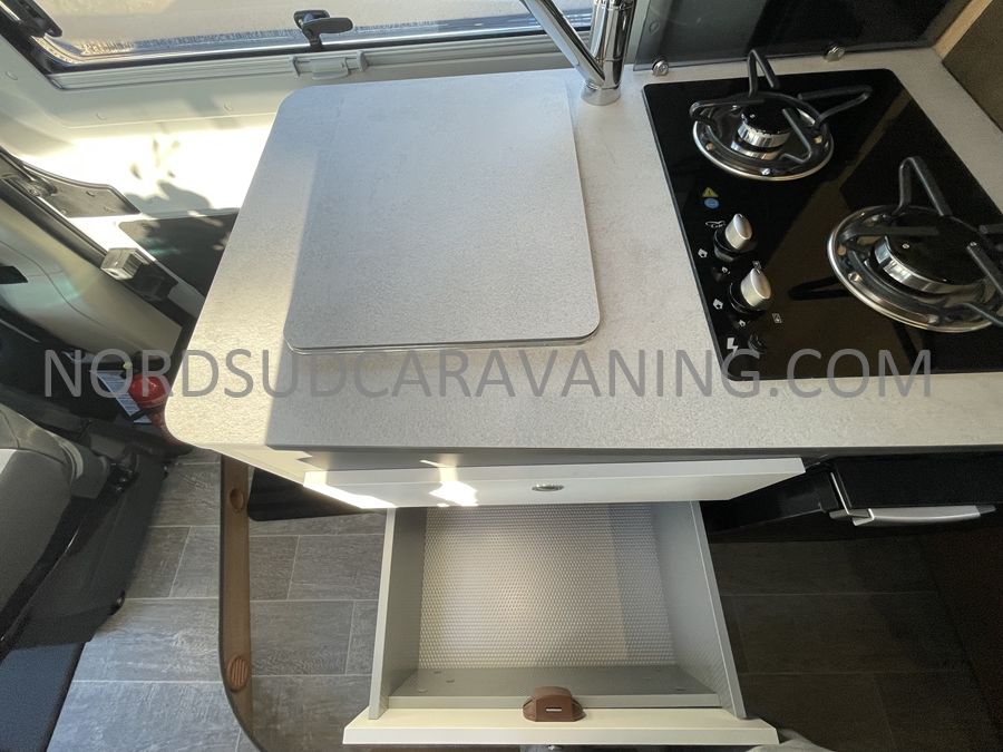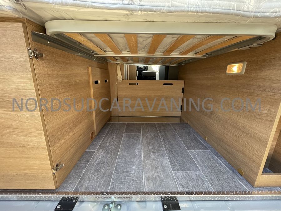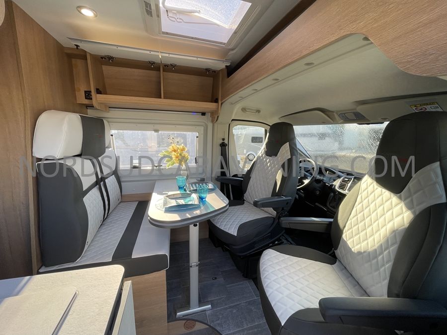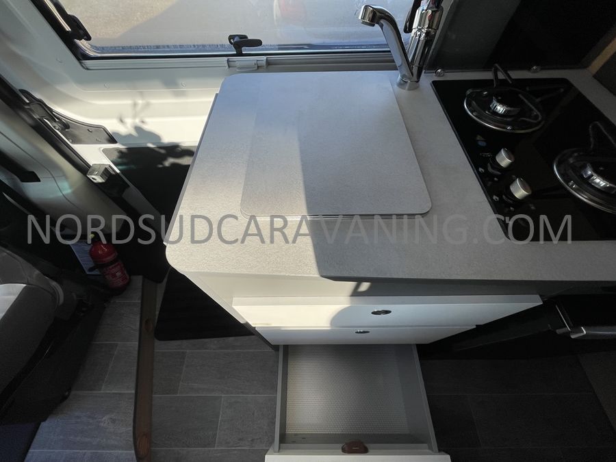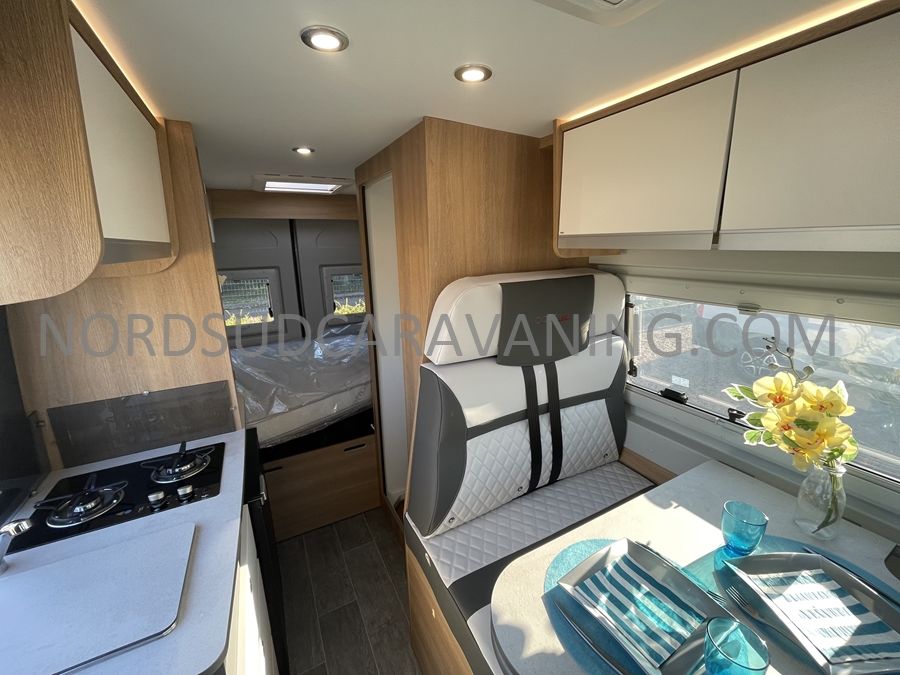 Sa dinette agréable et lumineuse se transforme en couchage d'appoint. Sa cuisine latérale pratique et fonctionnelle est équipée d'un réchaud 2 feux, évier et plan de travail rabattable. En face, une salle d'eau compacte tout-en-un qui ne manque de rien (Lavabo, miroir, WC, Douche). A l'arrière, c'est un couchage transversal confortable et agréable sur soute qui est proposé, vous permettant de ranger vos vélos, de retour de balades. Sans oublier ses nombreux rangements astucieux !