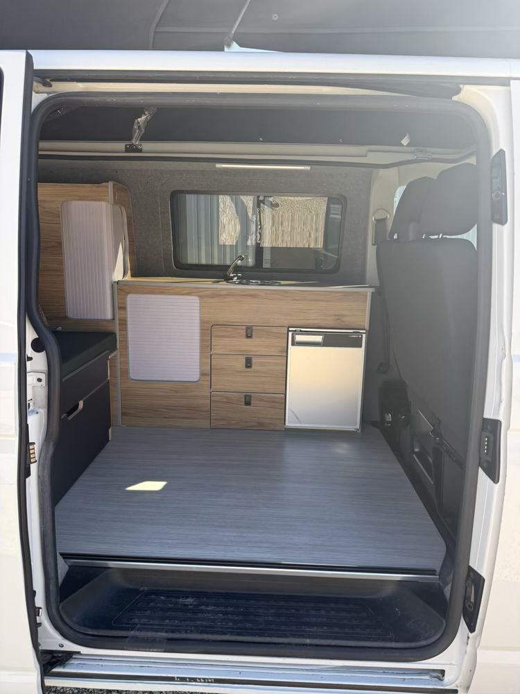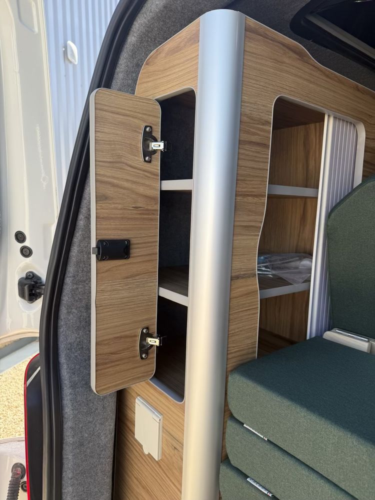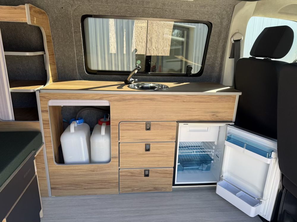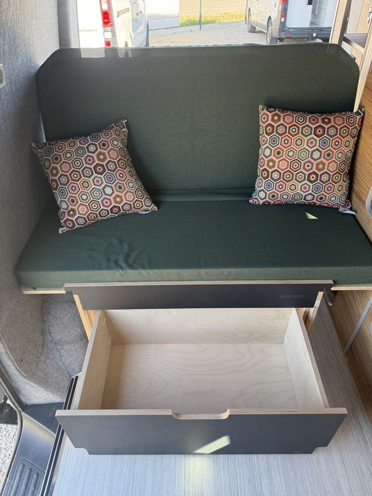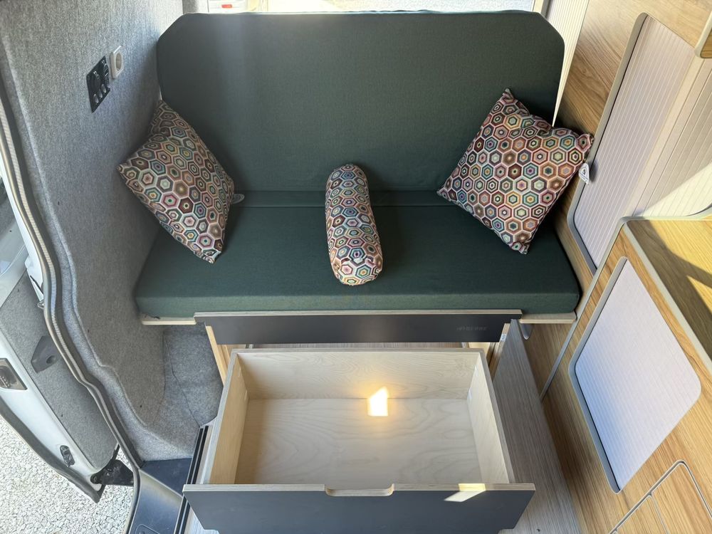 Vous pourrez y retrouver également un grand meuble avec un frigo à compression de 49l. Des rangements à l'arrière vous permettrons de stocker un WC chimique portatif si nécessaire.
