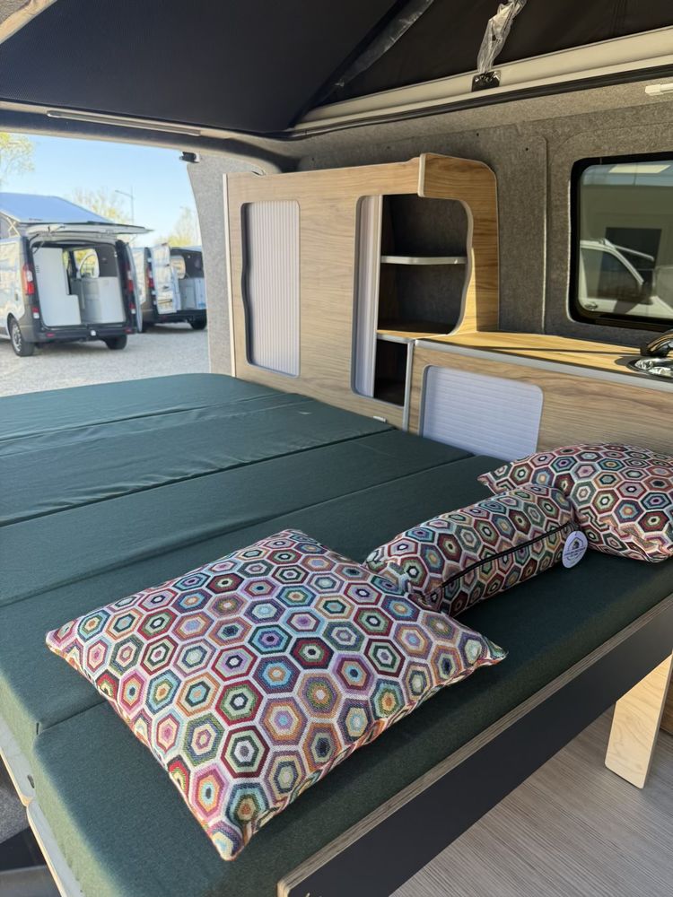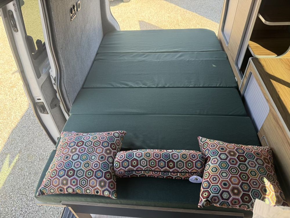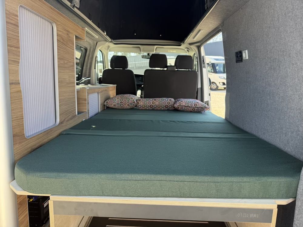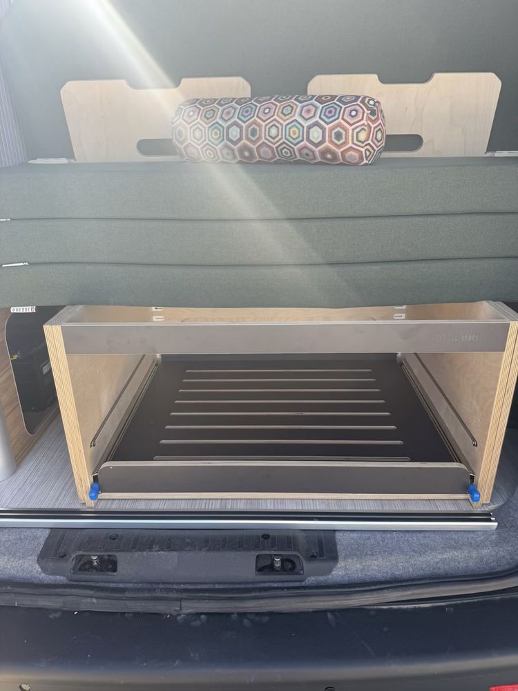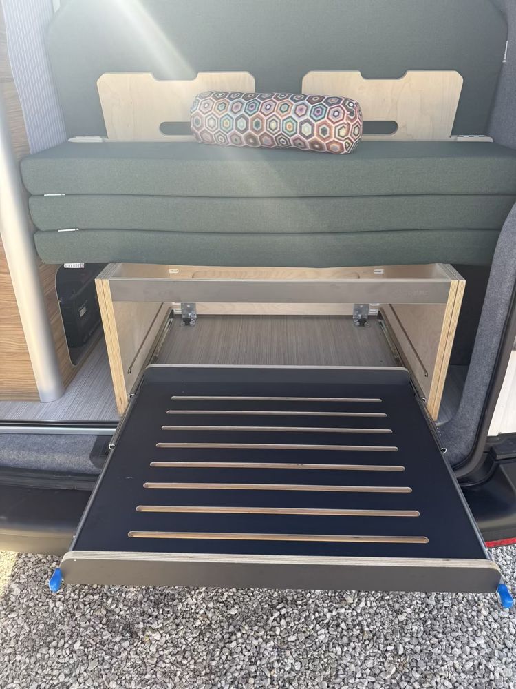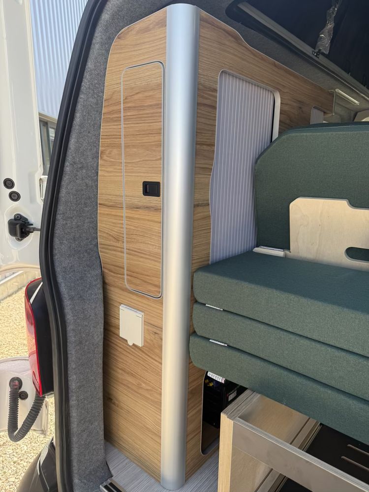 Vous pourrez y retrouver également un grand meuble avec un frigo à compression de 49l. Des rangements à l'arrière vous permettrons de stocker un WC chimique portatif si nécessaire.