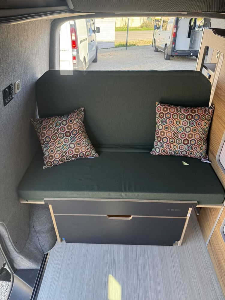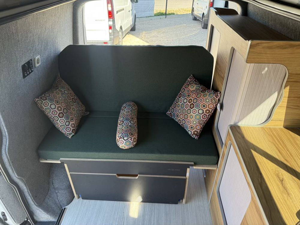 Une banquette arrière face route, transformable en lit, avec rangements en dessous, ouverture vers l'avant et l'arrière du véhicule.