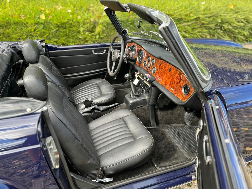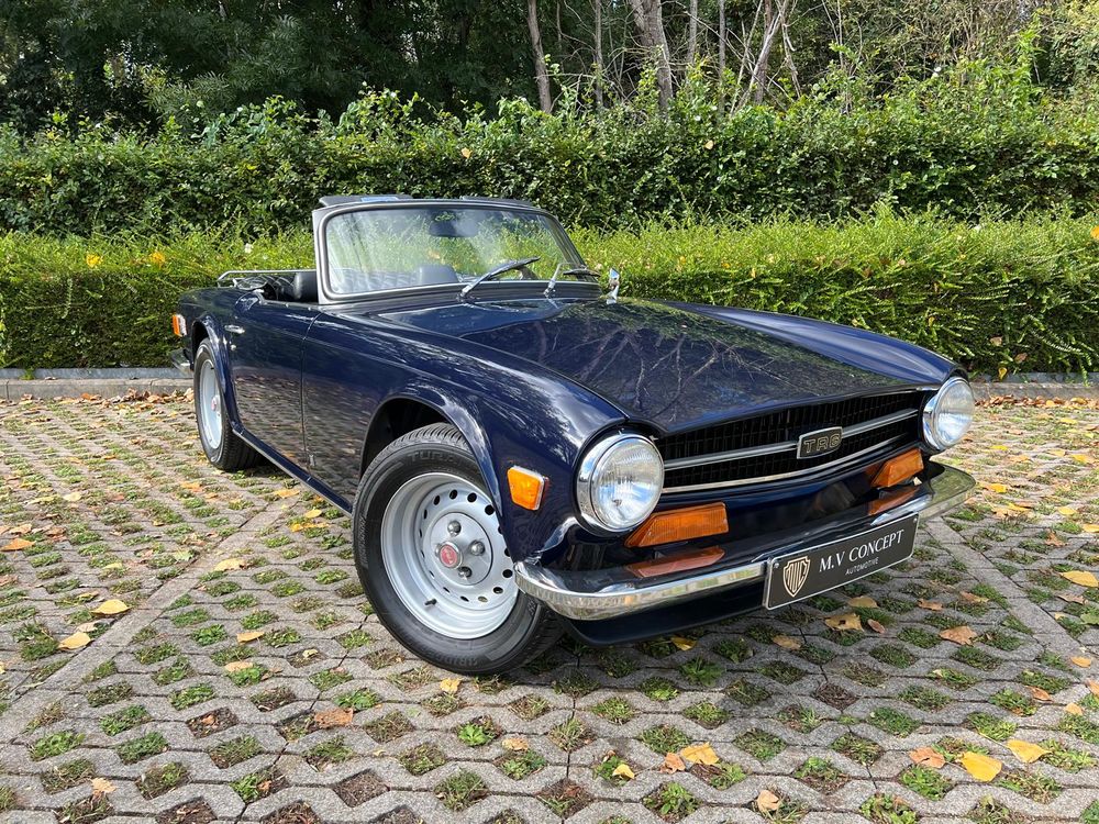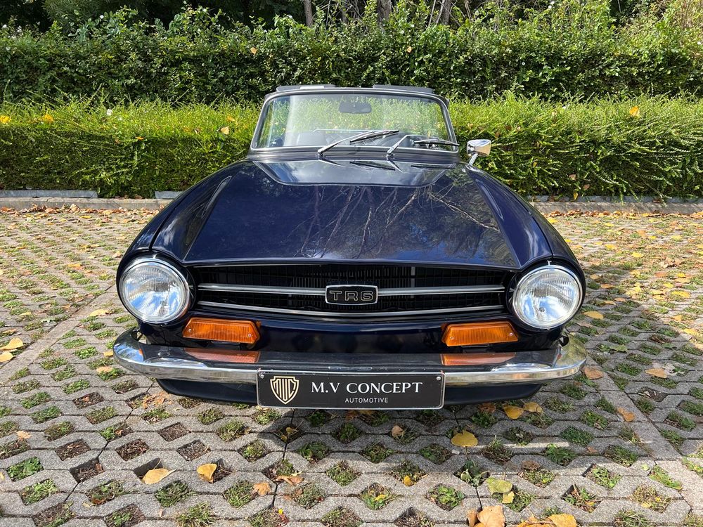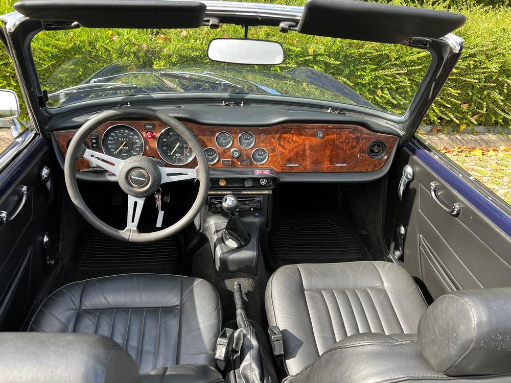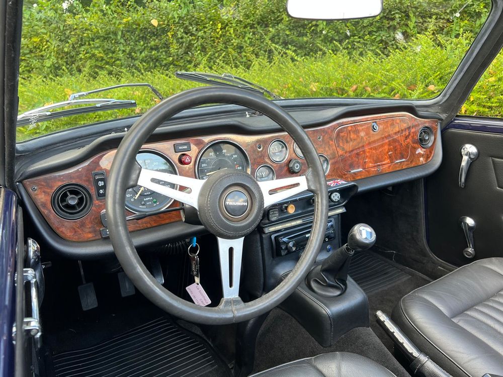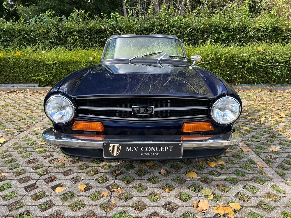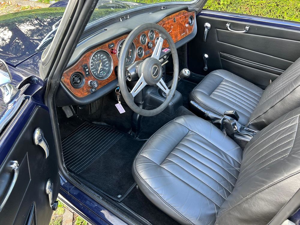 MV CONCEPT Automotive/OXOTO vous propose cette superbe Triumph TR6, millésime 1974, dans une configuration très élégante : bleu nuit, intérieur noir, avec son magnifique tableau de bord en ronce de noyer.