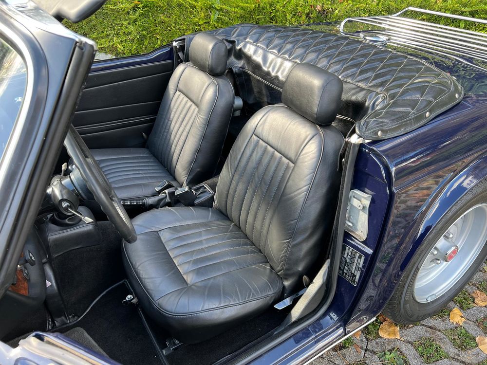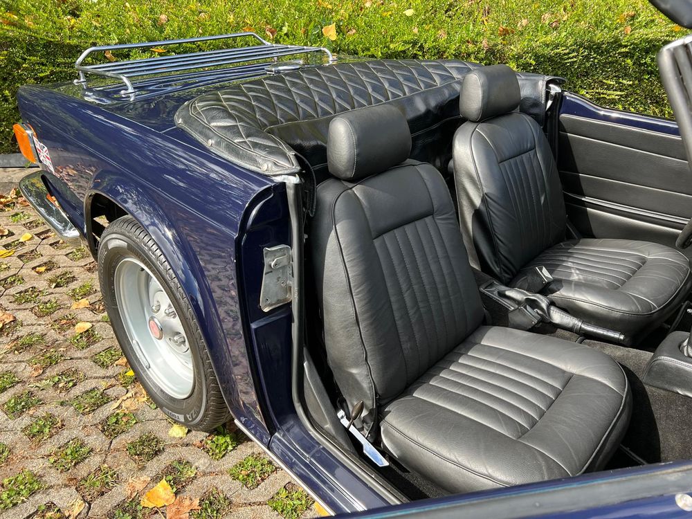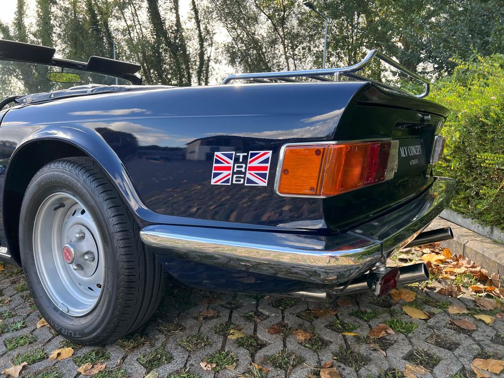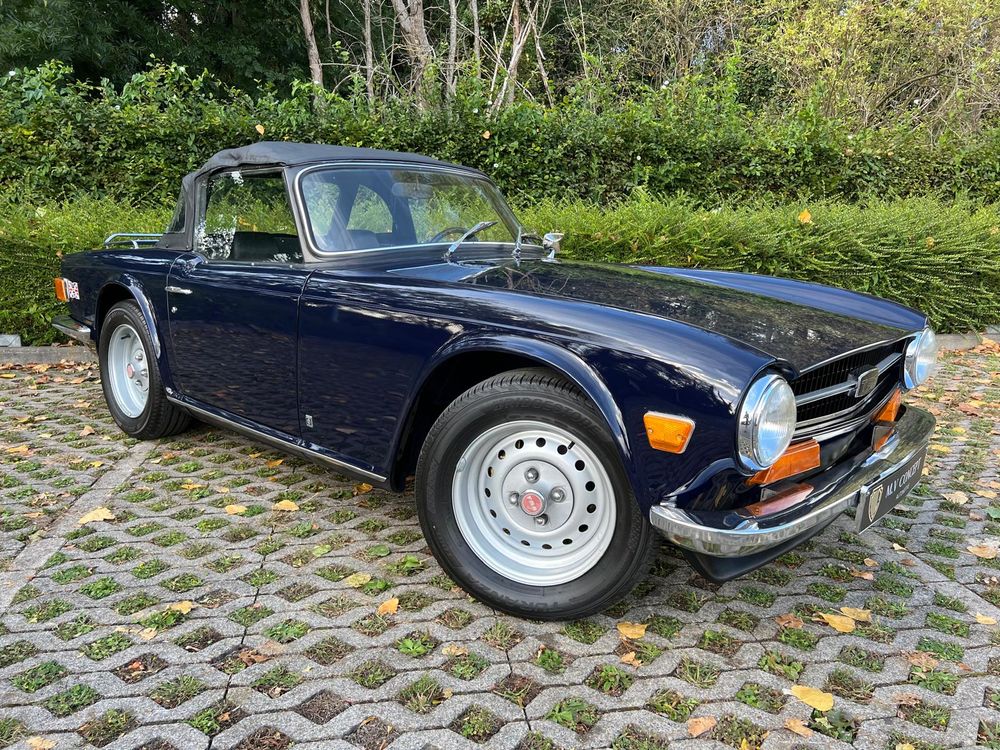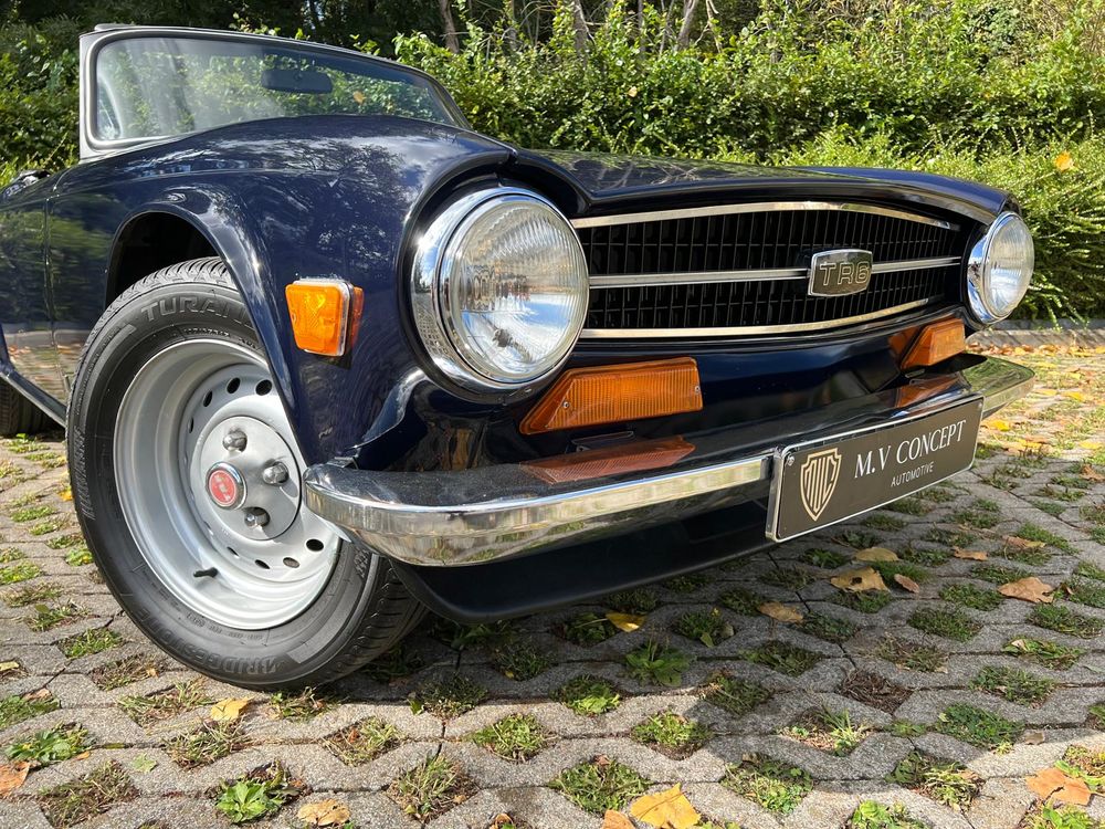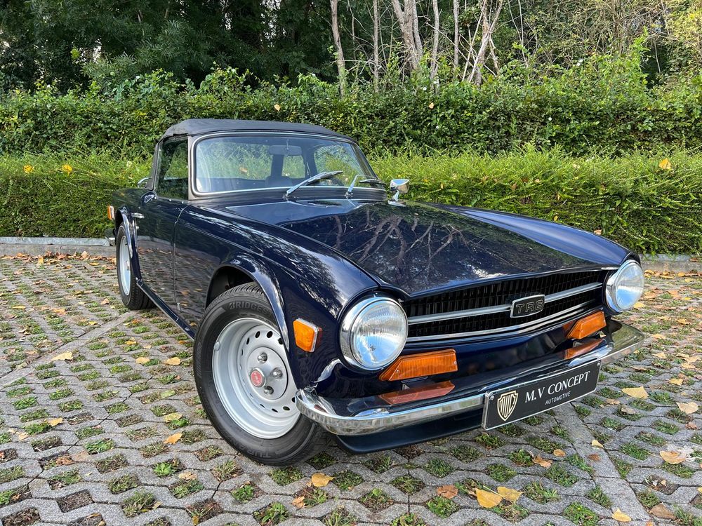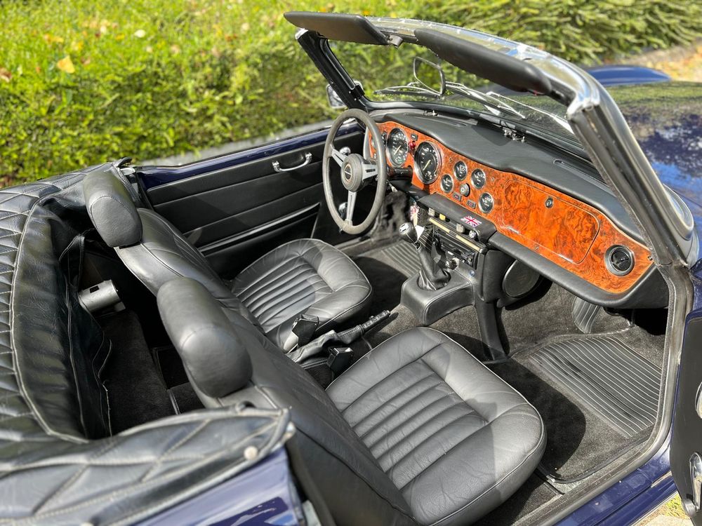 MV CONCEPT Automotive/OXOTO vous propose cette superbe Triumph TR6, millésime 1974, dans une configuration très élégante : bleu nuit, intérieur noir, avec son magnifique tableau de bord en ronce de noyer.