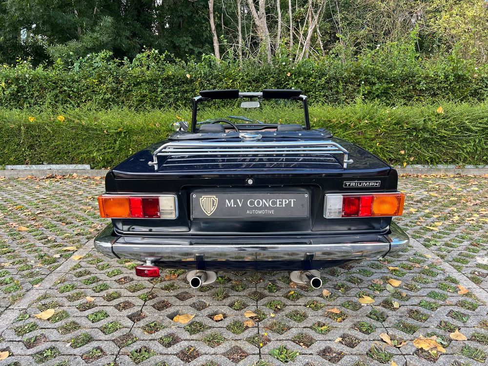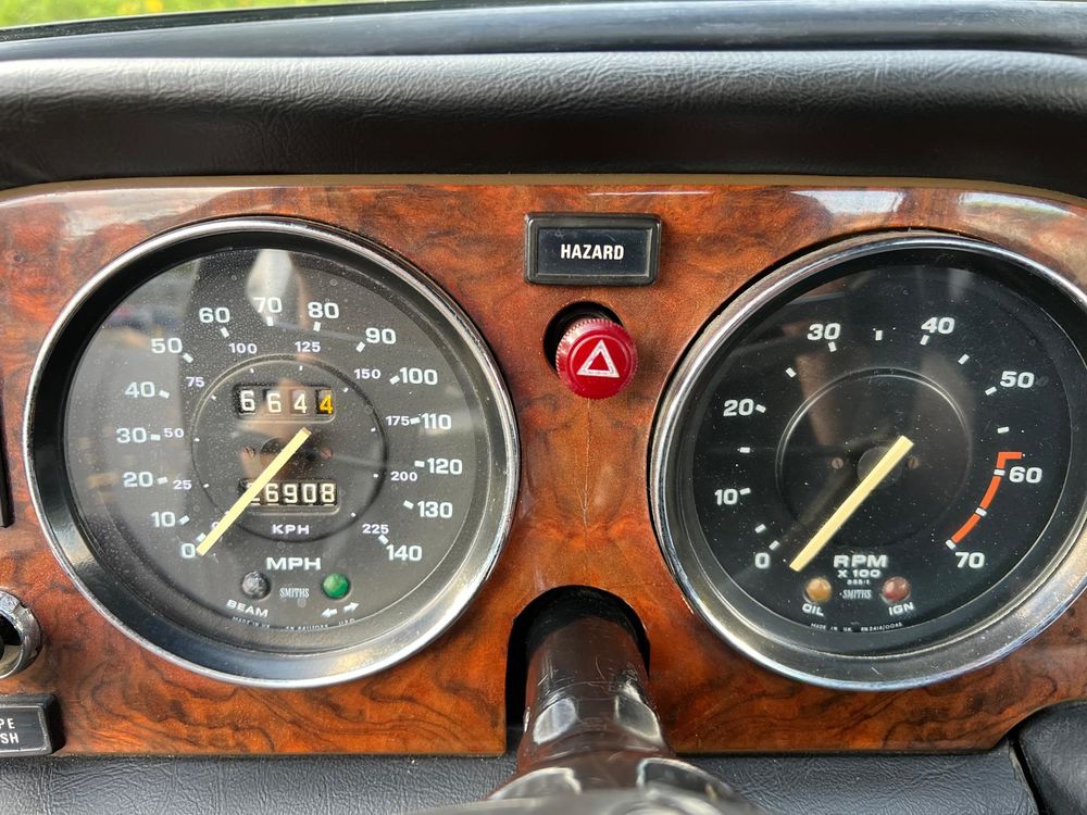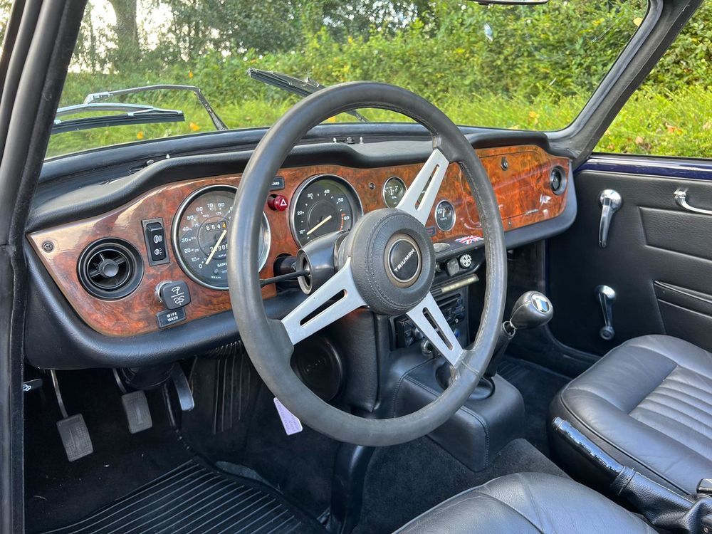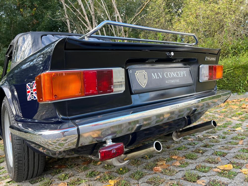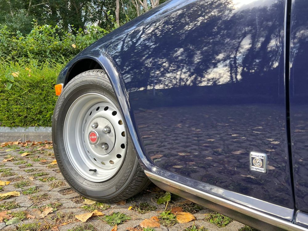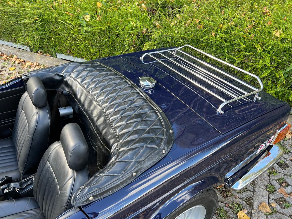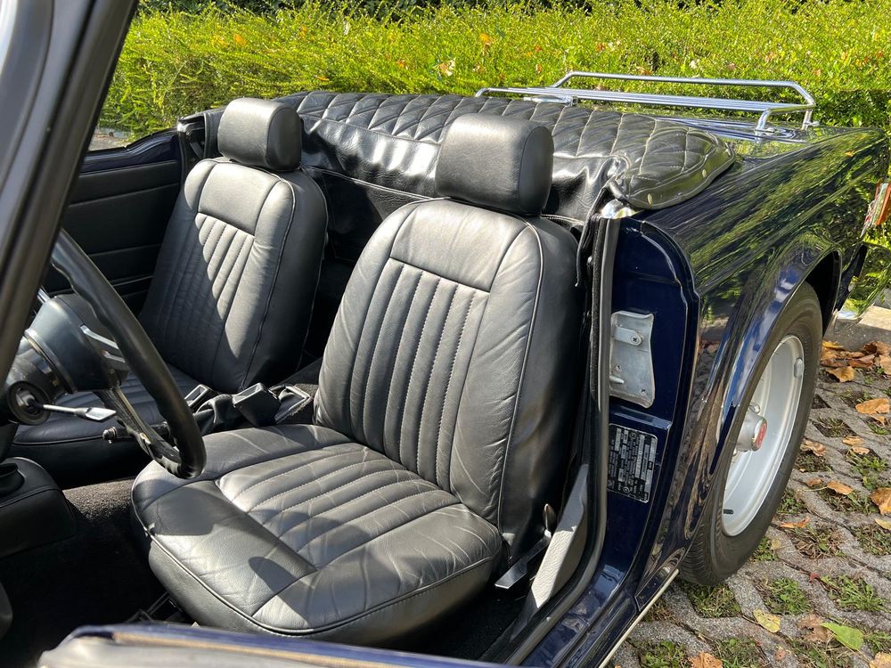 MV CONCEPT Automotive/OXOTO vous propose cette superbe Triumph TR6, millésime 1974, dans une configuration très élégante : bleu nuit, intérieur noir, avec son magnifique tableau de bord en ronce de noyer.
