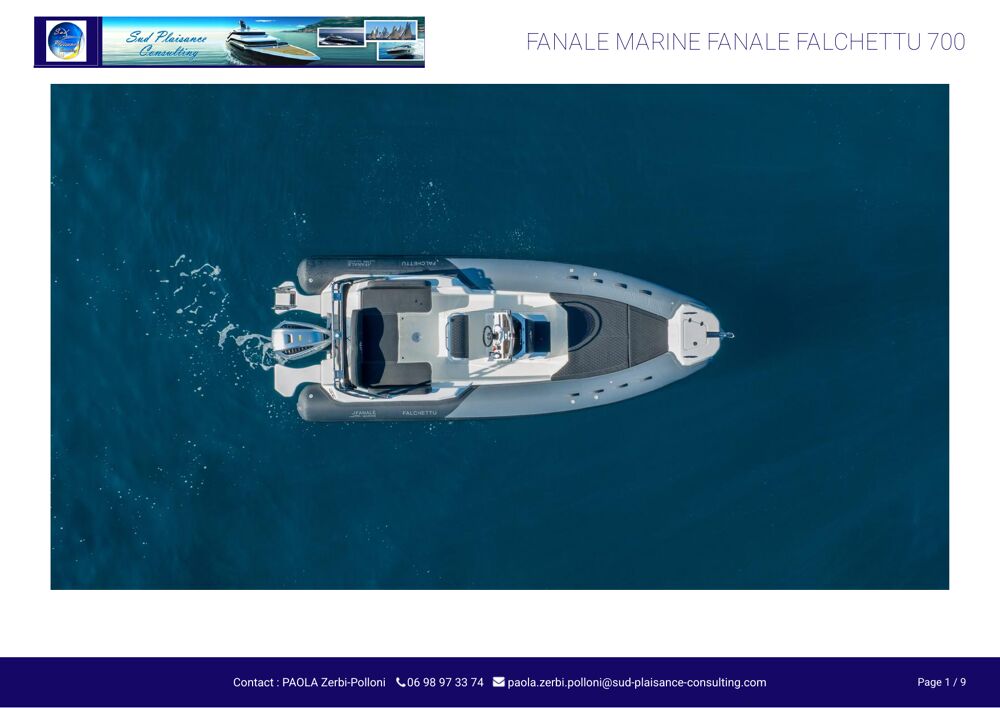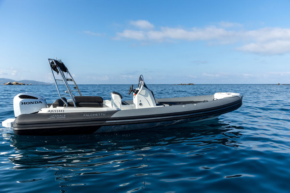 Lignes tendues, flotteurs finition carbone, poste de pilotage épuré : ce semi-rigide de 7 mètres attire immédiatement le regard. Construit en 2023, le Falchettu 700 incarne le parfait équilibre entre élégance, performance et fonctionnalité.