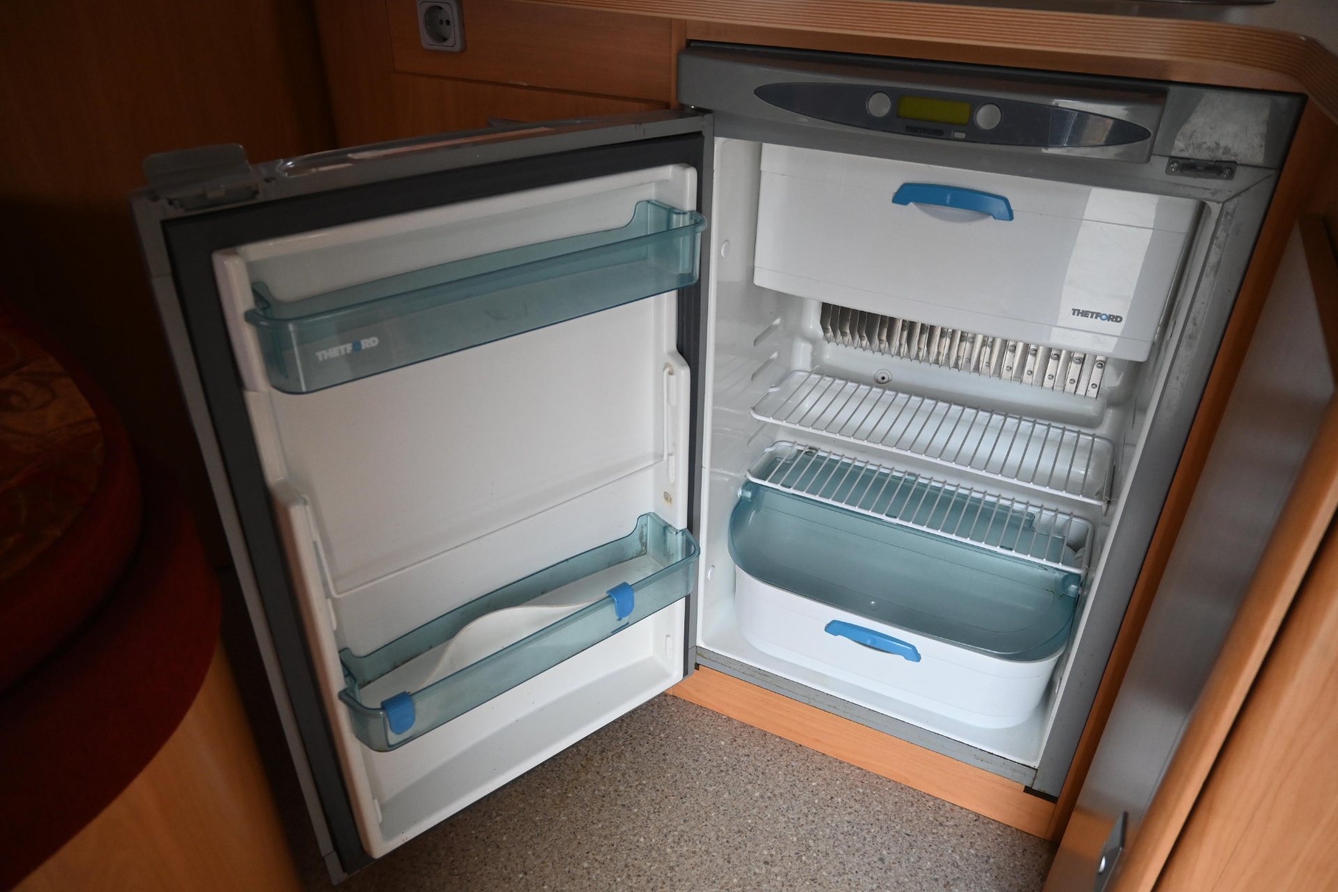- Cuisine droite avec tiroirs (réfrigérateur Trimix 88L, plaques gaz 3 feux, évier inox)