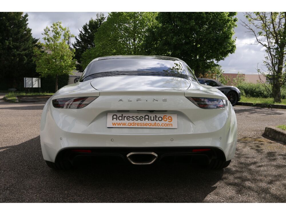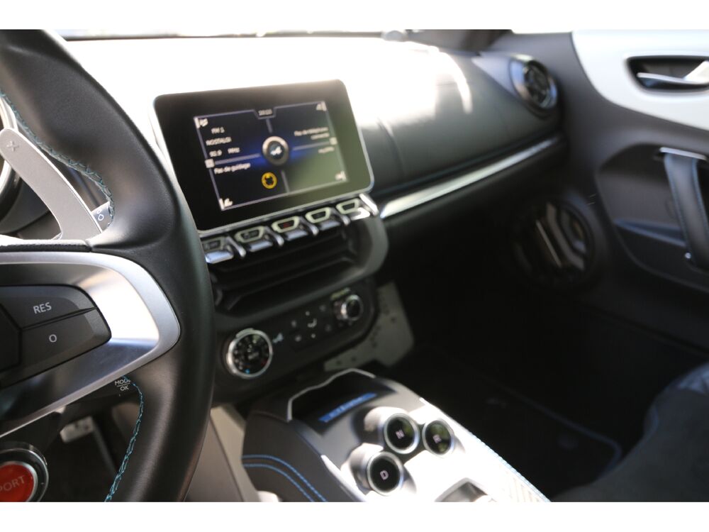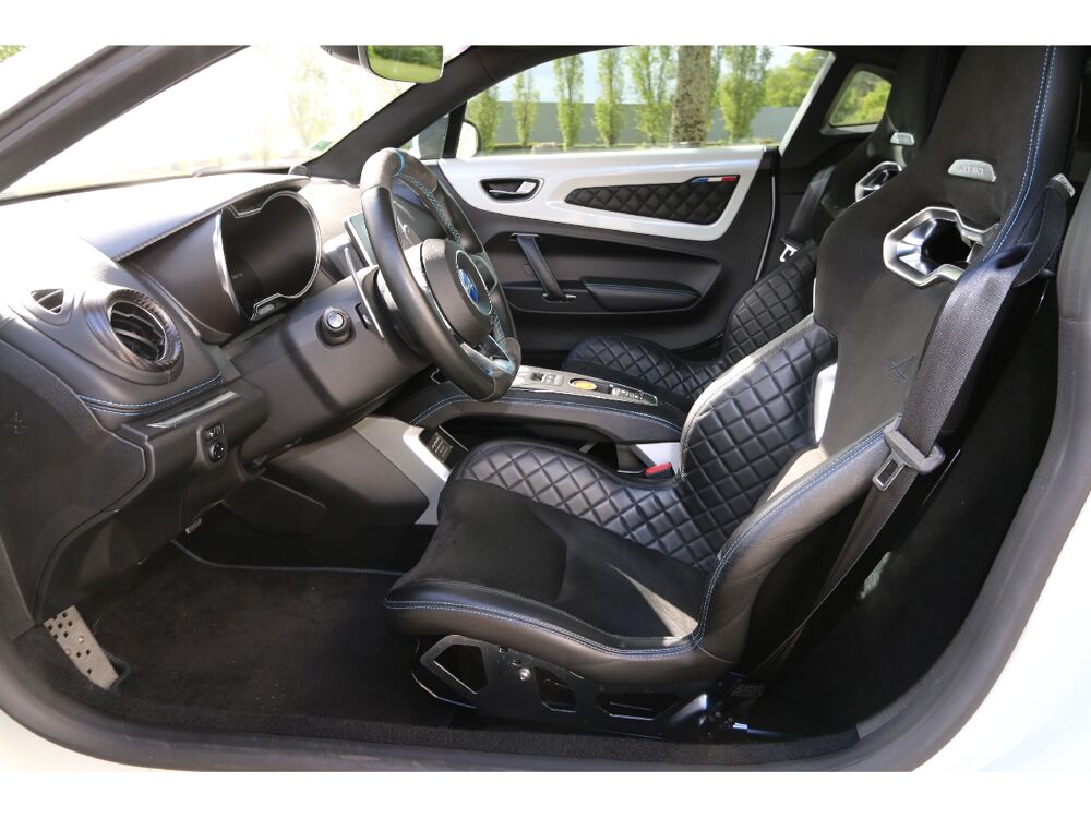 4 projecteurs AV à LED, Airbag passager déconnectable, Airbags frontaux conducteur et passager, Allumage des feux et essuie-glace automatiques, Assistance au freinage d'urgence, Avertisseur sonore bi-ton, Baguette de la planche de bord chrome satiné, Capteurs de pression des pneumatiques, Ciel de toit en tissu, Climatisation automatique avec filtre à particules, Couronne du volant en cuir, Cuir Noir et microfibre, Drapeaux français sur les panneaux de porte, Drapeaux français sur montants de lunette AR, Echappement Sport activable en fonction du mode sélectionné, Ecran 7", ESP déconnectable, Etriers de frein Bleu Alpine, Feu diurne à LED, Grille du bouclier et diffuseur AR en noir satiné, Indicateur de changement optimal des rapports, Insert de la console centrale en carbone mat, Intérieur Noir Titane, Jantes Csaba 18" en aluminium forgé noir diamanté, Kit anti-crevaison, Lève-vitres éléctriques à impulsion, Logo Alpine du volant en Bleu, Logo Alpine sur les ailes AV, Pédalier Sport en aluminium, Radars de stationnement AR, Rappel sonore d'oubli de la ceinture de sécurité conducteur, Rappel teinte carrosserie sur la partie supérieure des panneaux de porte, Régulateur de vitesse avec fonction limiteur, Répétiteurs latéraux de changement de direction, Rétroviseur intérieur électrochrome, Rétroviseurs extérieurs rabattables électriquement, avec fonction de dégivrage, Sélecteur de mode (Normal, Sport, RACE), Système Alpine Multimedia, Système d'antiblocage des roues ABS, Système de freinage Haute-Performance, Tapis de sol, gansés de cuir et badge Alpine, Troisième feu stop intégré dans la lunette AR, Vitres teintées, 7 vitesses, 2 places, puissance fiscal : 15, puissance din : 252, émission de CO2 : 138 g/km.
