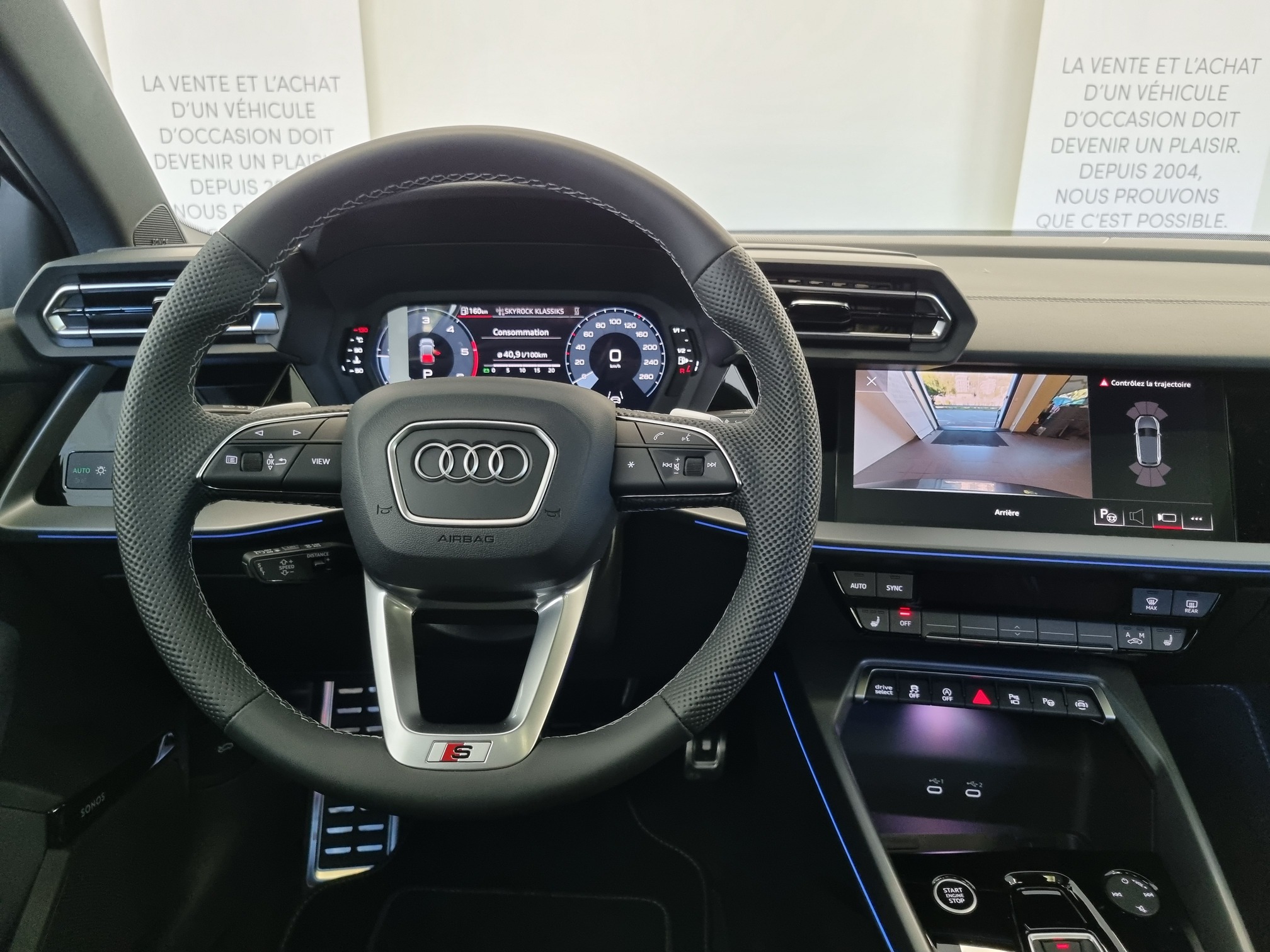 inclinaison réglable, Audi Connect Appel d'urgence & Service, Audi Connect Navigation et Divertissement, Audi Drive Select, Audi smartphone interface, Audi sound system : 10 HP incluant un HP central et un subwoofer, amplificateur à 6 canaux avec une puissance totale de 180 watts, Audi virtual cockpit, Ciel de pavillon en tissu Noir, Clé à fréquence radio (sans safelock), Climatisation automatique confort 2 zones, Direction assistée électromécanique, asservie à la vitesse, Dossier de banquette AR rabattable en deux parties 40:60, Eclairage intérieur, Interface Bluetooth, Navigation MMI plus avec MMI touch, Pack intérieur S line, Pare-brise à vitrage acoustique, Préparation pour appareil de navigation, Rappel de ceinture de sécurité avec dispositif AR de détection d'occupation du siège, Réception radio numérique (DAB), Rétroviseur intérieur jour/nuit automatique sans encadrement, Rétroviseurs extérieurs réglables, dégivrants, rabattables électriquement avec fonction r...