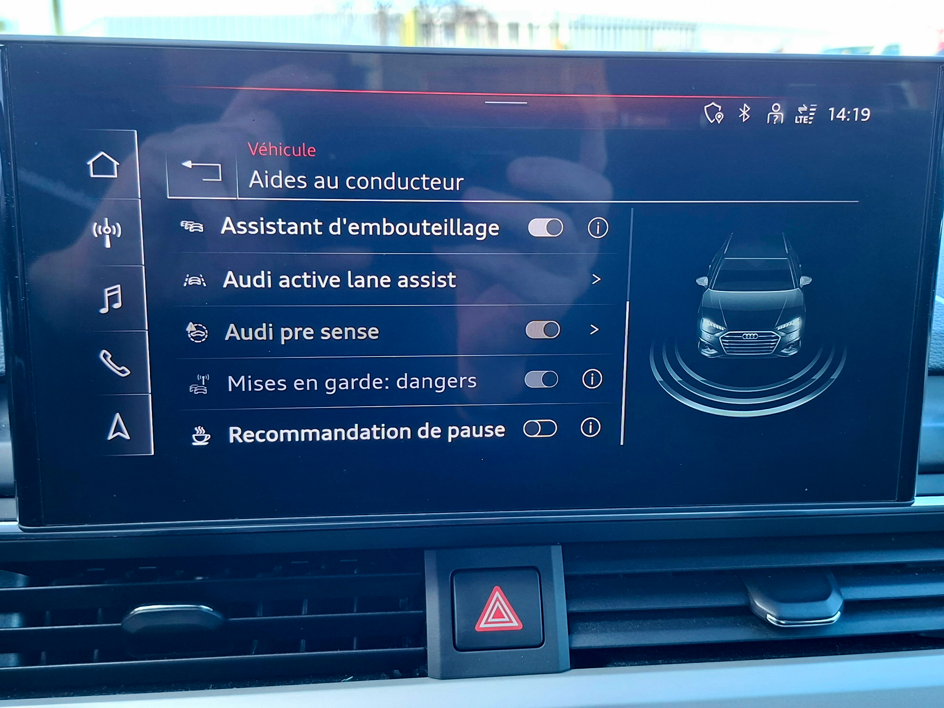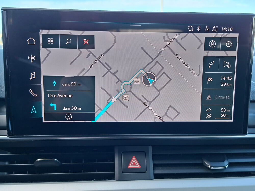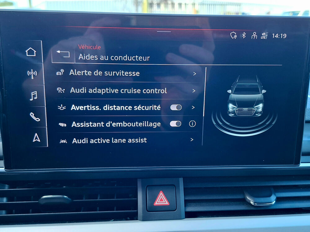 Equipements supplémentaires : Accoudoir central confort AV avec inclinaison reglable et coulissant en longueur, Affichage de controle de pression des pneus, Airbags grand volume conducteur et passager AV, Airbags lateraux a l'AV et systeme d'airbags de tete, Antipatinage ASR pour une motricite optimale, empeche le patinage des roues motrices, Appel d'urgence et service Audi connect avec commande du vehicule, Applications decoratives en Aluminium brosse mat, Appui lombaire a 4 axes pour les sieges AV: reglages electrique, horizontal et vertical, Audi Connect avec carte SIM integree (e-SIM) et licence d'utilisation pour 3 ans, Audi Drive Select, Audi Parking System Plus, Audi Pre Sense city, Audi smartphone interface (Apple CarPlay ou Google Android Auto), Audi Sound System, Audi Virtual cockpit plus, Baguette enjoliveuse AR en argent aluminium mat, Becquet de pavillon S, Blocage electronique de differentiel EDS, Cables de recharge pour telephone portable, compatibles iPhone et Android, Calandre specifique S line laquee en noir titane, Camera de recul, Camera multifonction, Ceintures de securite, automatiques a 3 points pour tous les sieges, controle de port de ceinture AV, Chassis : pour une bonne dynamique de conduite couplee a un confort de conduite souverain, Chassis Sport, Ciel de pavillon en tissu noir, Climatisation automatique confort 3 zones, Coffre a ouverture et fermeture electriques, Colonne de direction de securite, Commande de desactivation de l'airbag passager AV, Controle electronique de stabilisation (ESC), Detecteur de pluie et de luminosite, Diffuseur AR specifique S line en noir titane mat, Direction assistee electromecanique, Dossier de banquette AR rabattable en 3 parties 40 : 20 : 40 ou completement, Ecrous de roues antivol, Embleme S-Line sur les ailes AV, Extensions de bas de caisse couleur carrosserie, Feux AR a LED, Filet de separation vertical amovible, Finition exterieure S Line, Fixation pour sieges enfants ISOFIX et Top Tether pour les places AR exterieures, Frein de stationnement electromecanique, Grilles dentree dair laterales en noir mat graine avec insert en argent aluminium mat, Identification du modele selon le nouveau marquage de puissance, Interface Bluetooth, Keyless Go: demarrage et arret du moteur par touche moteur Start/Stop sur la console centrale, Limitation de la vitesse maximale a 210 km/h, Miroirs de courtoisie eclaires, Moulures de seuil avec insert en aluminium AV, eclairees, avec inscription S, Navigation MMI plus avec MMI touch, Pack Brillance, Pack Eclairage ambiance, Pack Rangement et Coffre, Pare-chocs S, Pare-soleil cotes conducteur et passager AV, Pedalier et repose-pieds en acier inoxydable, Phares a LED, avec clignotants AR a LED dynamiques, Phares AV a LED (feux de croisement, feux de route, feux diurnes et feux de position LED,, Plancher de chargement reversible, Pneus a roulage optimise (faible resistance au roulement), 245/40 R 18 - Vmax = 210 km/h, Preparation pour crochet d'attelage, Preparation pour l'activation de la fonction de navigation, Prise 12 V dans le coffre, Protection antidemarrage electronique, Rampes de pavillon en Aluminium poli, Reception radio numerique (DAB), Recommandation de repos, Recuperation, Regulateur de vitesse, Retroviseur interieur sans encadrement jour/nuit automatique, Retroviseurs exterieurs avec feux clignotants a LED integres et dans la teinte du vehicule, Retroviseurs exterieurs reglables et escamotables electriquement, jour/nuit automatique, degivrants, S tronic, boite sequentielle 7 vitesses a double embrayage avec commande electrohydraulique, Securite enfants, Sellerie Combinaison Cuir/Sequence S line, Sieges AV Sport, Surfaces daccentuation facon verre en noir, Tapis complementaires AV/AR, Tire Mobility System, Trousse de secours avec triangle de presignalisation, Vide-poches dans les contre-portes a l'AV et a l'AR, Vitres athermiques, Volant Sport contour en cuir style 3 branches a meplat avec multifonctions plus.