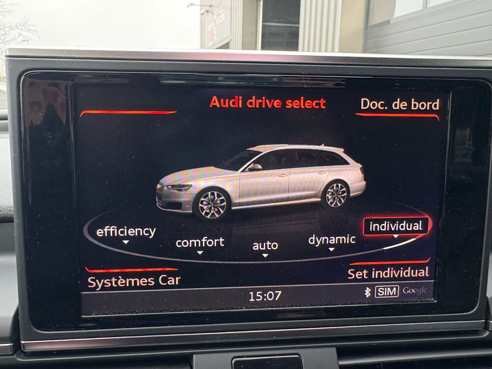 AUDI A6 AVANT 2 0 TDI ultra 190 S Tronic 7 Ambition Luxe// Accoudoir arrière Accoudoir avant Airbag conducteur Airbag latéral conducteur et passager Airbag passager Antidémarrage Appuie-tête arrière Assistance de freinage Banquette/sièges arrière rabattable Cache bagages Climatisation automatique Climatisation automatique 4 zones ou plus Contrôle de traction Contrôle pression pneus (RDC) Différentiel à glissement limité automatique Double vitrage Détecteur pluie ESP (programme de stabilité électronique) Essuie glace arrière Feux arrière LED Feux automatiques Fixation pour siège enfant GPS Garnitures intérieures métal Hayon électrique Installation téléphone mains libres Interface Bluetooth Lecteur CD Lecteur MP3 Levier de vitesses en cuir Lève-vitres arrière électriques Lève-vitres avant électriques Ordinateur de bord Peinture laquée / opaque Phares antibrouillard Plafonnier à extinction automatique Radar de stationnement arrière Radar de stationnement avant Régulateur de vitesse Rétroviseur conducteur réglable électriquement Rétroviseur intérieur électrochrome Rétroviseur passager réglable électriquement Rétroviseurs extérieurs rabattable électriquement Siège conducteur chauffant Siège conducteur réglable éléctriquement Siège conducteur à réglage lombaire Siège passager chauffant Siège passager réglable éléctriquement Siège passager à réglage lombaire Sièges chauffants Sièges en cuir Système anti bloquage (ABS) Système de freinage d'urgence urbain Système de navigation à commande vocale Sélection du mode de conduite Verrouillage centralisé télécommandé Vitre arrière chauffante Volant multifonctions